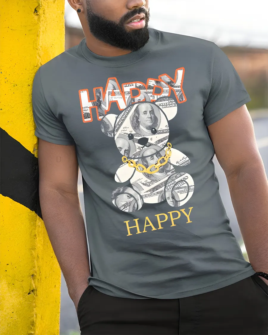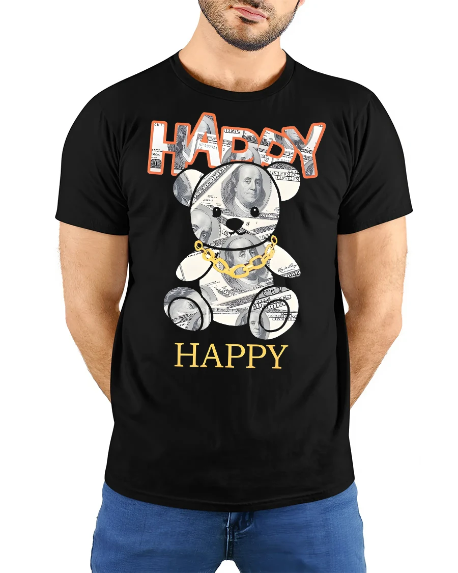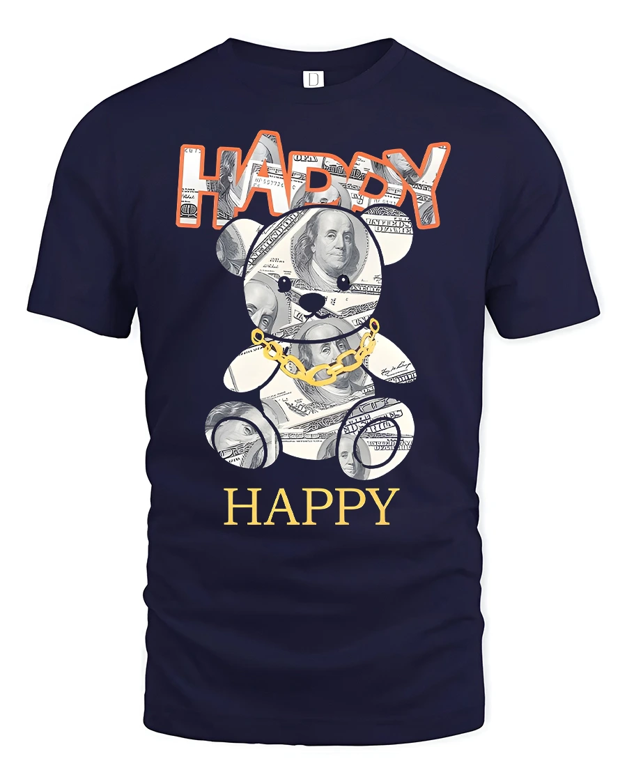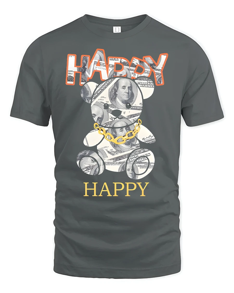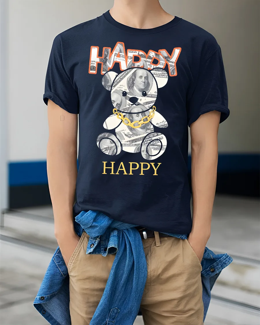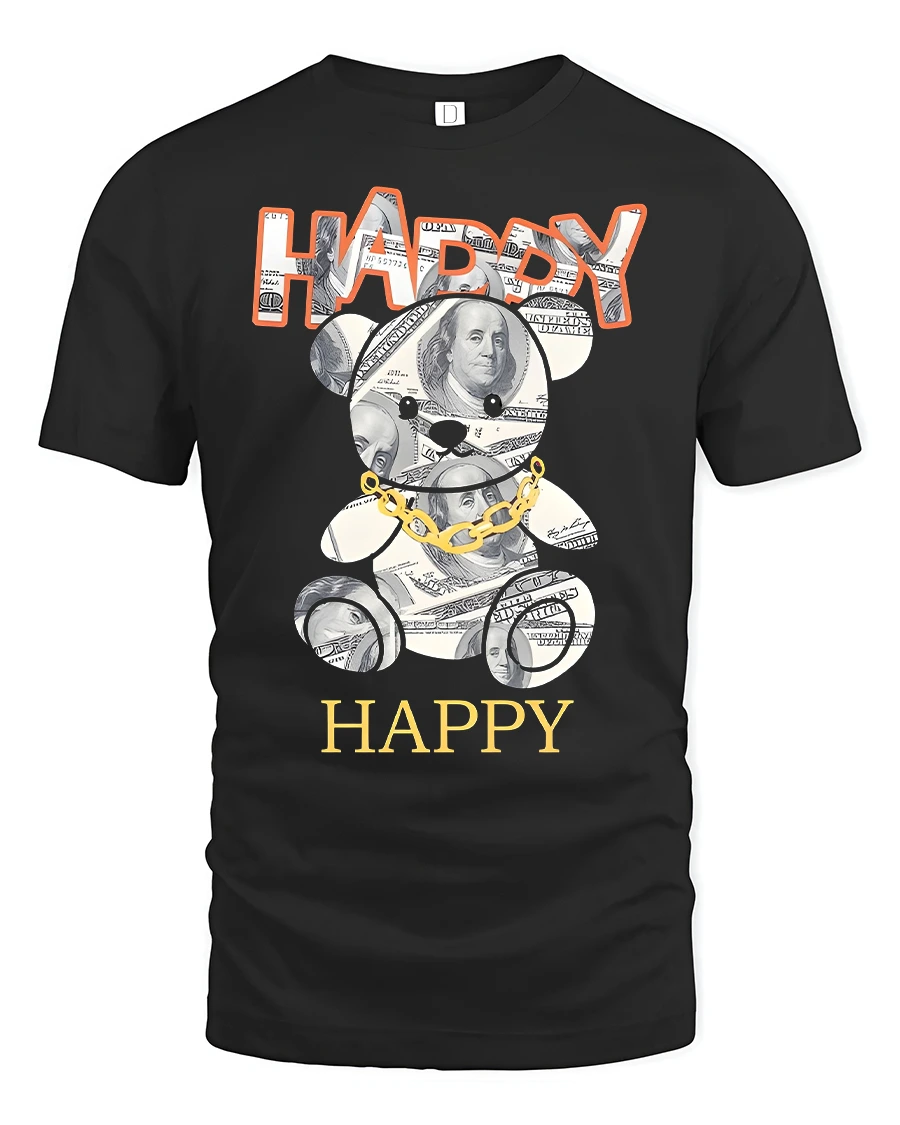 Happy Money Bear Graphic Streetwear T-Shirt is a bold and stylish piece that combines fun design with urban fashion vibes. Featuring a bear made from dollar bill prints and highlighted with gold chain details, this tee instantly adds a unique, eye-catching look to your wardrobe. The “Happy” lettering adds a playful yet confident edge, making this design perfect for anyone who loves mixing humor with high-end style.