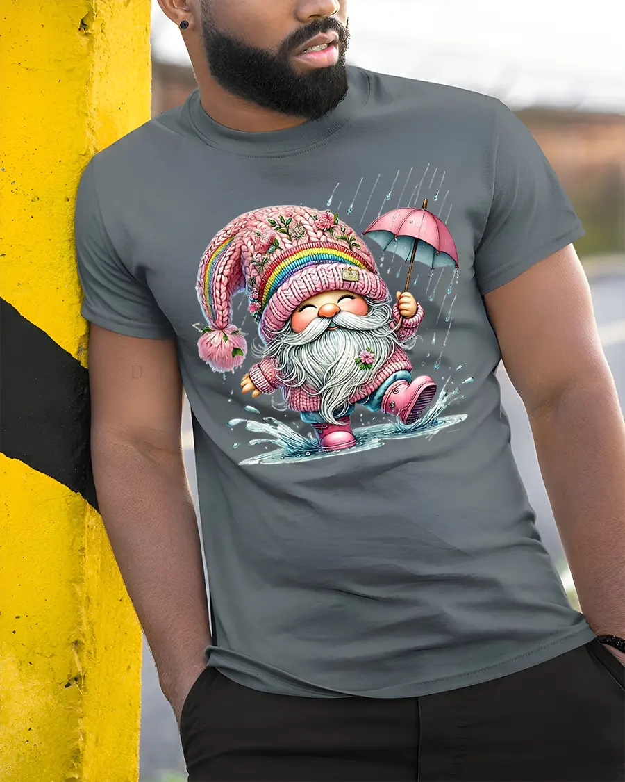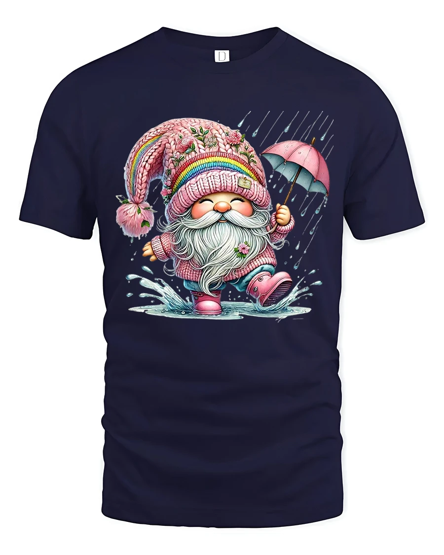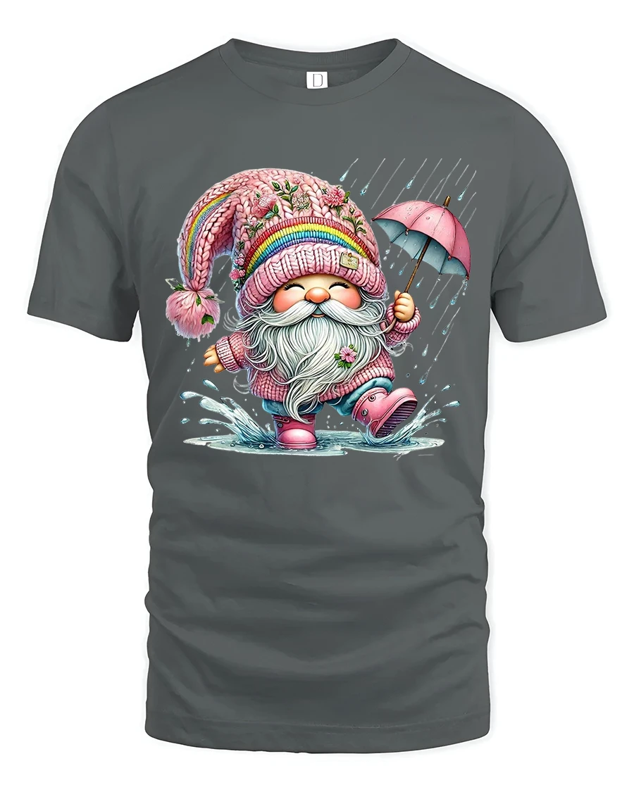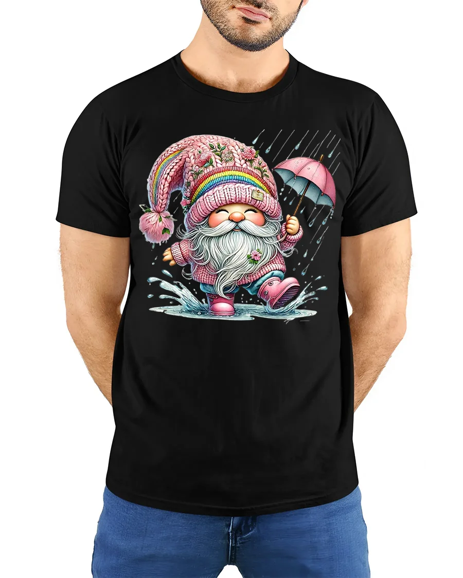 Happy Rainy Day Gnome Umbrella Cartoon Graphic Tee makes a delightful gift choice with year round appeal.
