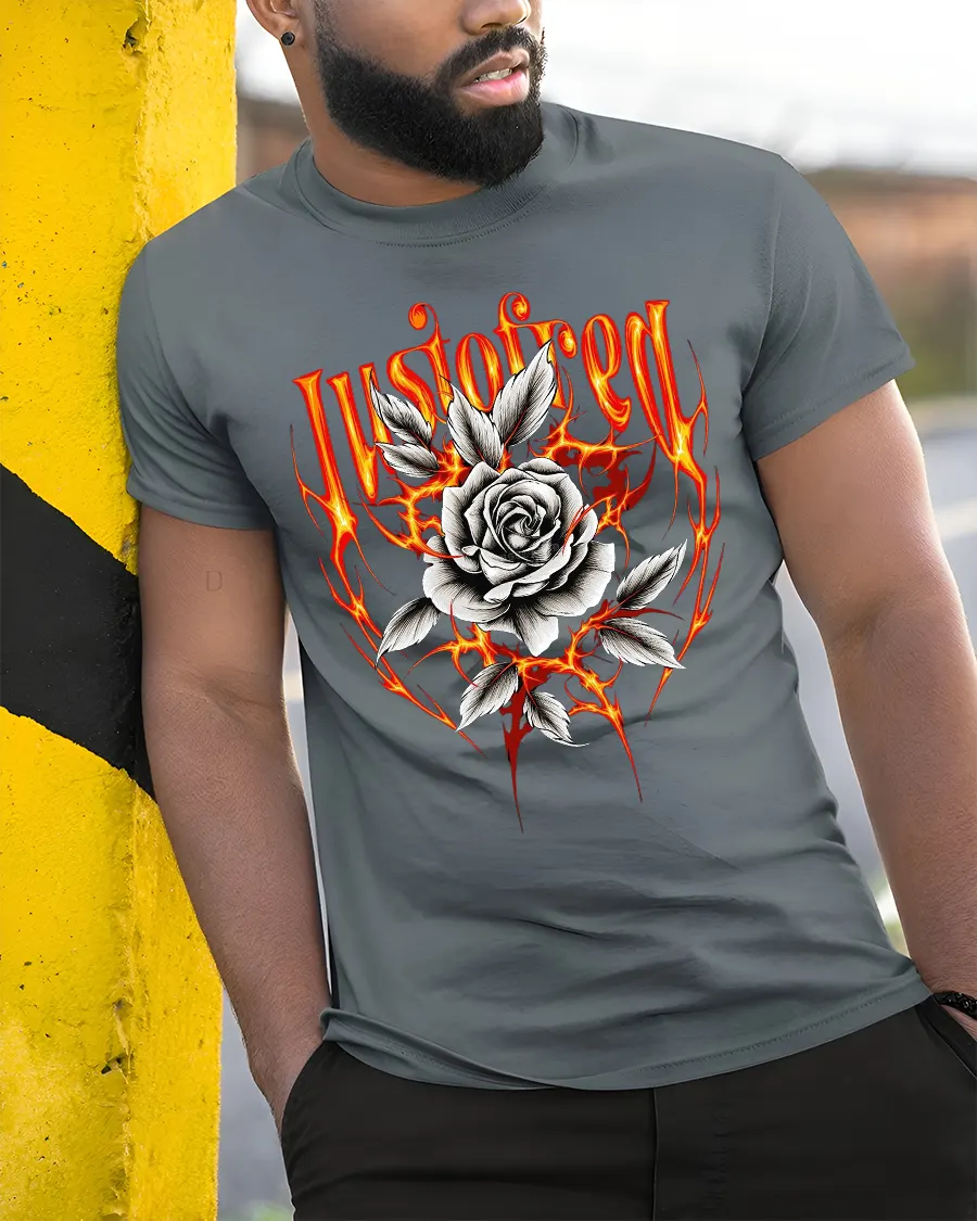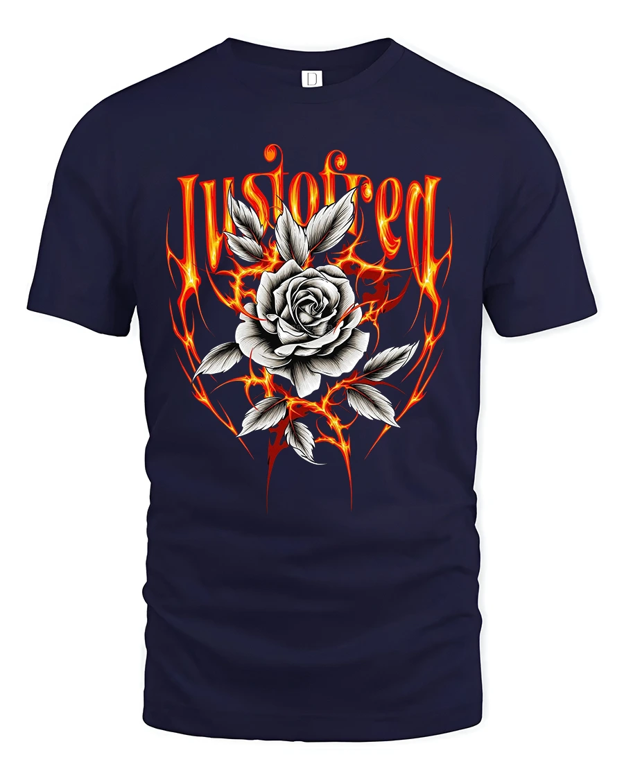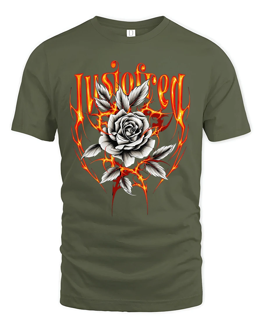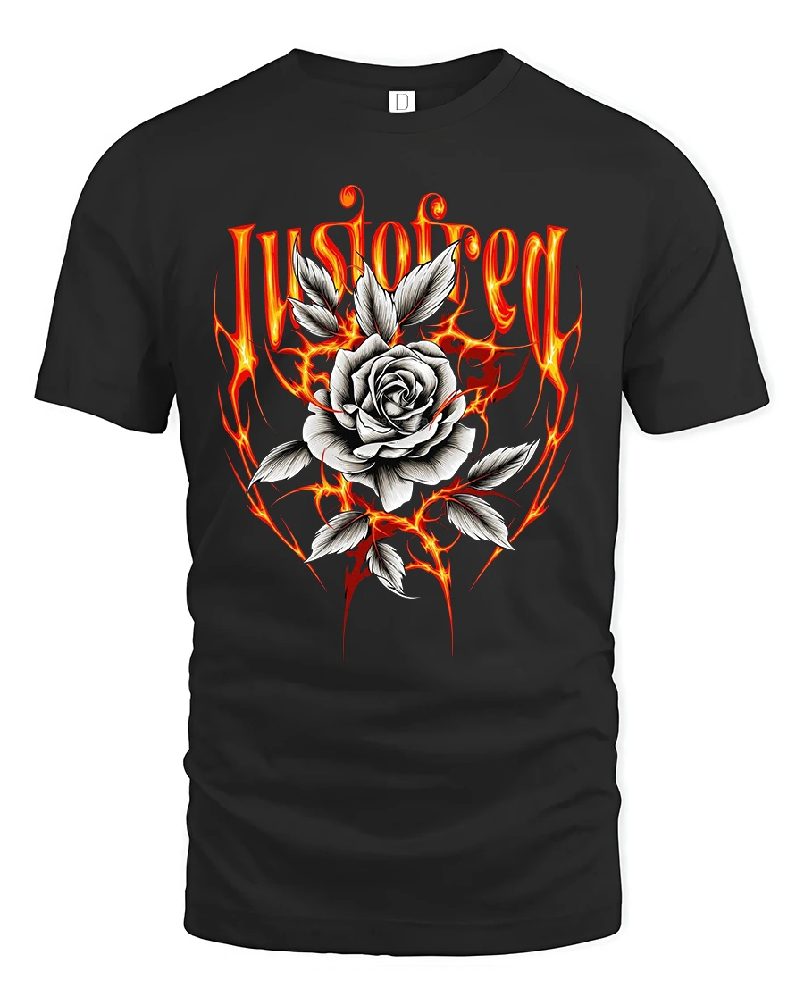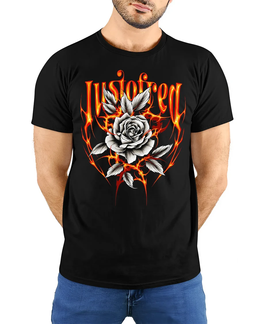 The Justified Flaming Rose Bold Gothic Graphic T-Shirt is a powerful blend of gothic style and fiery intensity. Featuring a detailed white rose surrounded by blazing flames and bold lettering, this tee captures strength, rebellion, and edgy streetwear energy. The contrast between the delicate rose and the fierce fire makes it a striking design that stands out from the crowd.