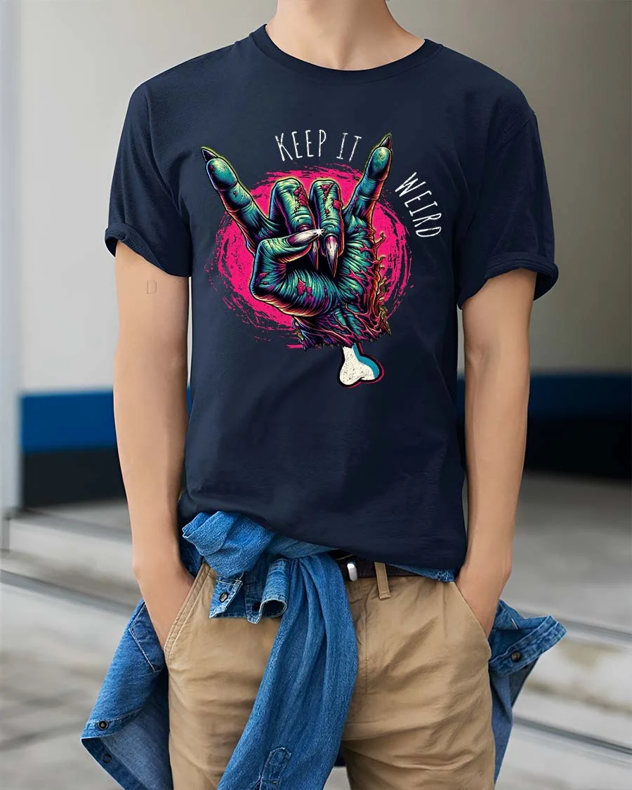 Keep It Weird Zombie Hand Rock Gesture Graphic T Shirt delivers a bold and edgy design perfect for those who embrace individuality.