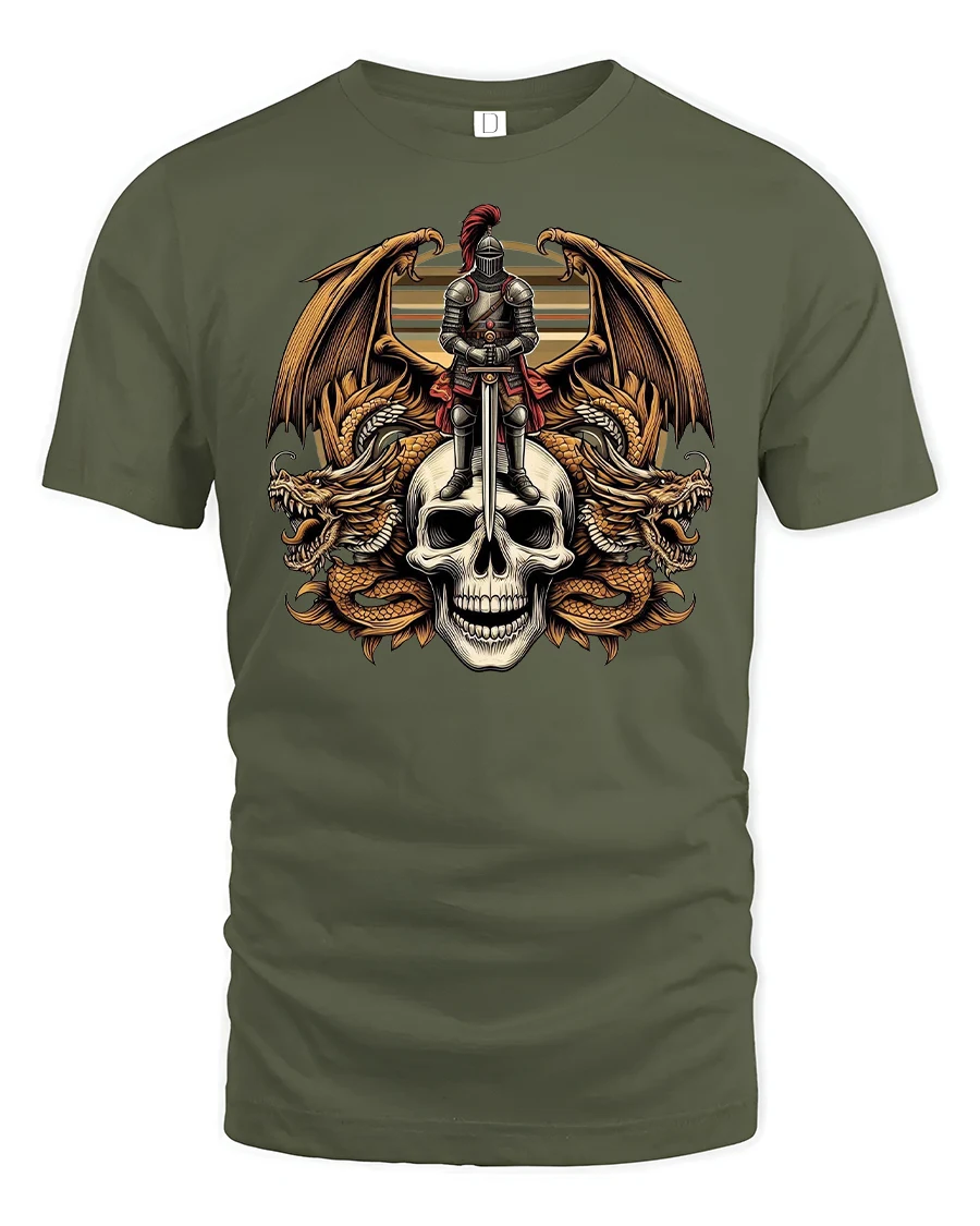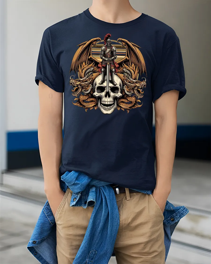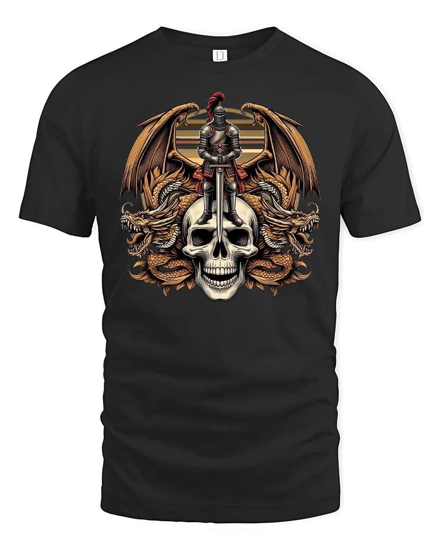 Featuring a powerful armored knight standing atop a skull surrounded by fiery dragons, this tee captures strength, courage, and honor in every detail.