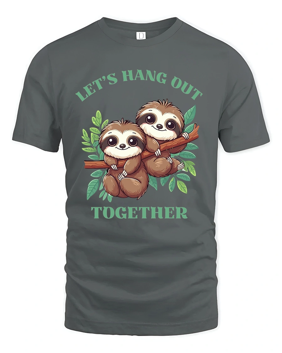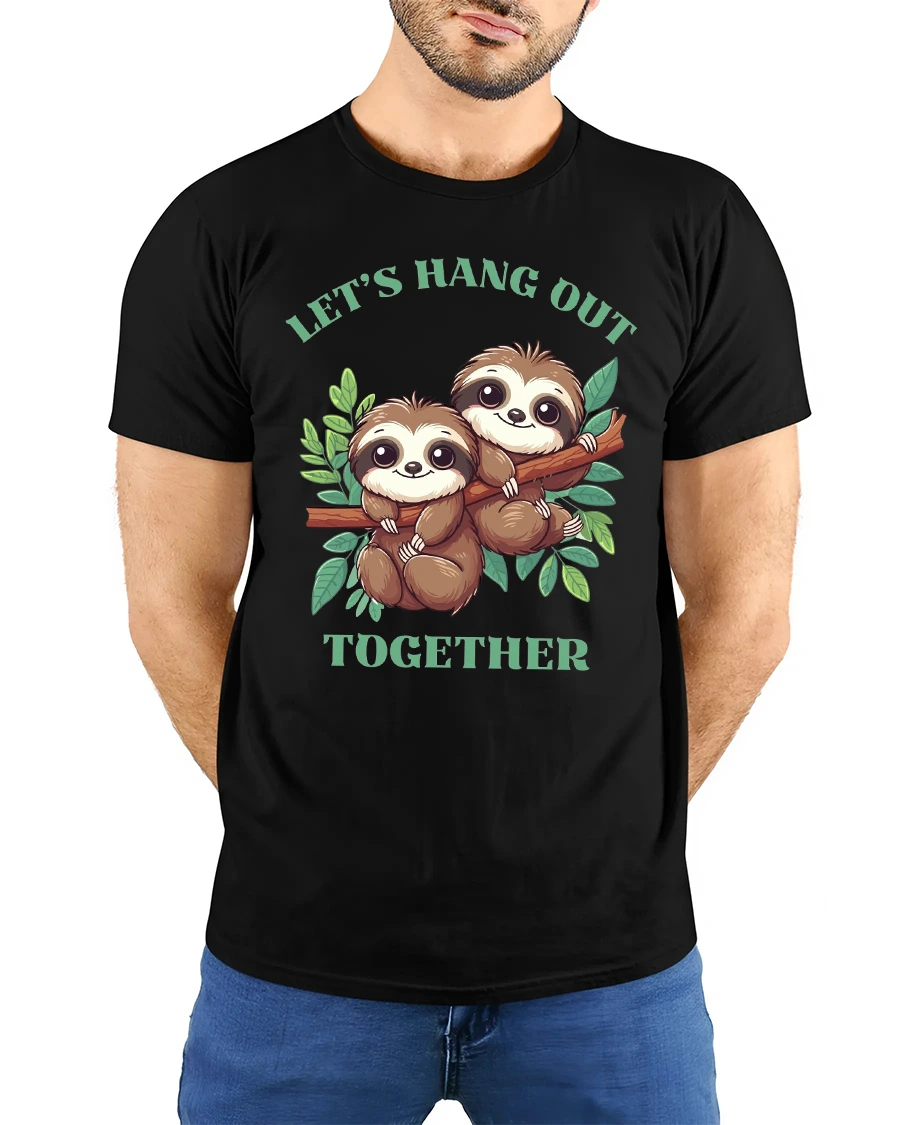 Lets Hang Out Together Cute Sloth Friends Graphic Tee Shirt brings a warm and cheerful feeling through its adorable illustration and playful message.