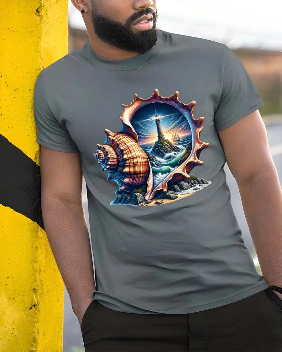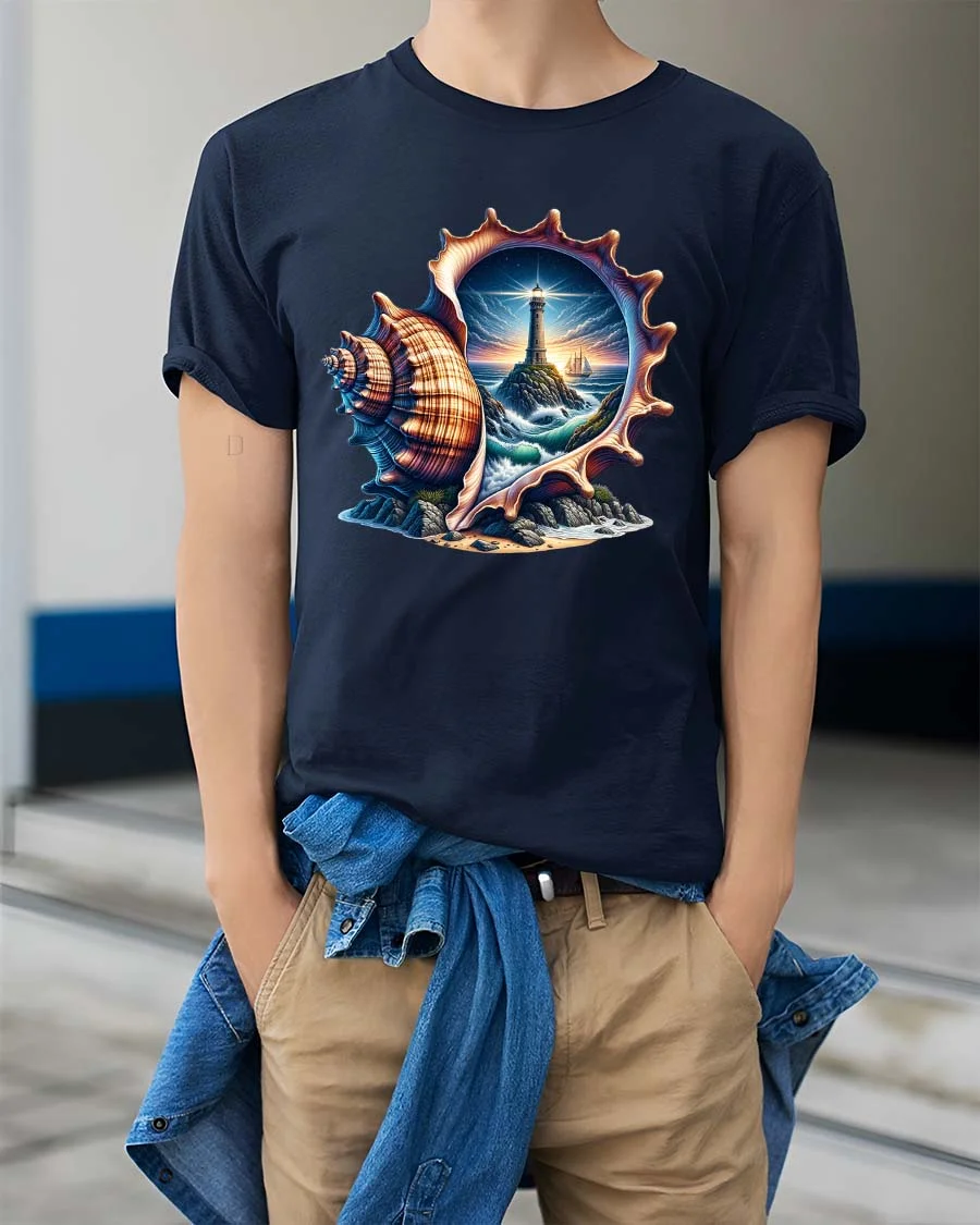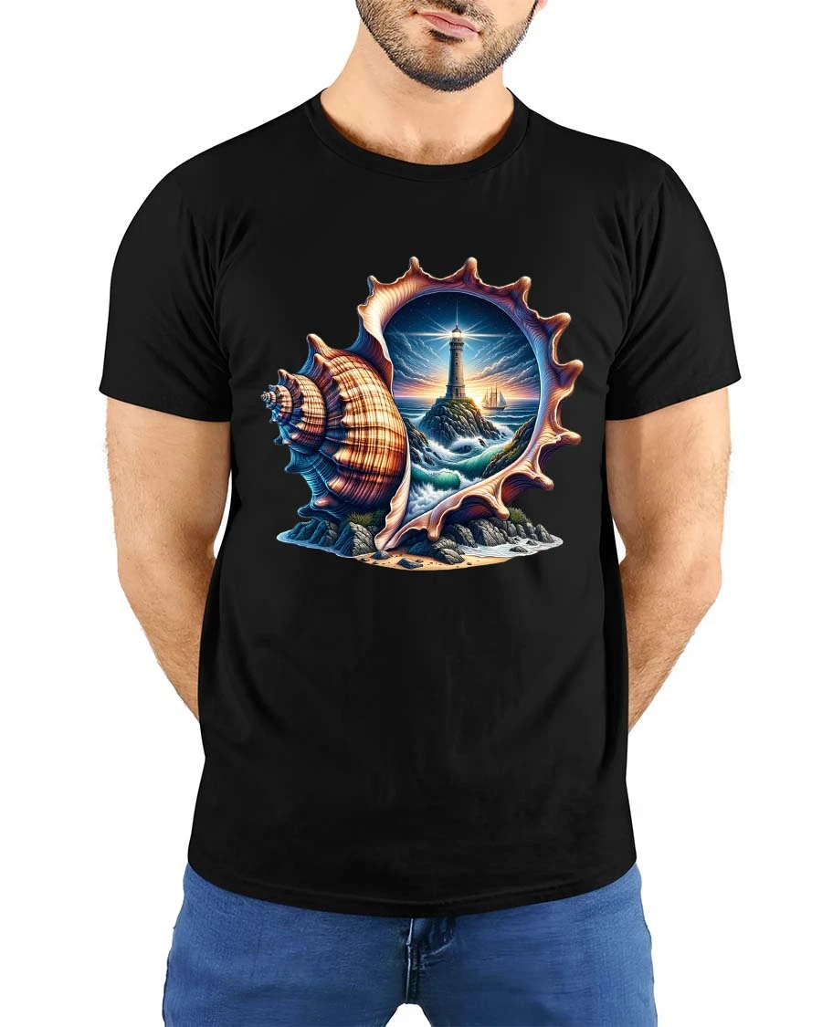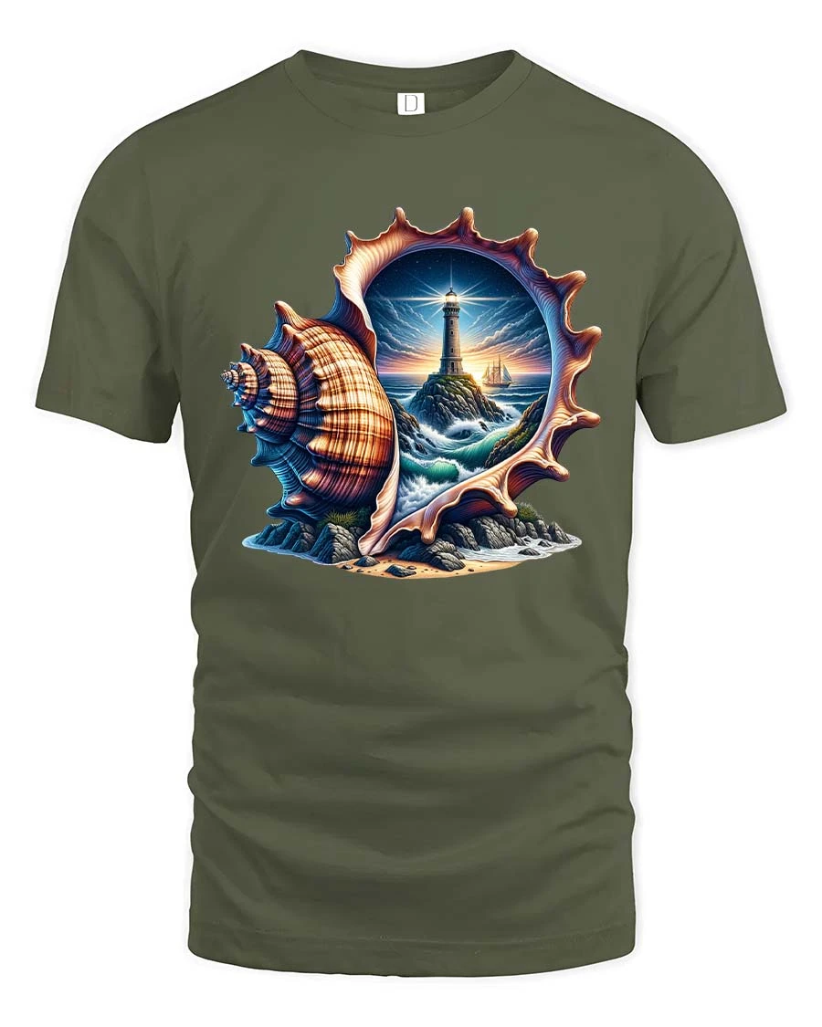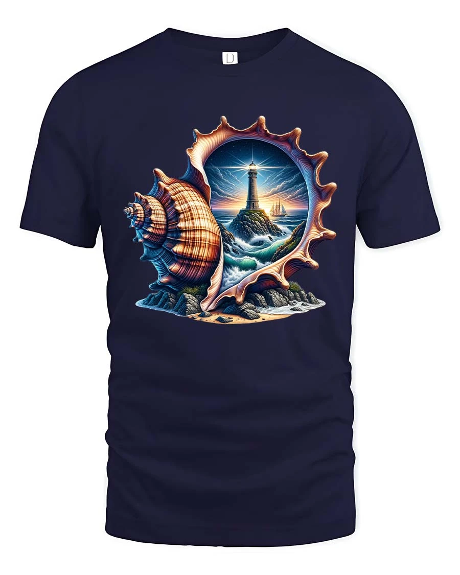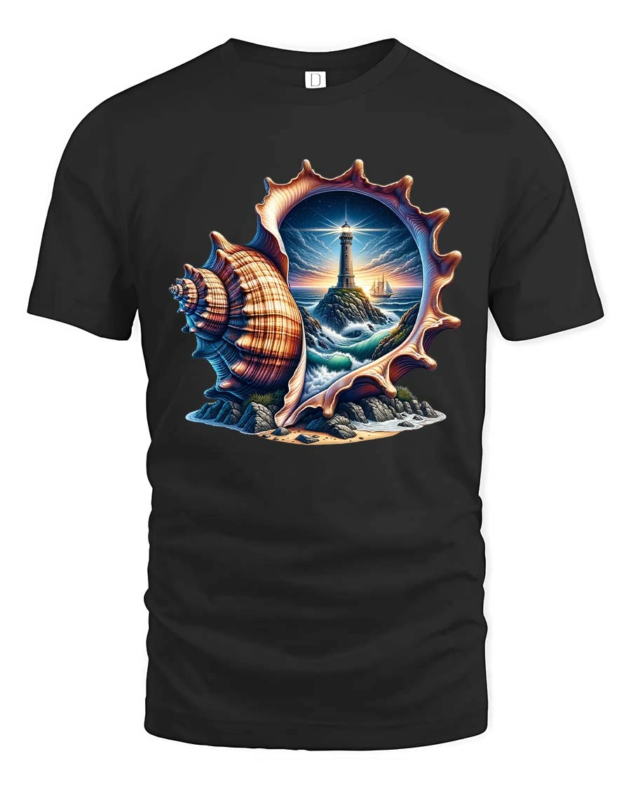Lighthouse Seashell Tshirt Ocean Coastal Scenic Art Graphic captures the beauty of the sea with a stunning and imaginative coastal design.