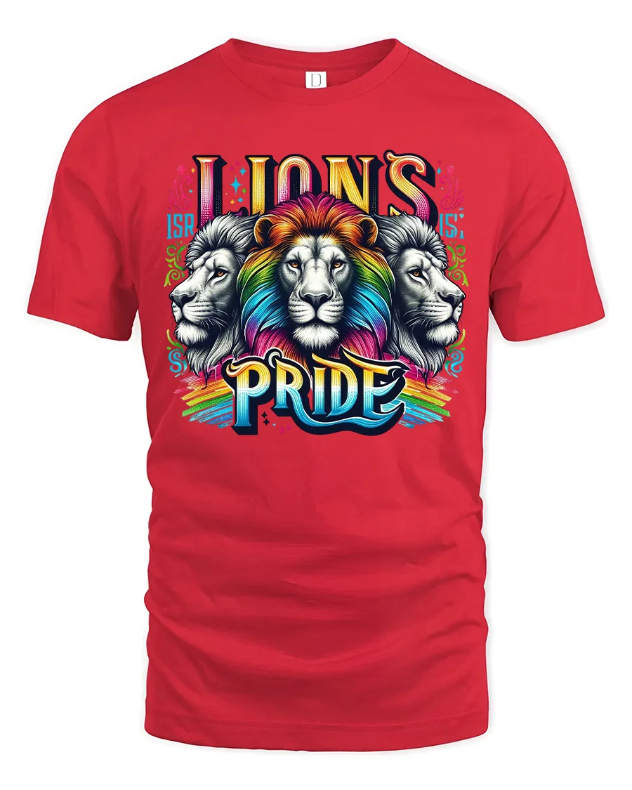 This striking design features three majestic lions with a vibrant rainbow mane symbolizing unity strength and fearless pride.