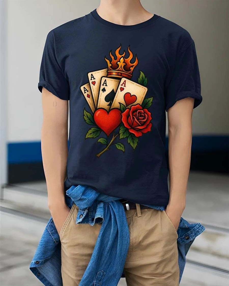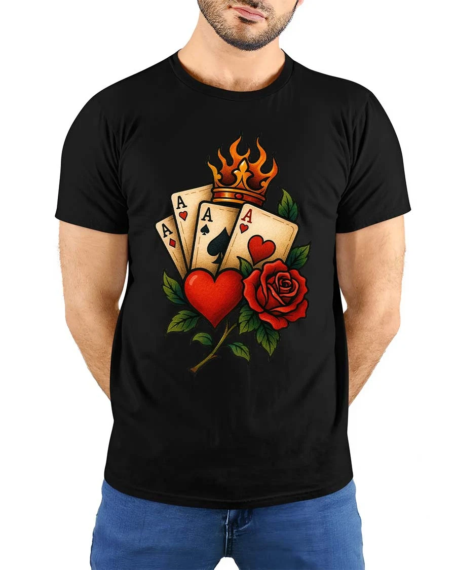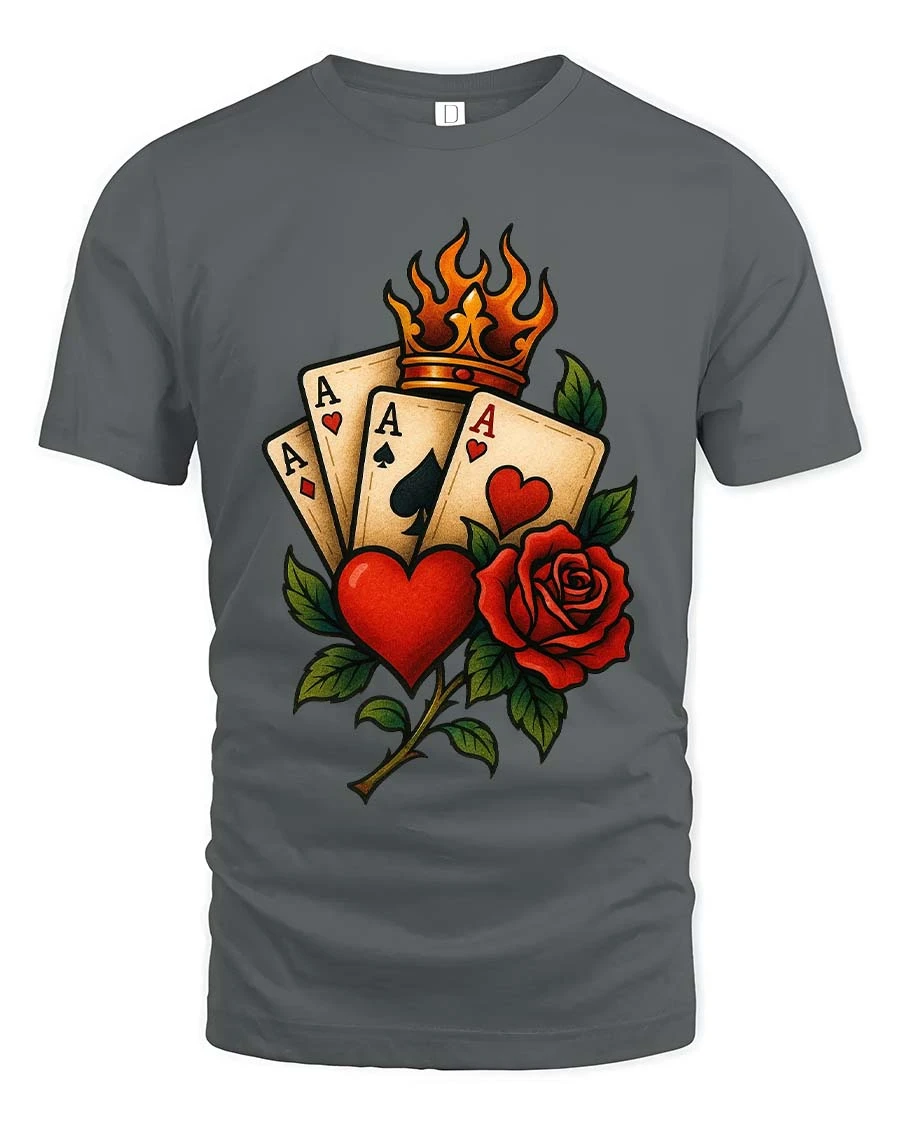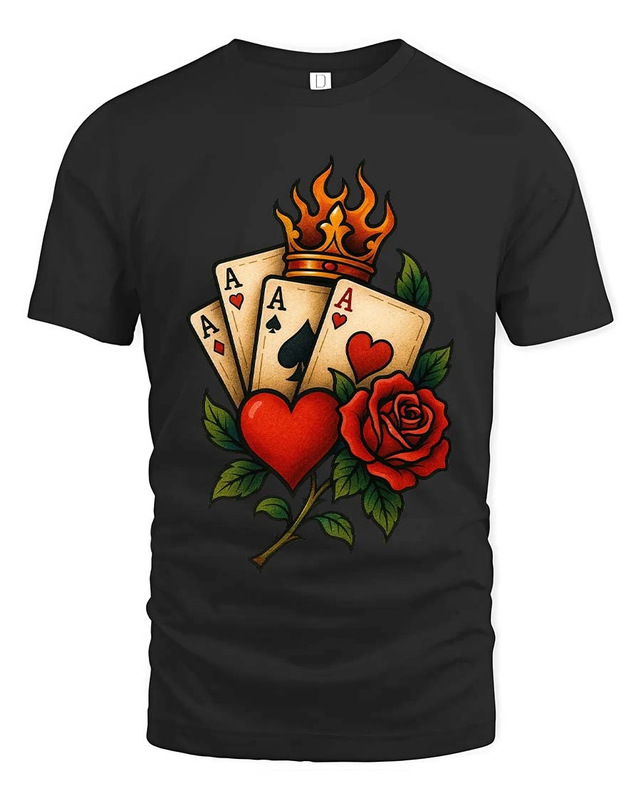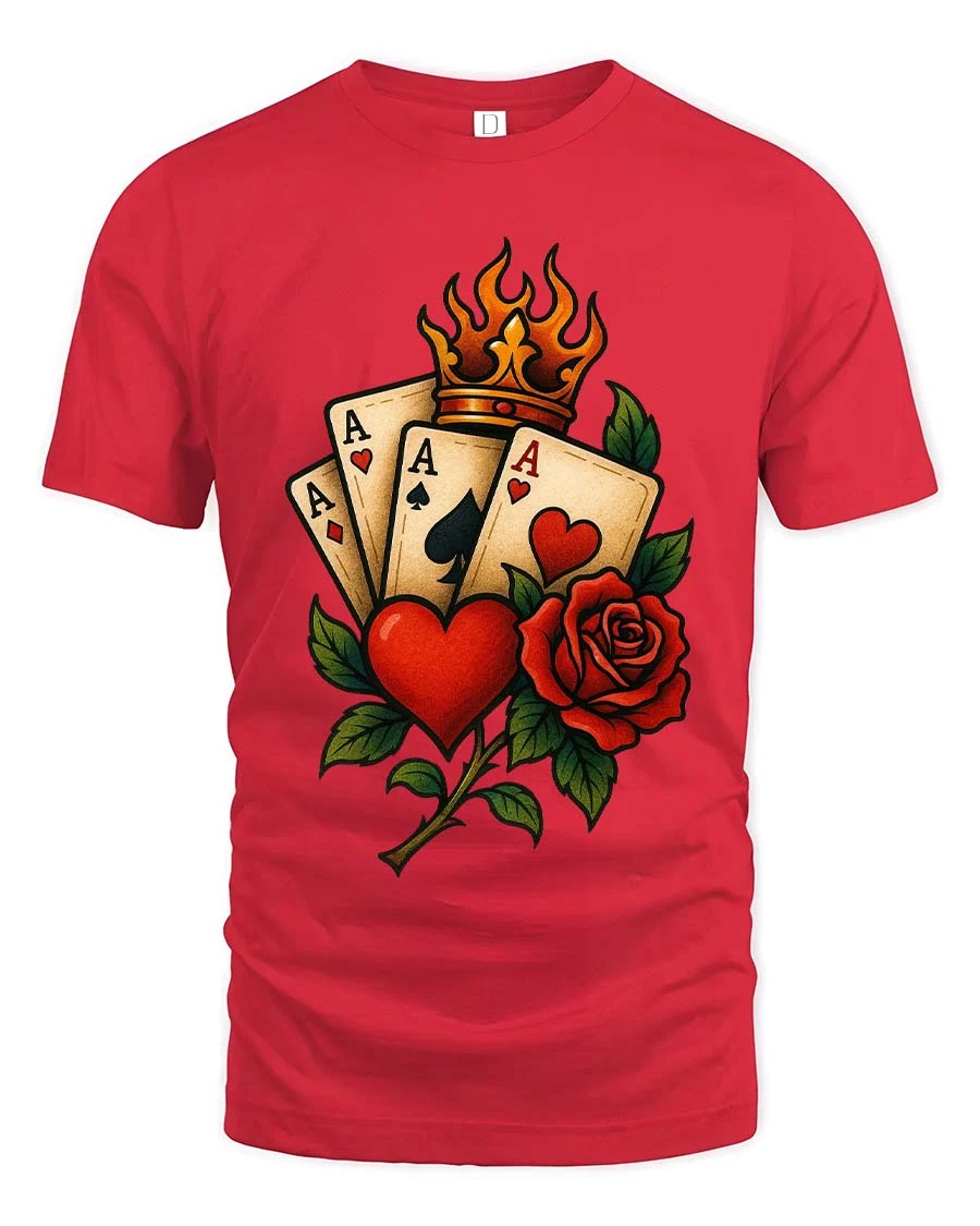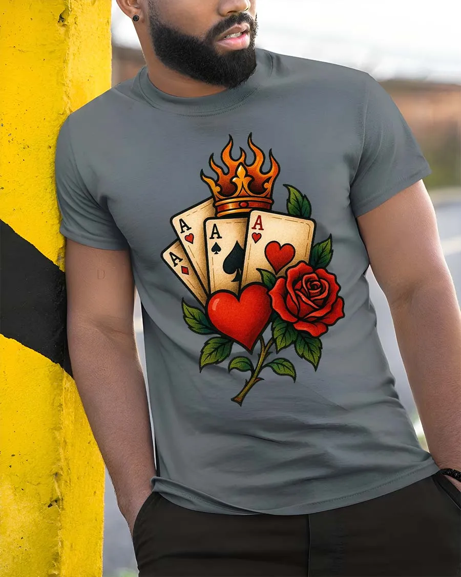 Lucky Ace Cards Heart Rose Crown Classic Style tshirt combines iconic playing card symbolism with romantic rose artwork and a bold royal crown element.