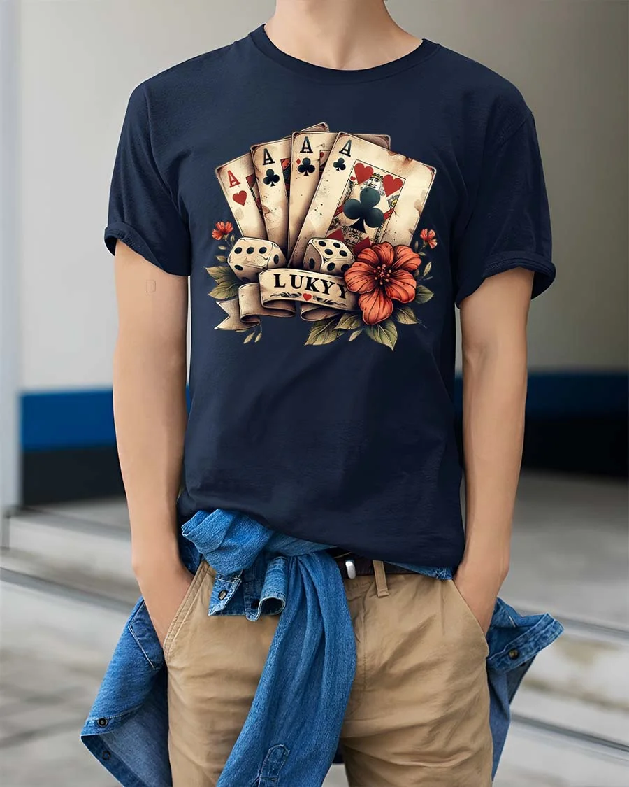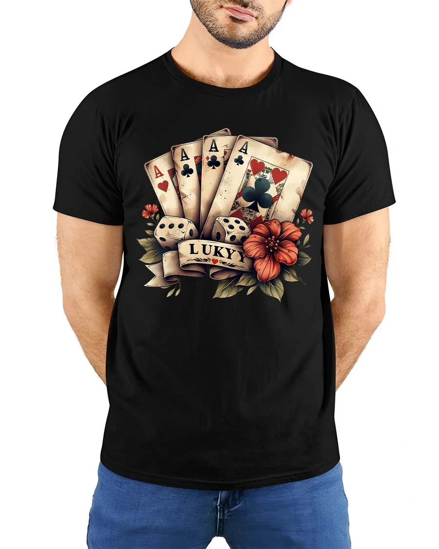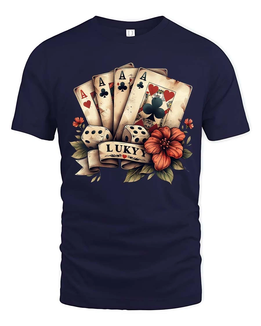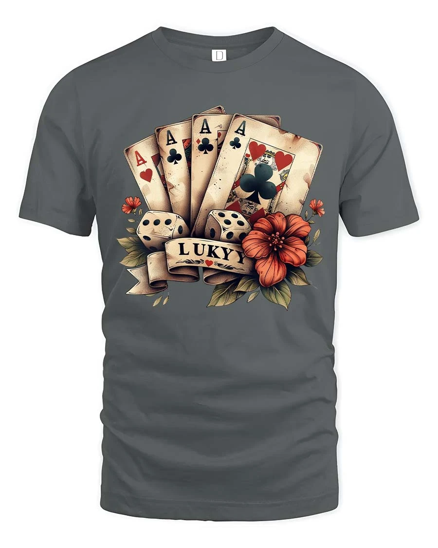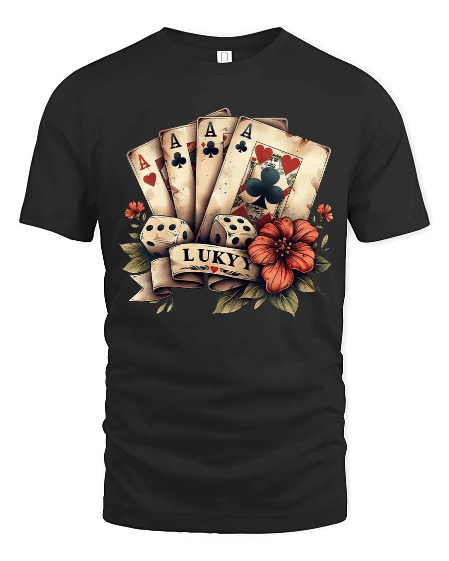 Lucky Poker Cards Dice Floral Graphic T Shirt Vintage Style brings together classic casino elements with artistic flair in a bold and timeless design.