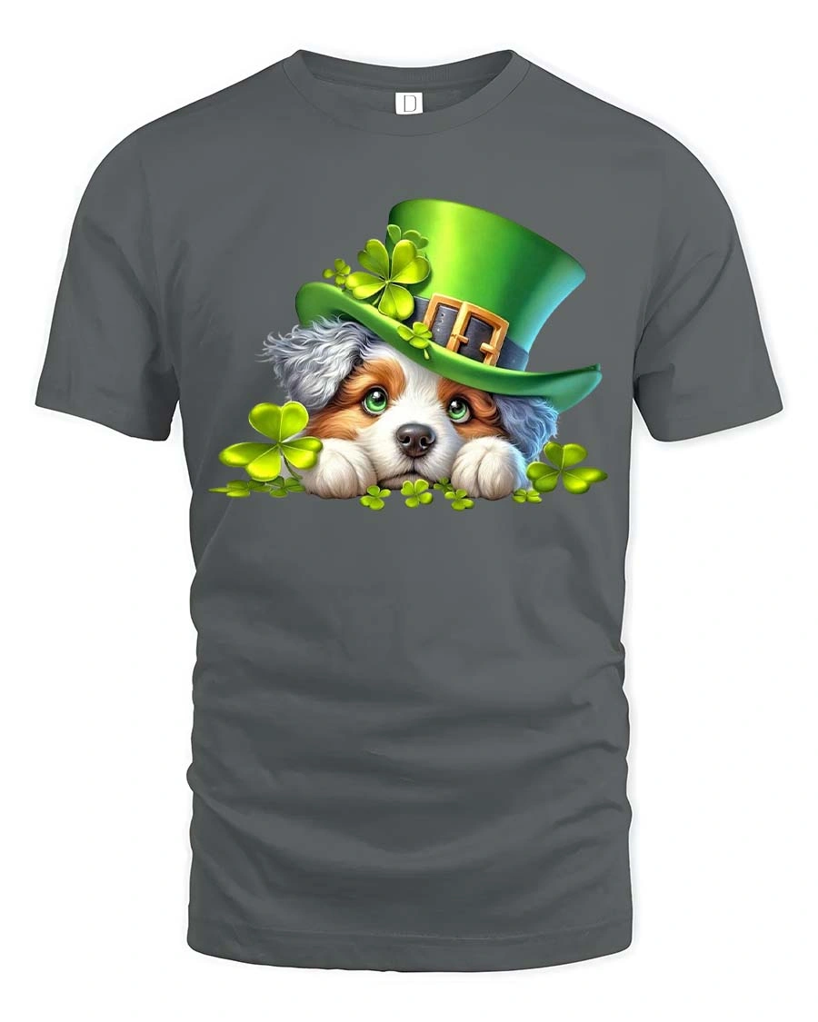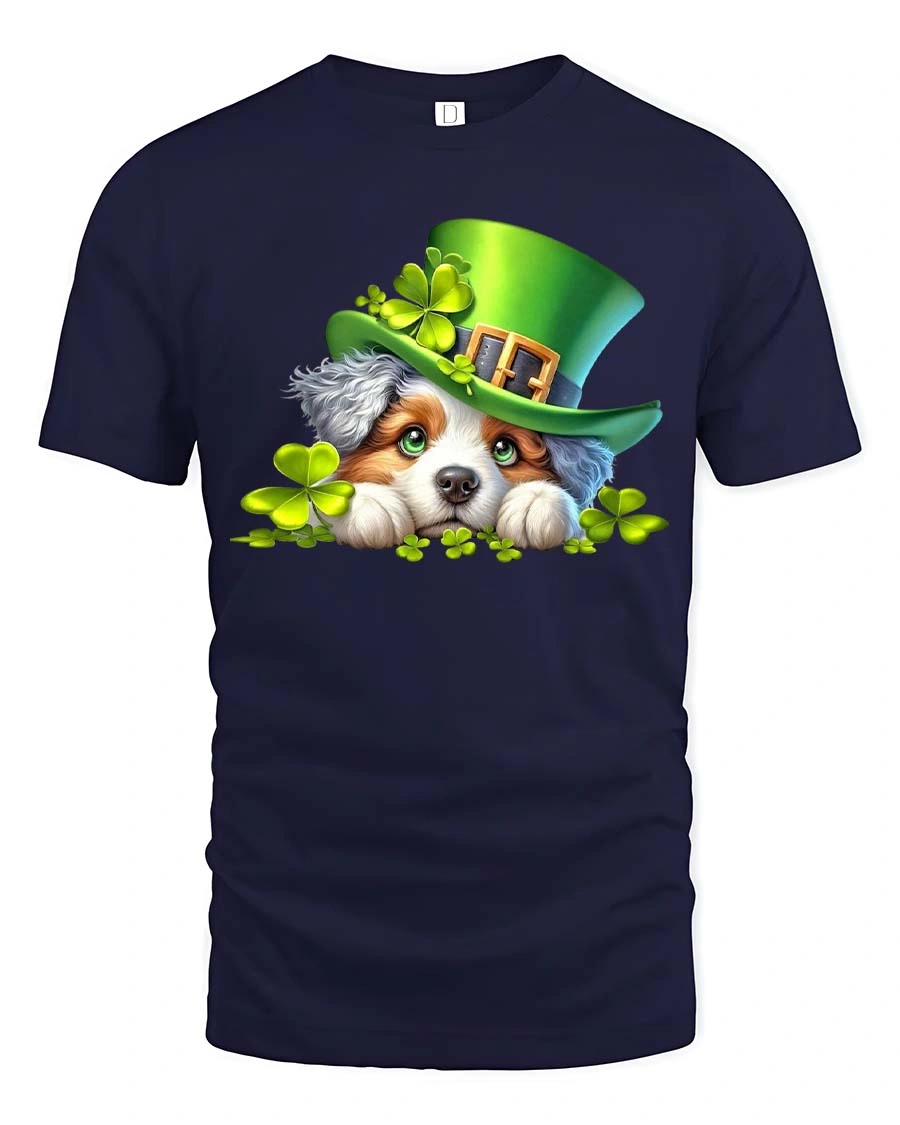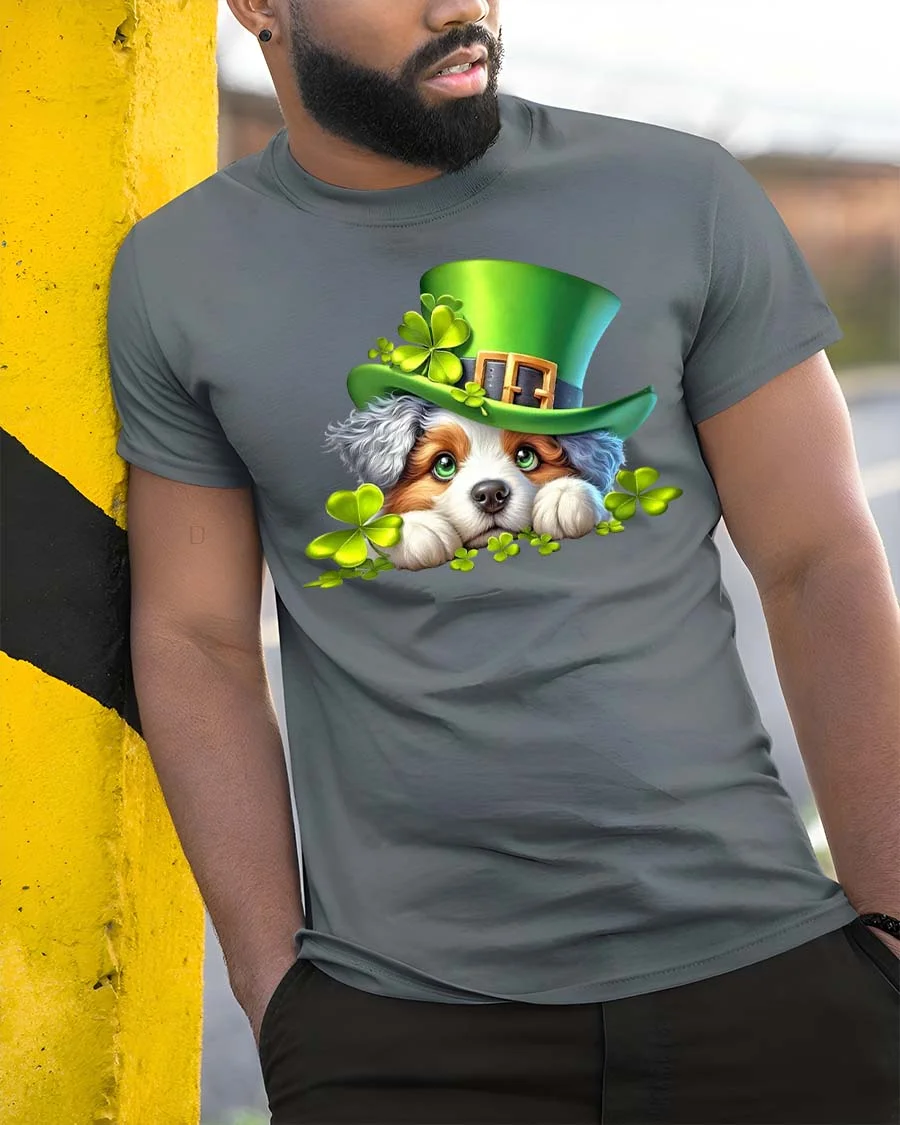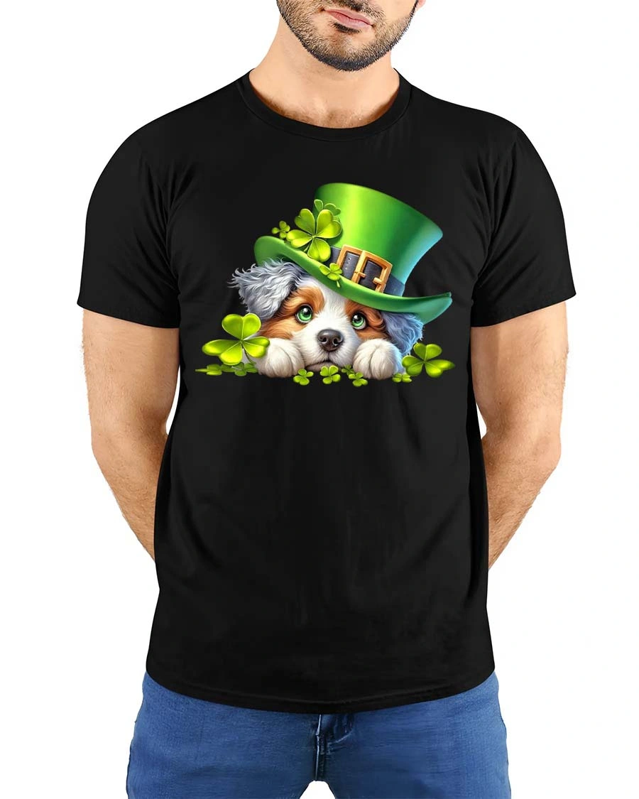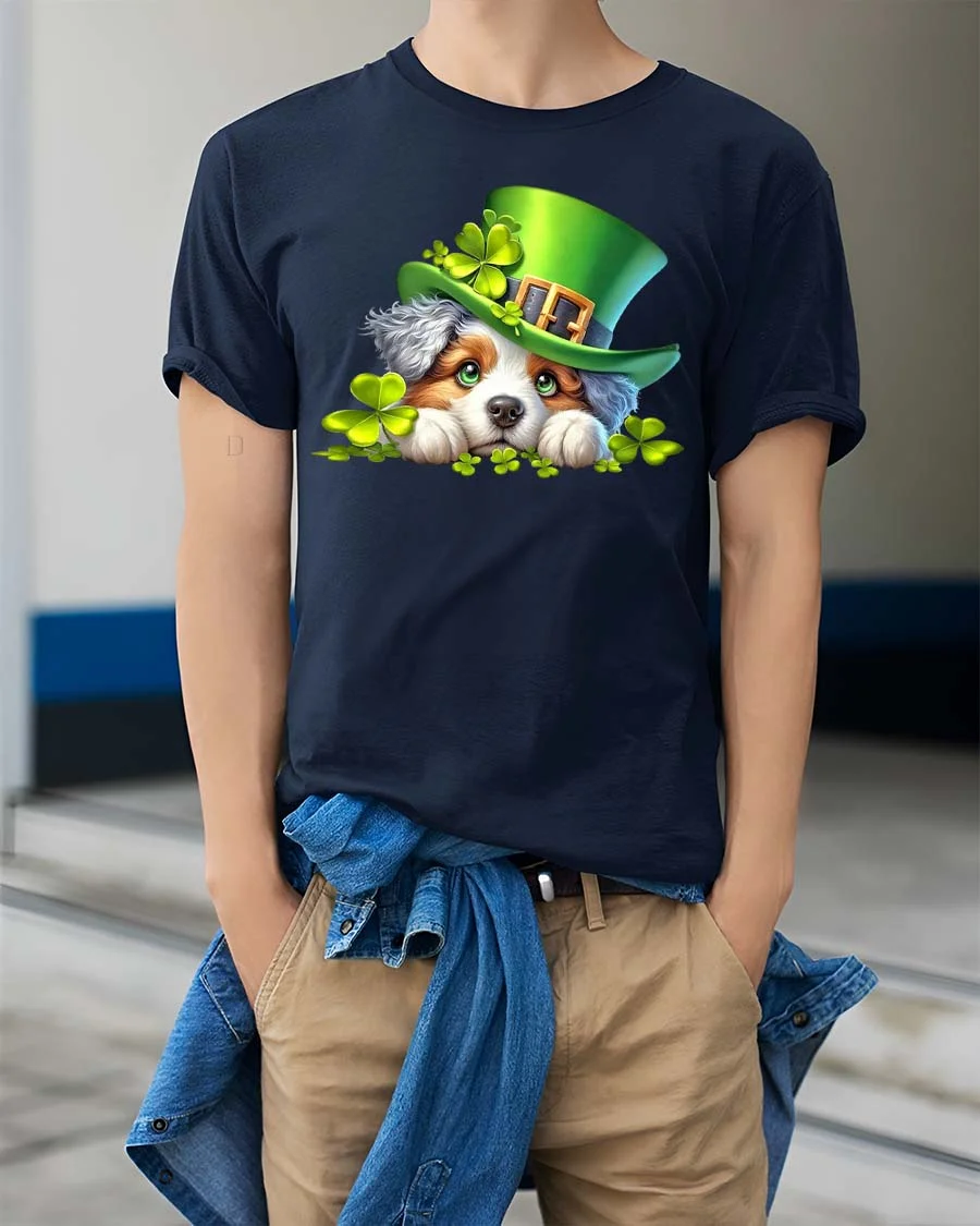 This cute puppy graphic tshirt blends charming animal style with lucky shamrock symbolism that many people love during festive seasons.