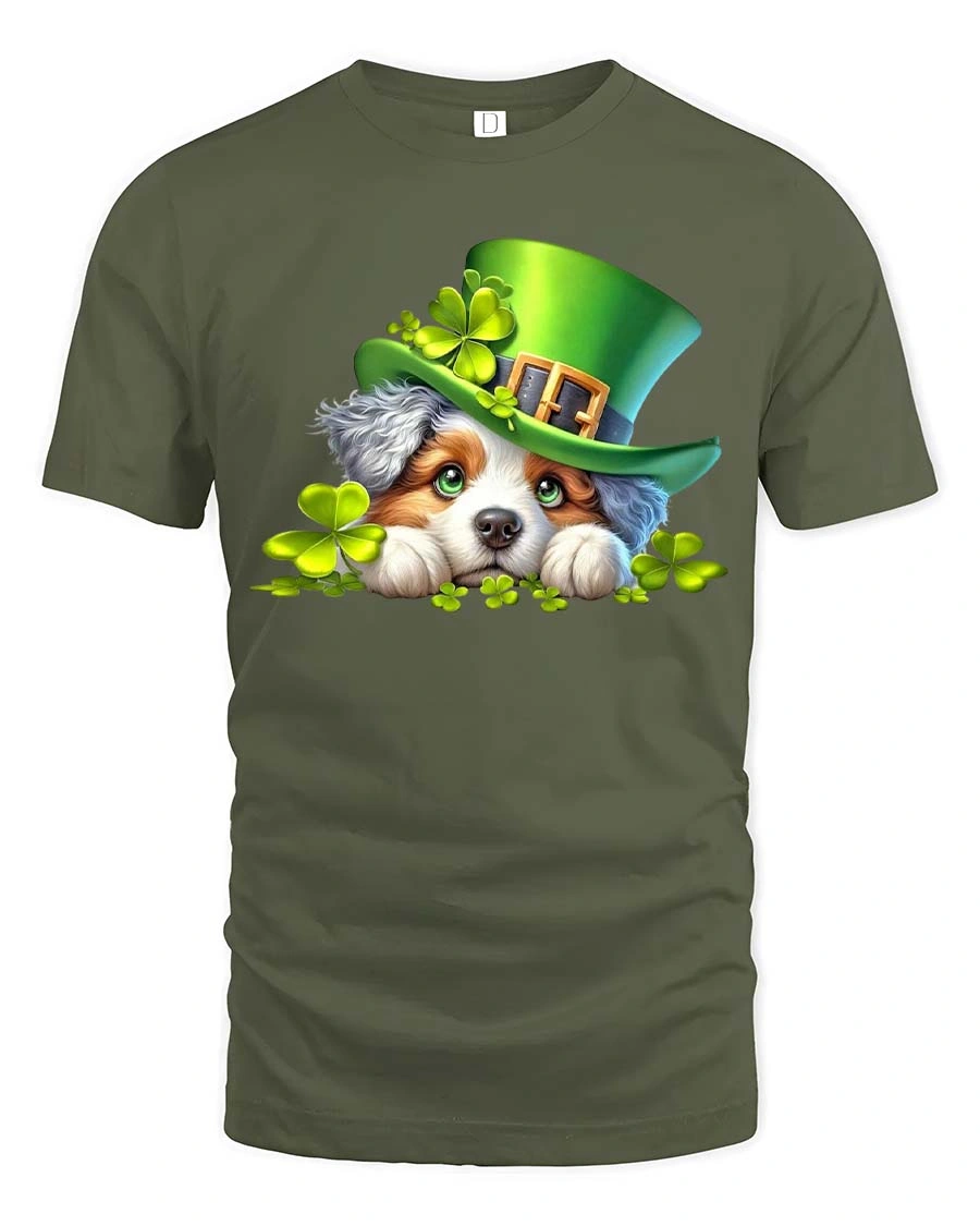 Lucky Puppy Shamrock Magic Cute Irish Style tshirt brings cheerful festive charm with an adorable puppy wearing a magical green hat surrounded by lucky clovers.