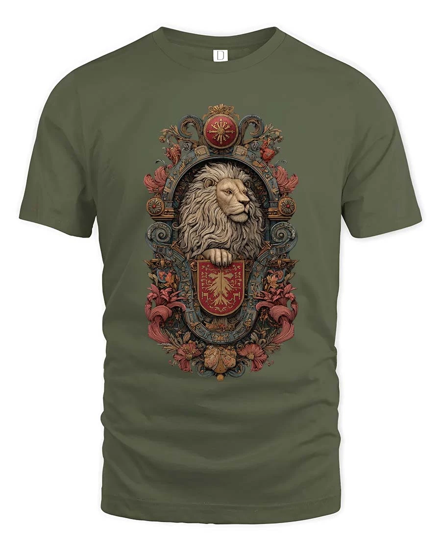 Majestic Heraldic Lion Crest Vintage Royal Graphic Tee captures the powerful elegance of classic heraldry with a beautifully detailed lion emblem design.