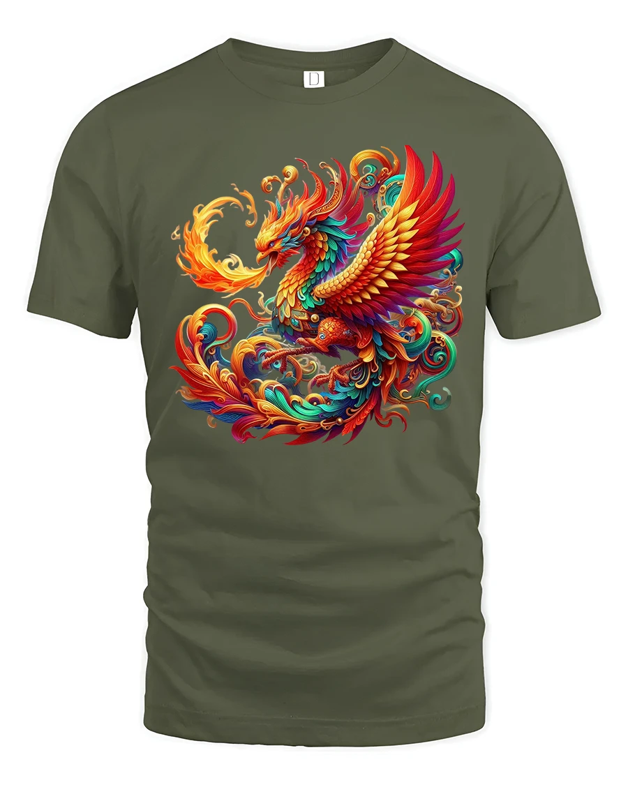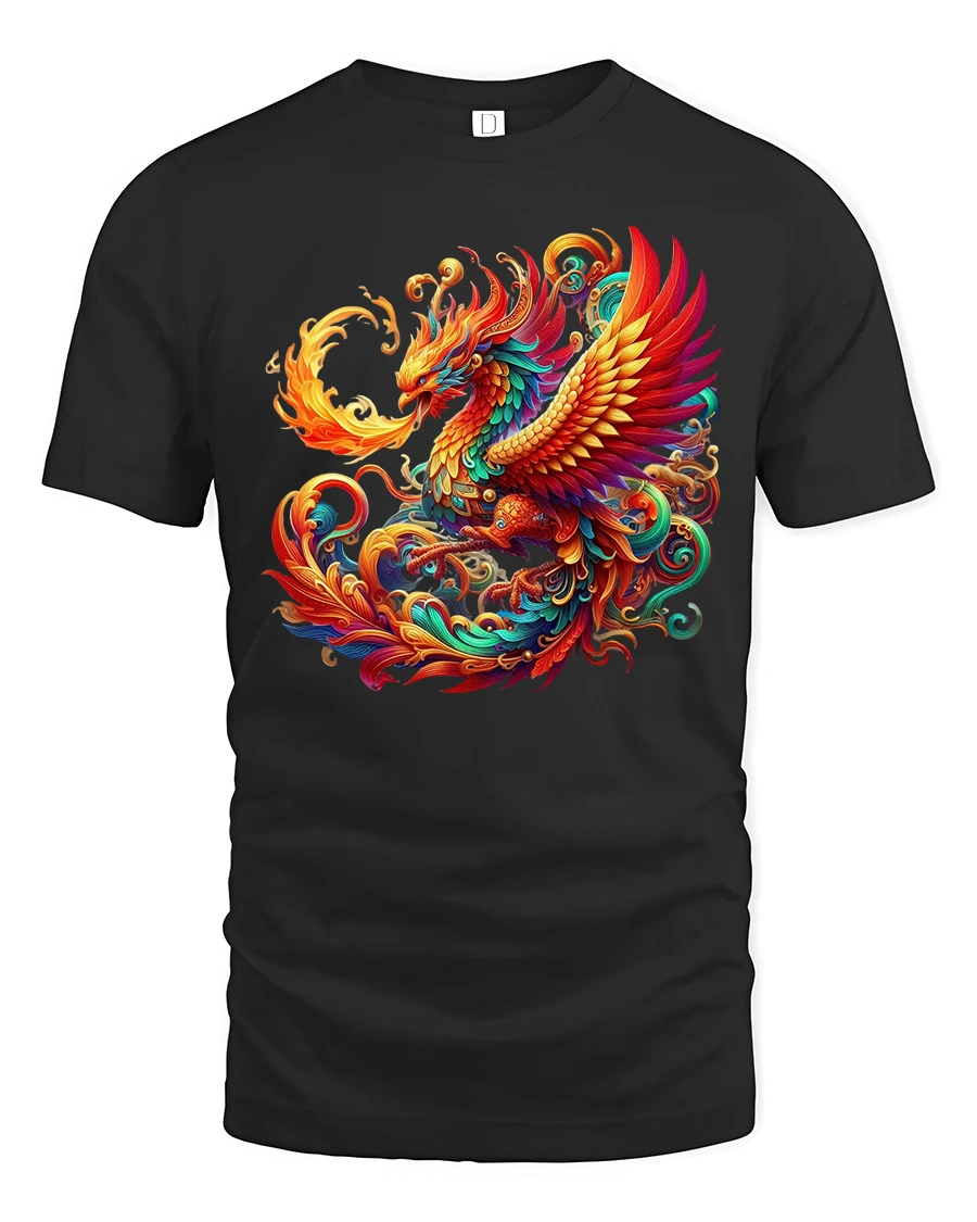 Majestic Phoenix Fire Art Illustration Vibrant Graphic Tee Shirt delivers a powerful visual statement inspired by the legendary phoenix rising in brilliant color and motion. The design showcases flowing flames, radiant feathers, and swirling energy that symbolize rebirth, strength, and transformation. Every detail is carefully illustrated to create a dynamic centerpiece that instantly captures attention and elevates any casual outfit.