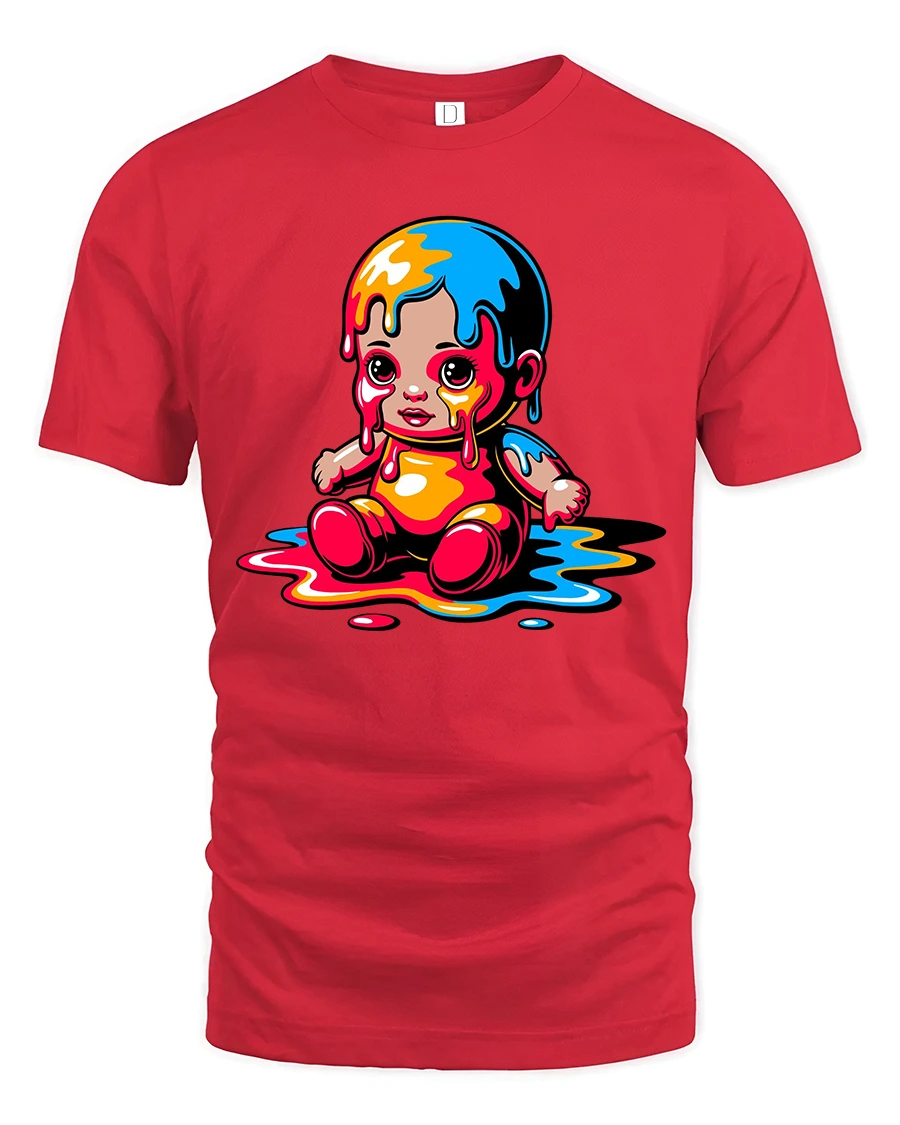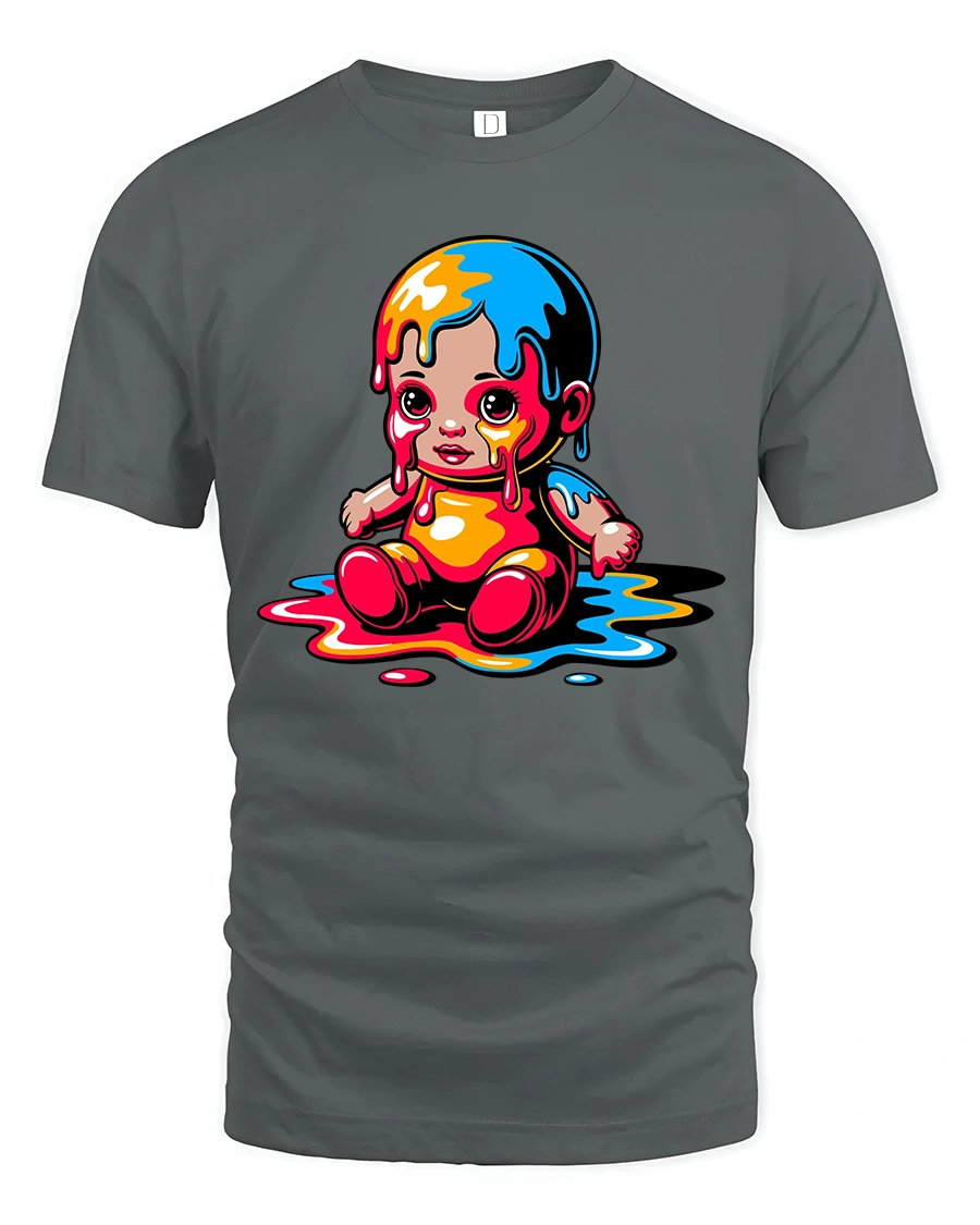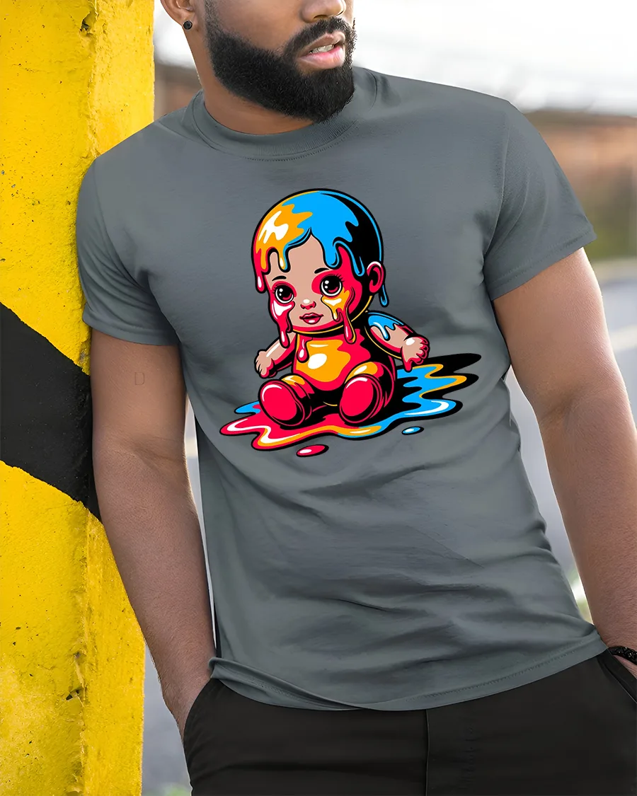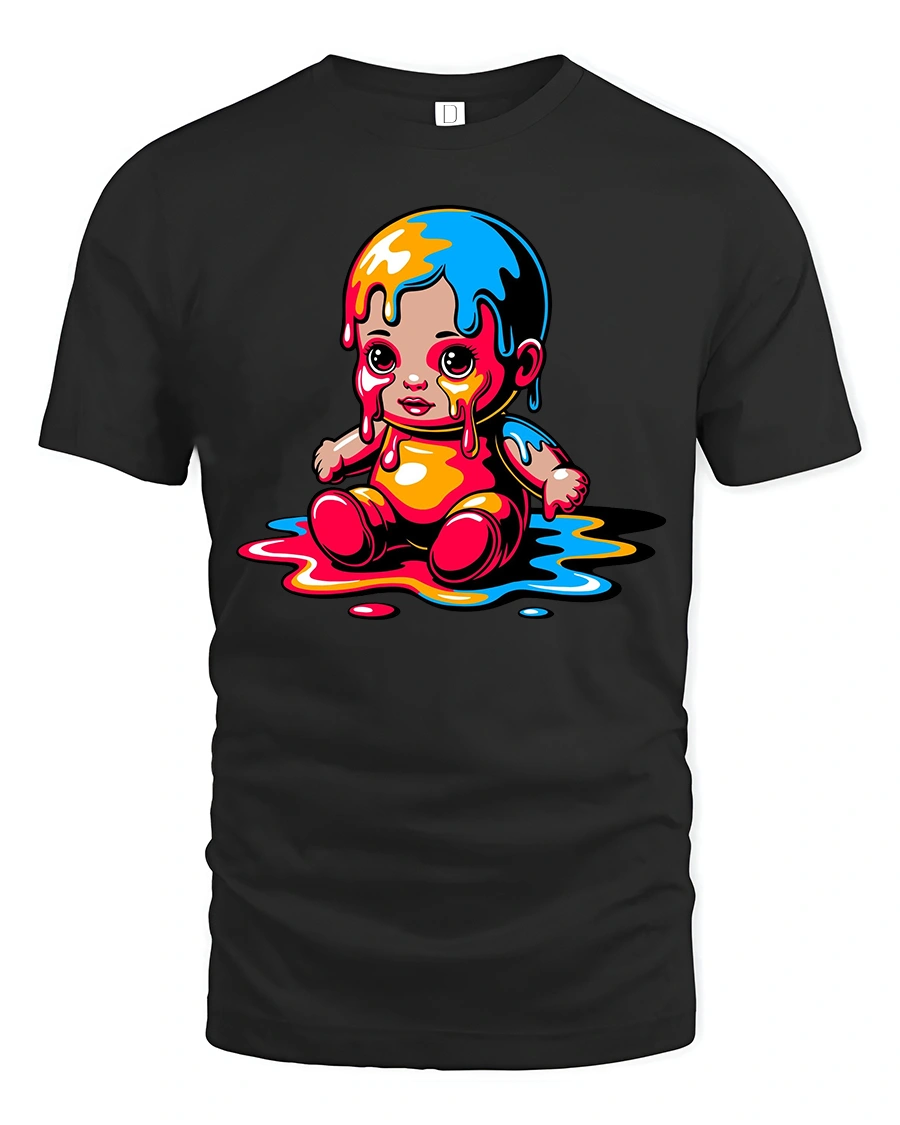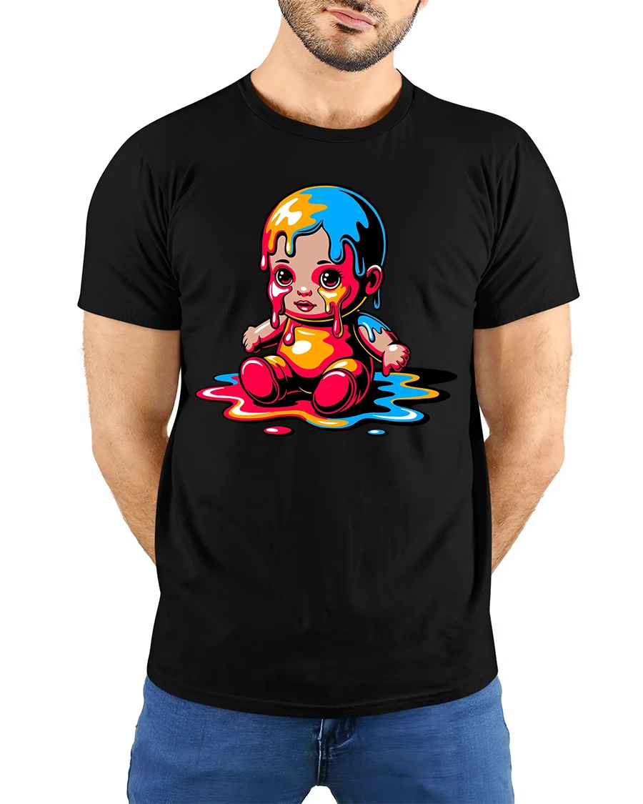 Melting Color Baby Doll Cartoon Graphic Tee With Soft Cotton Feel is ideal for fans of pop art surreal graphics and quirky fashion.