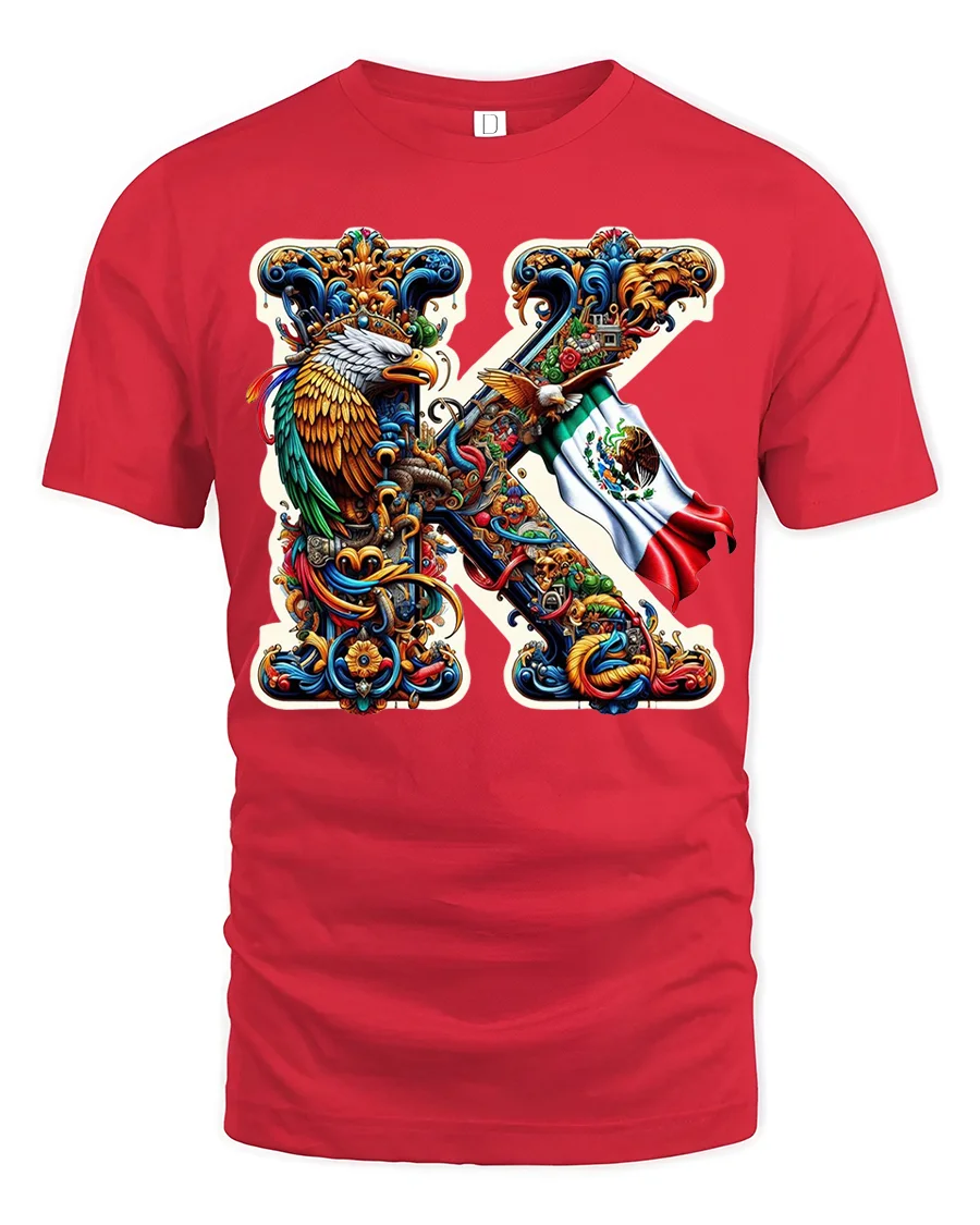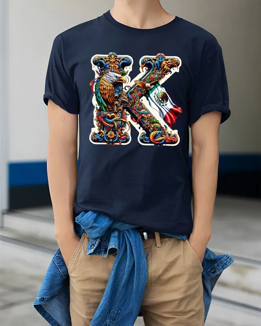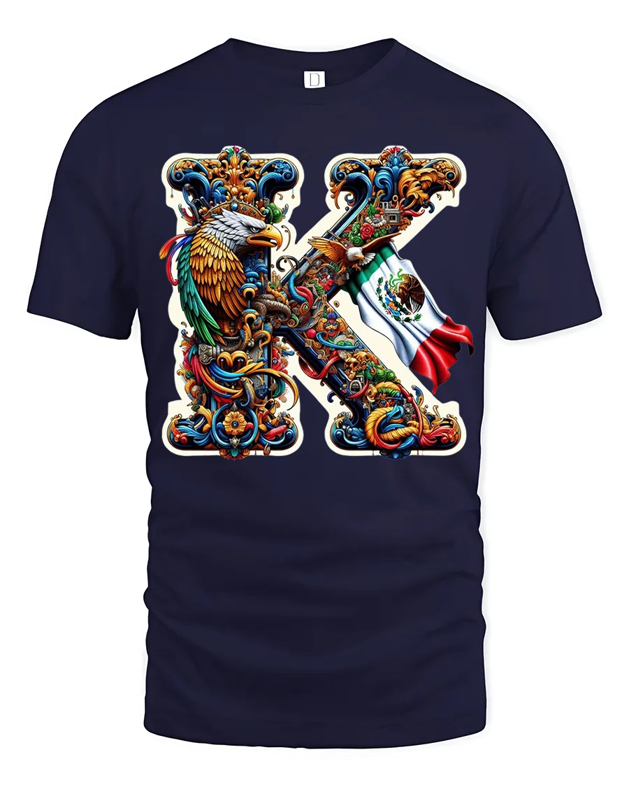 Mexico Eagle Art K Letter Tee with Vibrant Ornamental Design showcases a bold and culturally rich interpretation of the letter K. The artwork features an intricately detailed Mexican eagle paired with the national flag, set inside a vibrant ornamental frame filled with swirling shapes, vivid colors, and symbolic patterns. This striking composition brings together tradition, pride, and contemporary artistry in a way that stands out instantly.