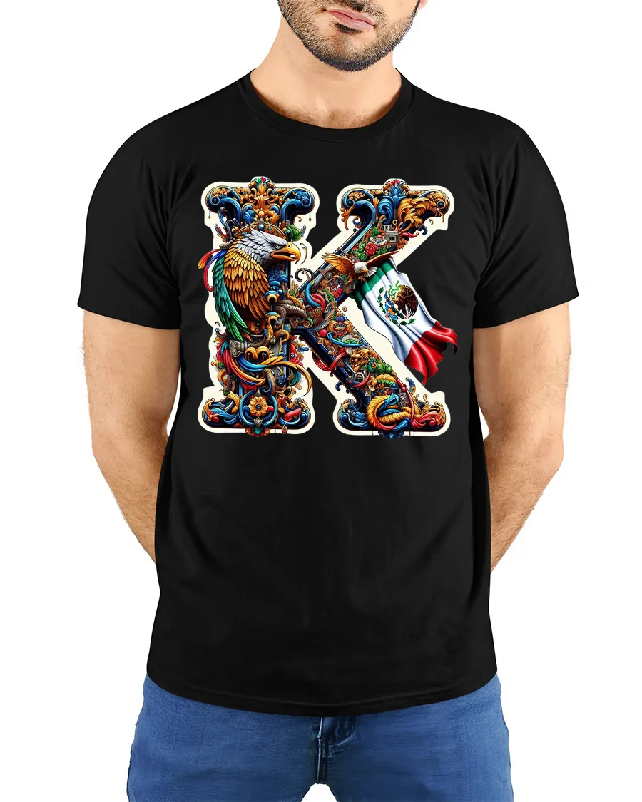 The Mexico Eagle Art K Letter Tee with Vibrant Ornamental Design also makes a memorable gift for those who appreciate expressive cultural artwork. Its colorful detailing and strong symbolic elements make it a meaningful piece that connects identity and artistic flair in a stylish and modern way.