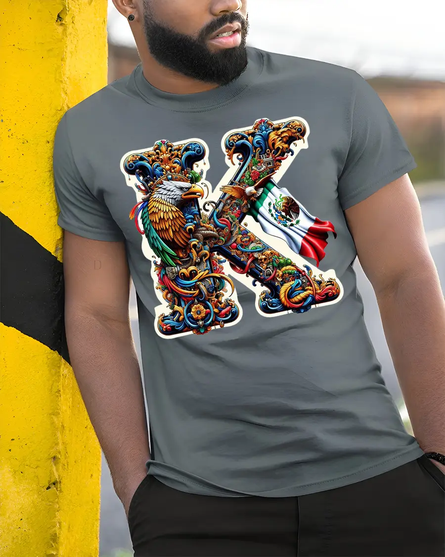 Wearing the Mexico Eagle Art K Letter Tee with Vibrant Ornamental Design is a powerful way to celebrate heritage while enjoying an eye-catching fashion statement. The impressive combination of the eagle, flag, and decorative elements creates a unique look that appeals to anyone who loves meaningful art and bold graphics. Whether worn casually or as part of a themed celebration, this tee delivers a standout visual impact.