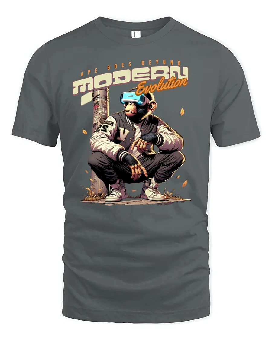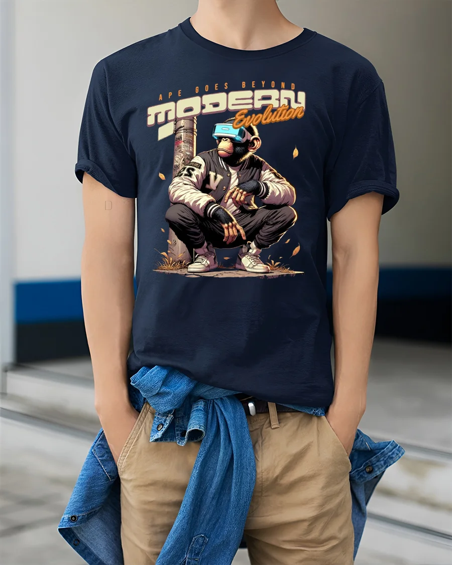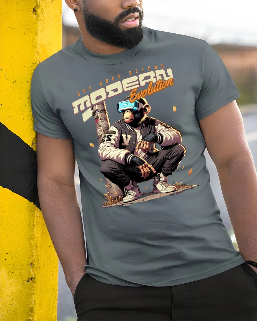 The Modern Evolution Ape Graphic Streetwear T-Shirt is a bold statement piece that blends futuristic vibes with urban attitude. Featuring a stylish ape in a varsity jacket and VR-style visor, this design captures the essence of modern culture and edgy streetwear fashion.