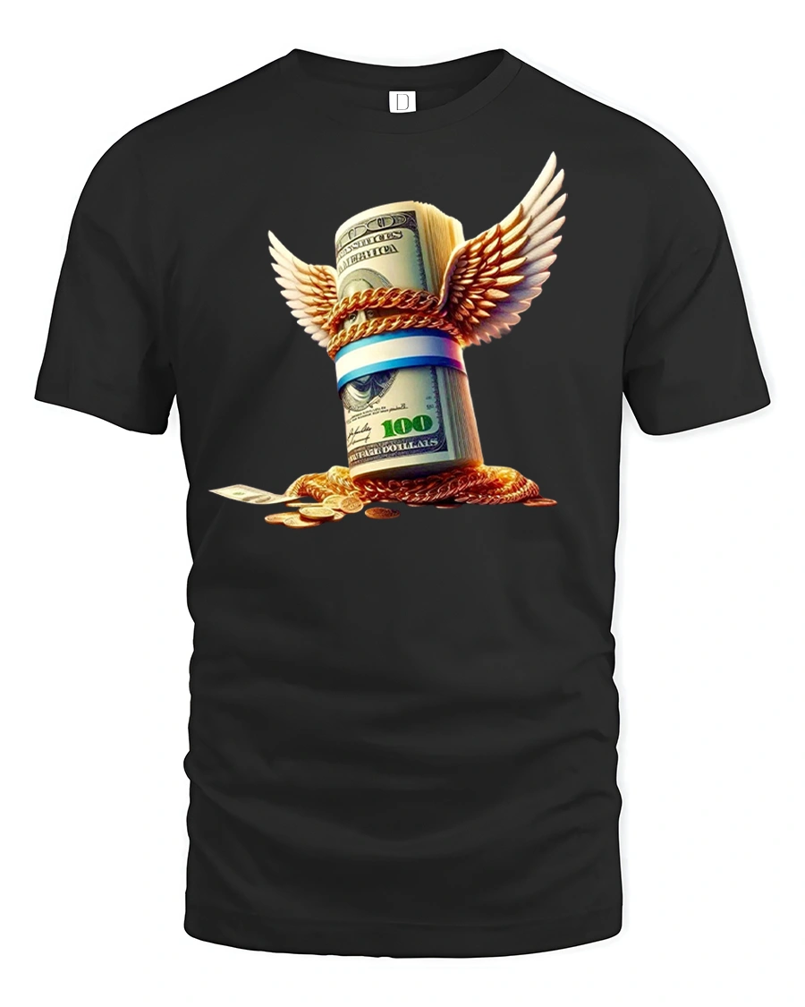 This bold design features a stack of hundred-dollar bills wrapped in a golden chain with angel wings — symbolizing freedom, success, and unstoppable ambition.