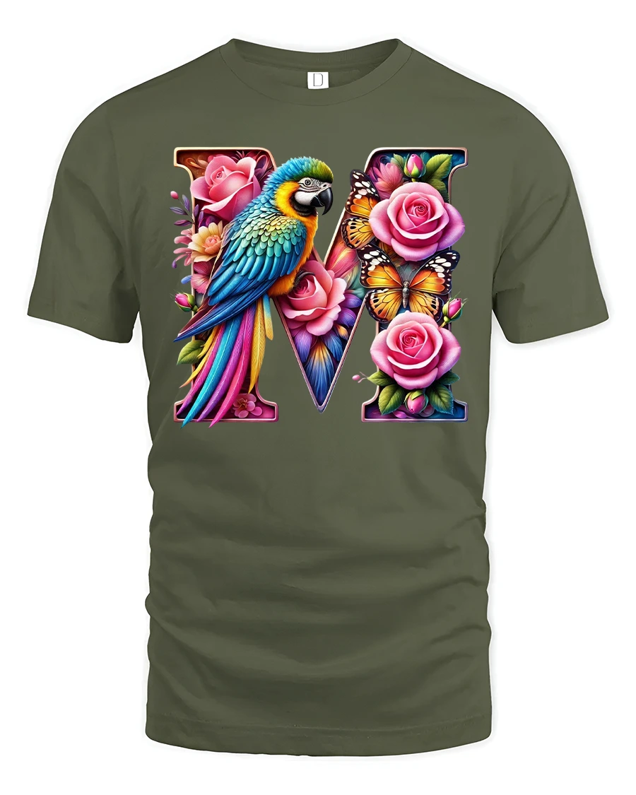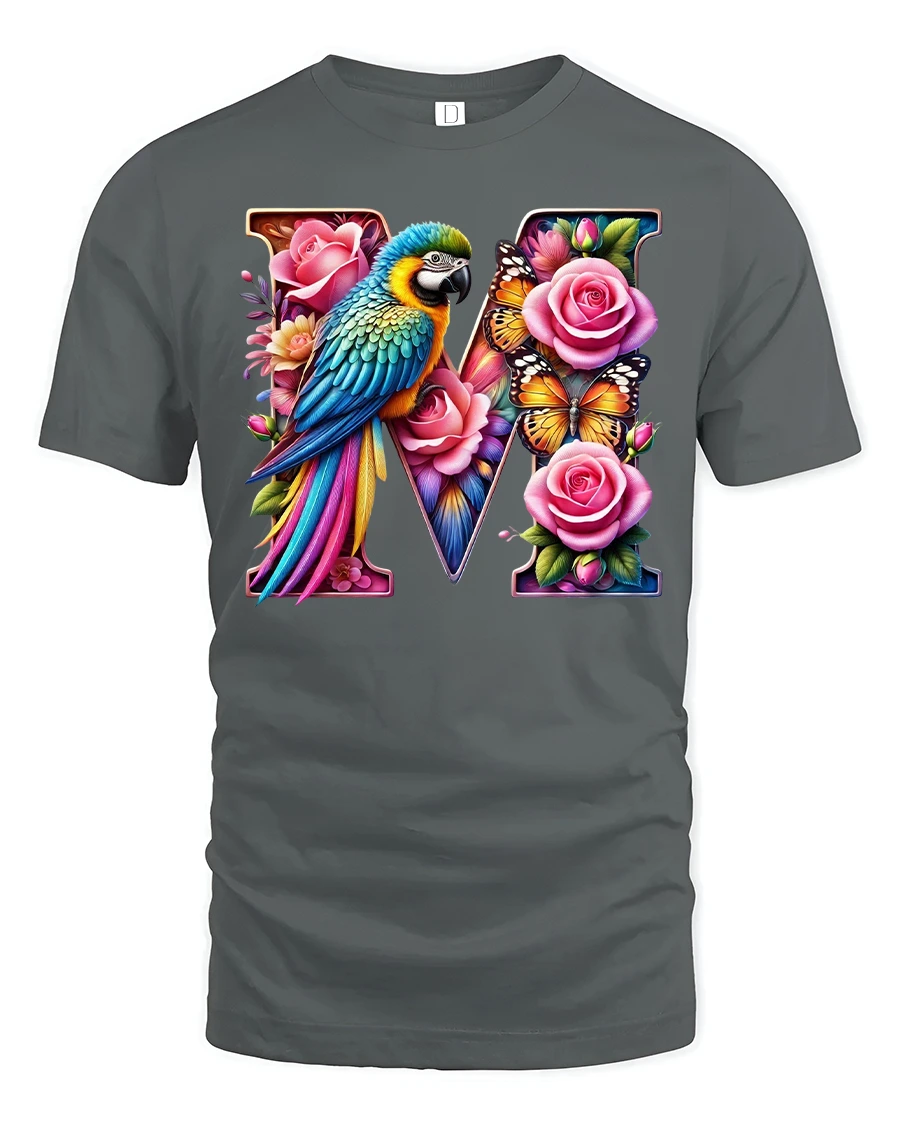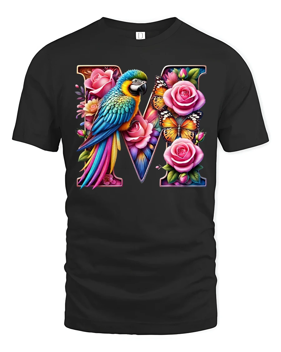 Monogram M Parrot Floral Graphic Tee brings a bold mix of color, nature, and personal style to your everyday wardrobe. Featuring a beautifully detailed parrot perched on a large floral letter M, this tshirt blends tropical charm with elegant roses and butterflies for a truly eye-catching design. The vibrant artwork makes this tee perfect for anyone who loves birds, nature, or personalized monogram fashion.