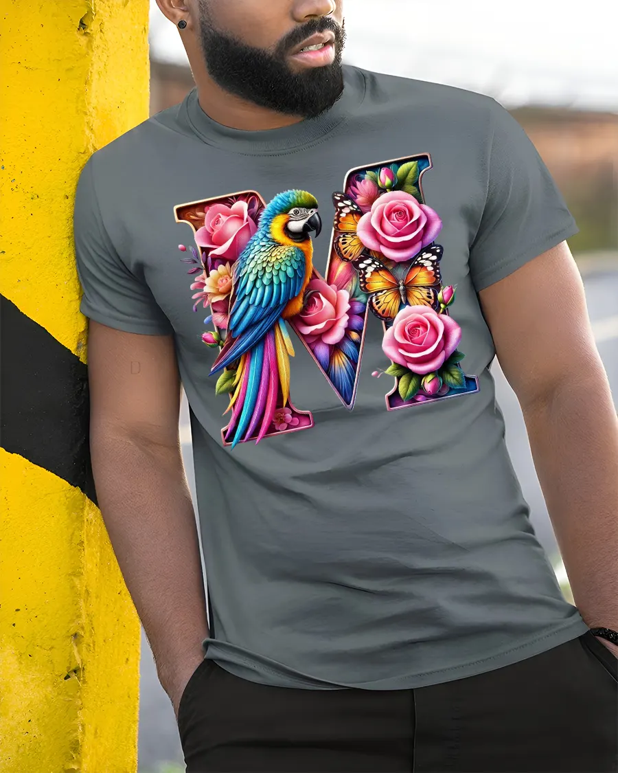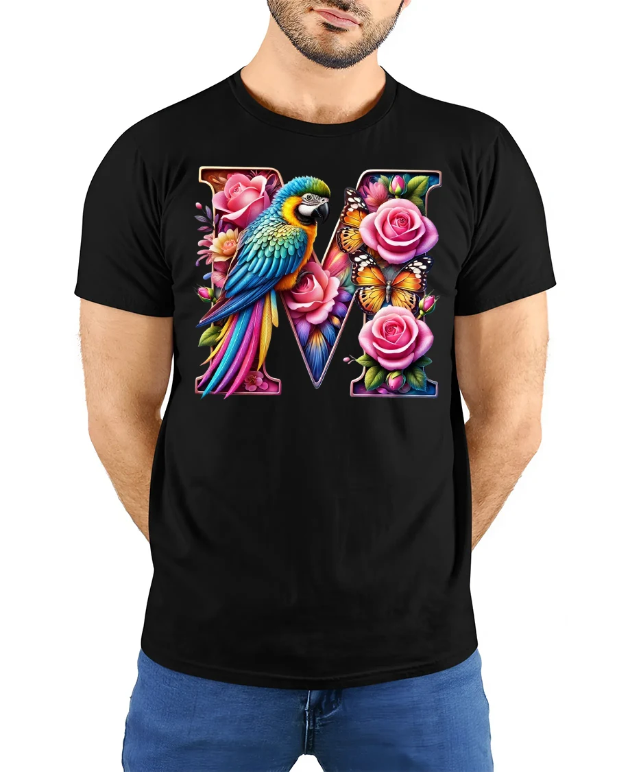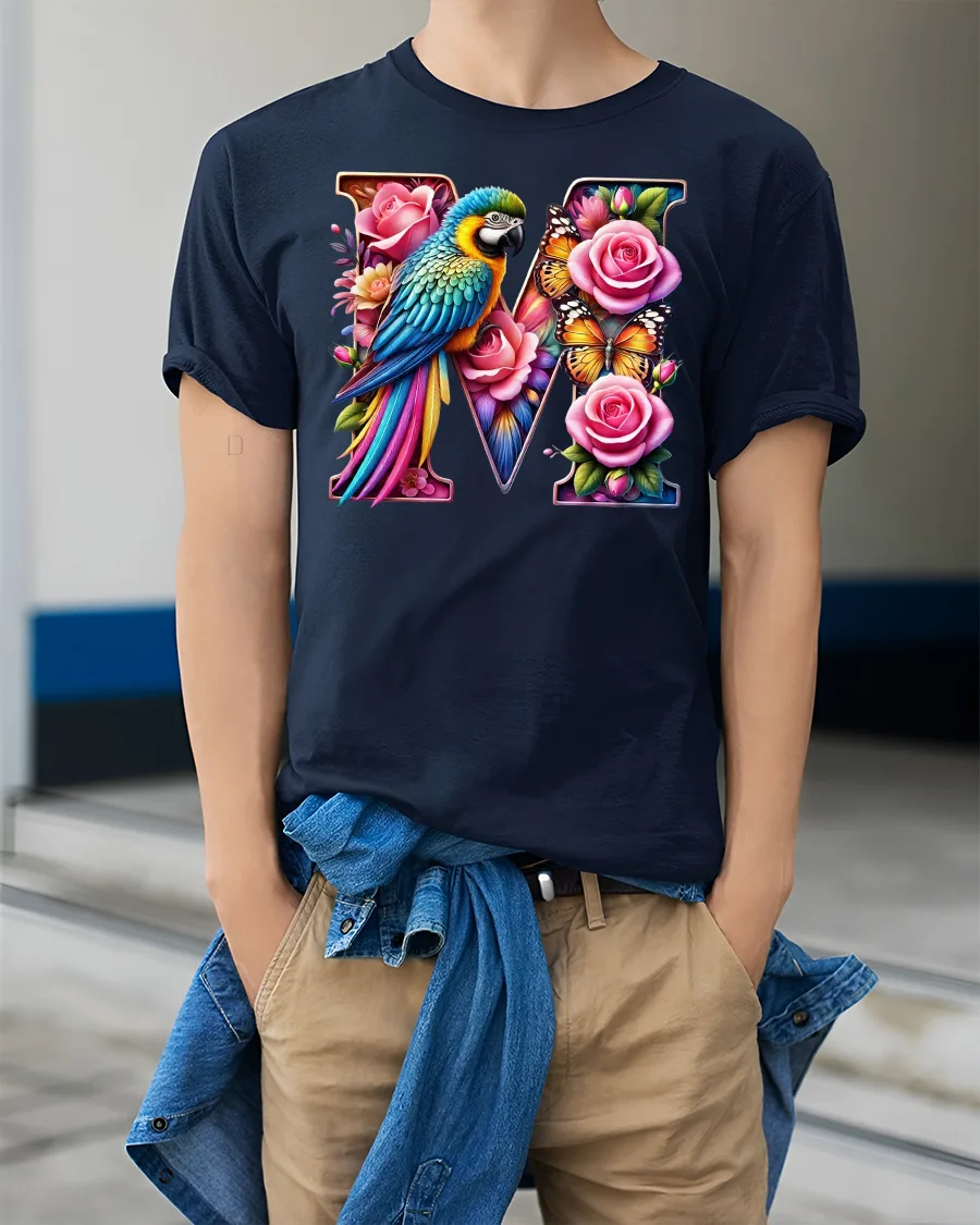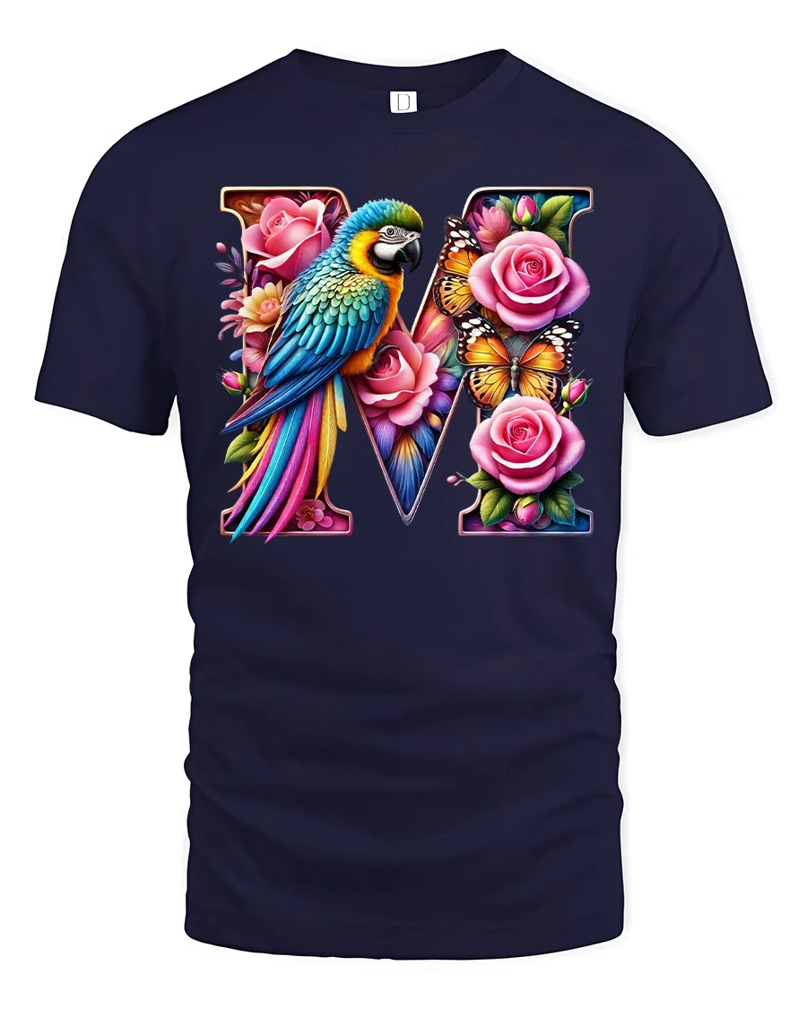 Monogram M Parrot Floral Graphic Tee brings a bold mix of color, nature, and personal style to your everyday wardrobe. Featuring a beautifully detailed parrot perched on a large floral letter M, this tshirt blends tropical charm with elegant roses and butterflies for a truly eye-catching design. The vibrant artwork makes this tee perfect for anyone who loves birds, nature, or personalized monogram fashion.