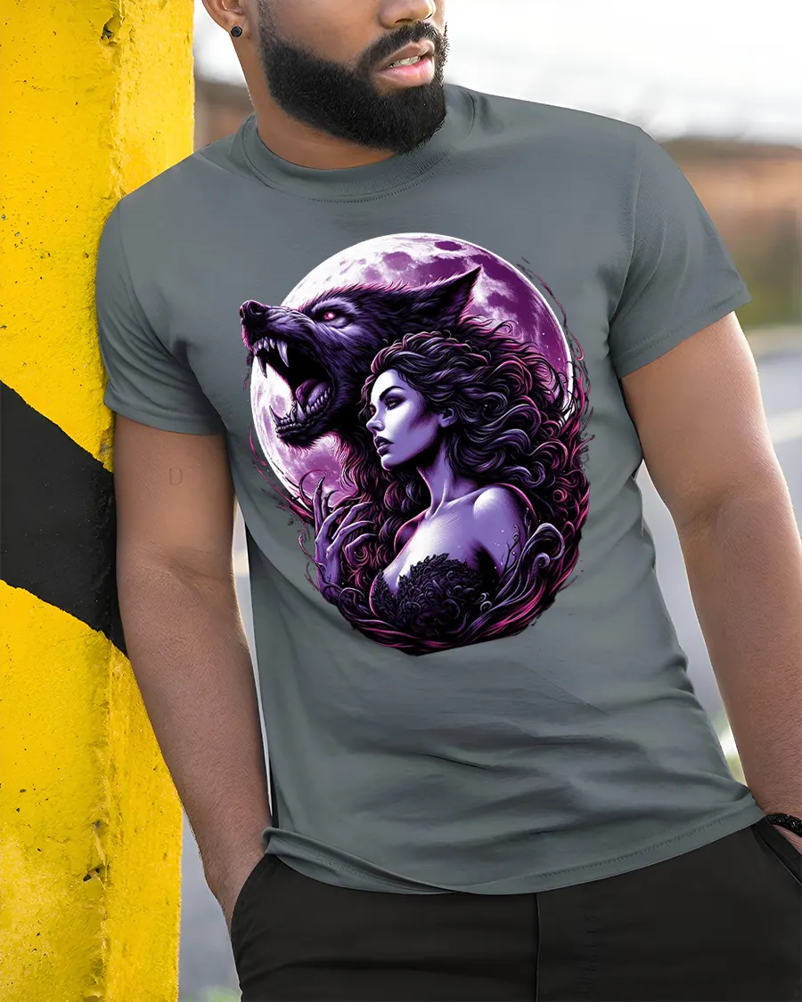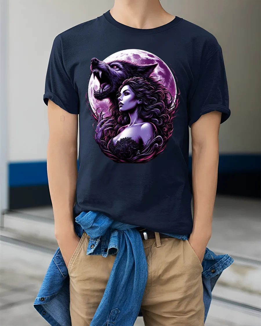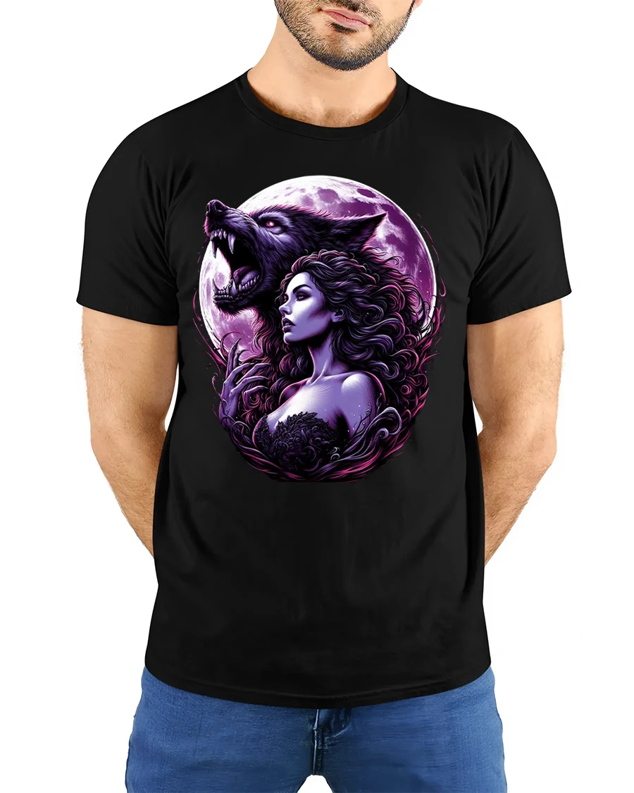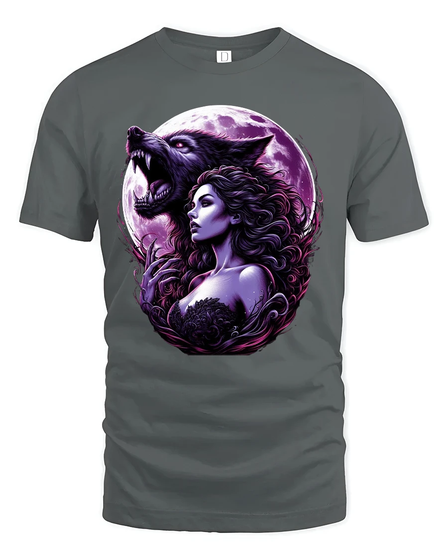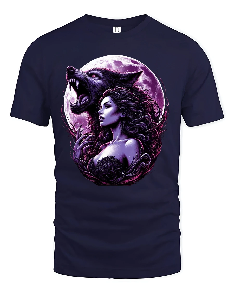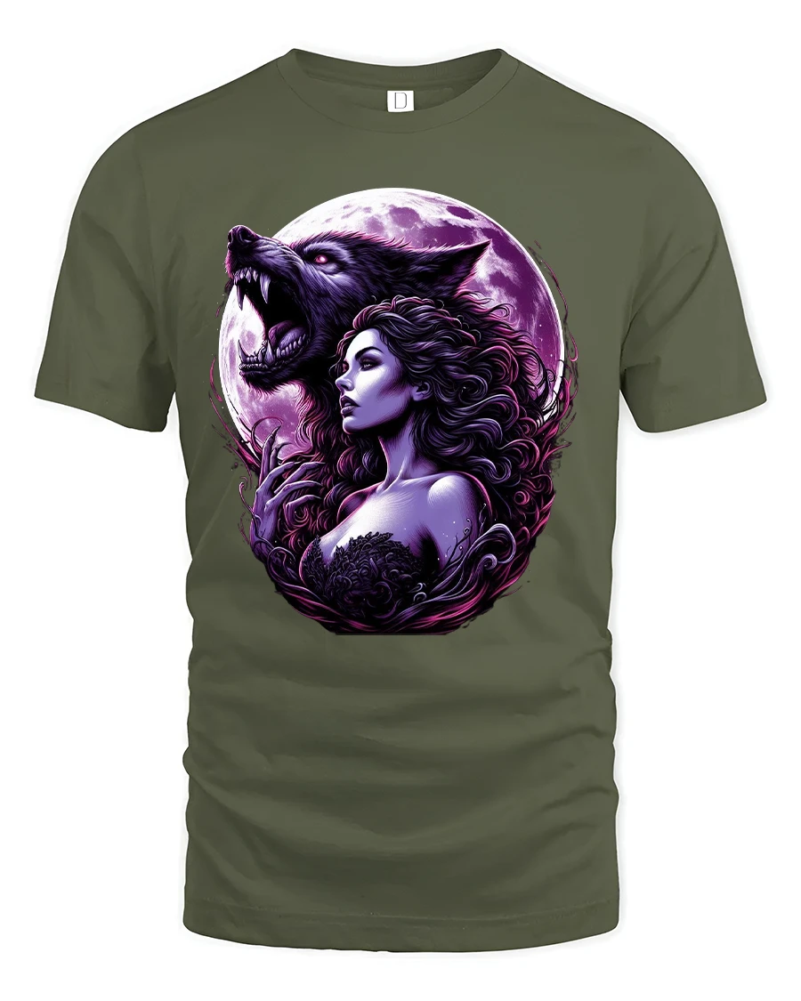 Featuring a fierce wolf howling beside a mysterious woman under a glowing full moon, this shirt blends fantasy, strength, and femininity in perfect harmony.
