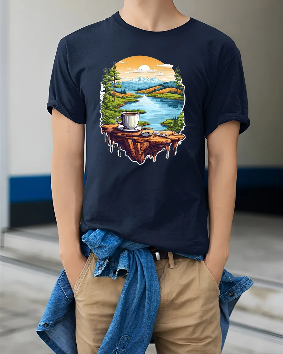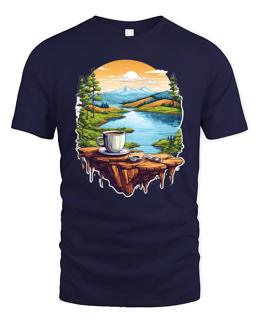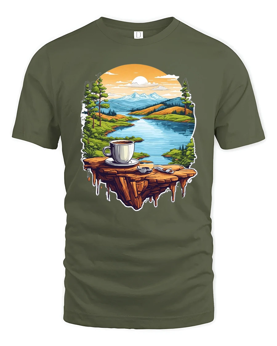 Enjoy the serenity of nature and the warmth of a morning brew with this inspiring outdoor coffee t-shirt.