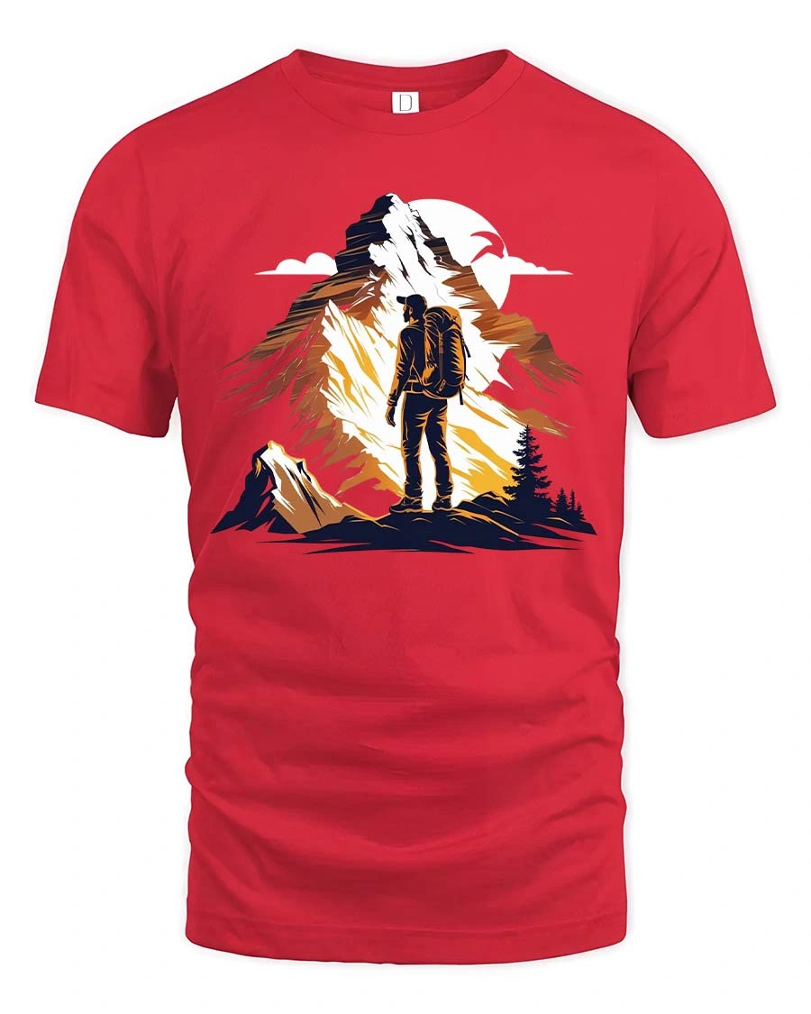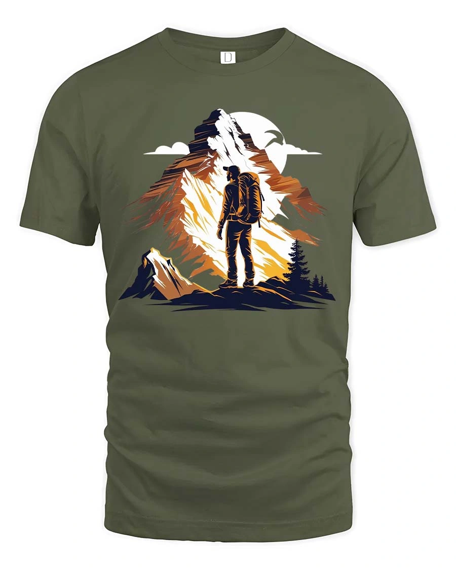 Capture the spirit of exploration with the Mountain Explorer Hiking Adventure Sunset Landscape T Shirt. This striking design features a lone backpacker standing proudly on a mountain ridge while looking toward a towering snow capped peak glowing in the light of a dramatic sunset. The bold outdoor illustration celebrates the thrill of adventure and the quiet beauty found high above the world.