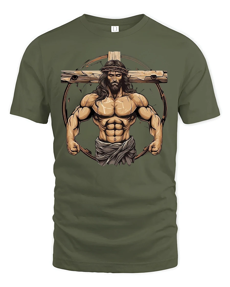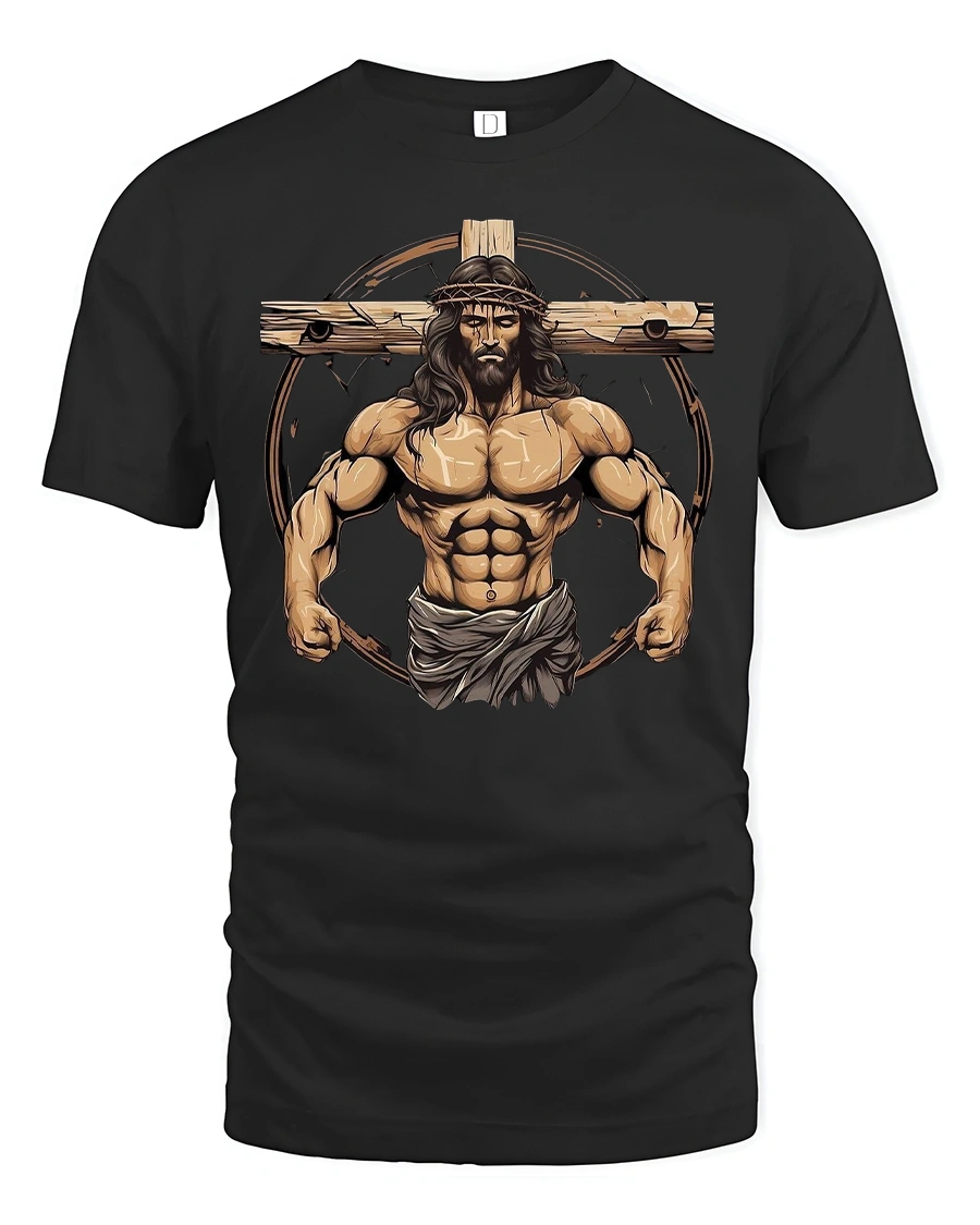 The Muscular Savior Graphic Tee Powerful Faith T-shirt combines bold art and modern style, making it a standout piece for believers and fans of unique fashion. Featuring a powerful illustration of strength and resilience, this design reimagines a heroic savior with unmatched determination and presence. It’s perfect for those who want their faith to shine through in a striking and edgy way.