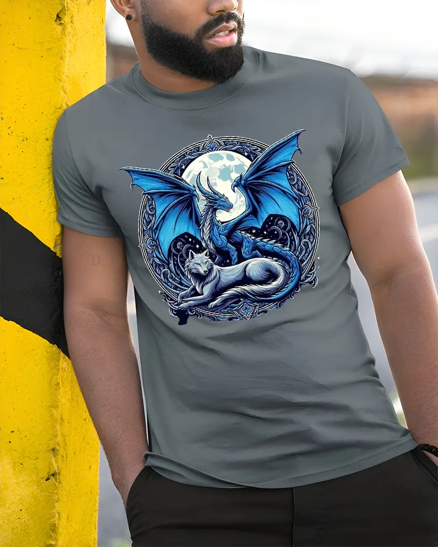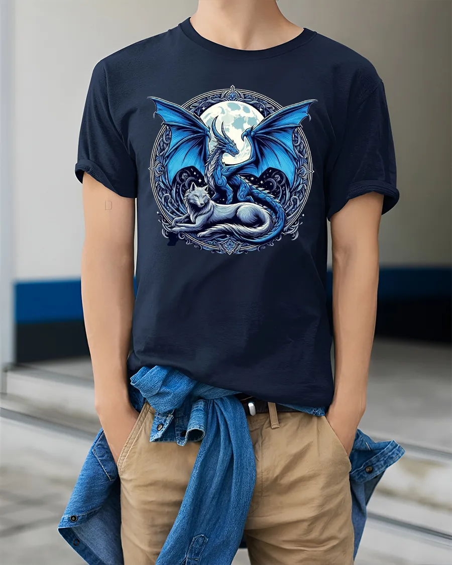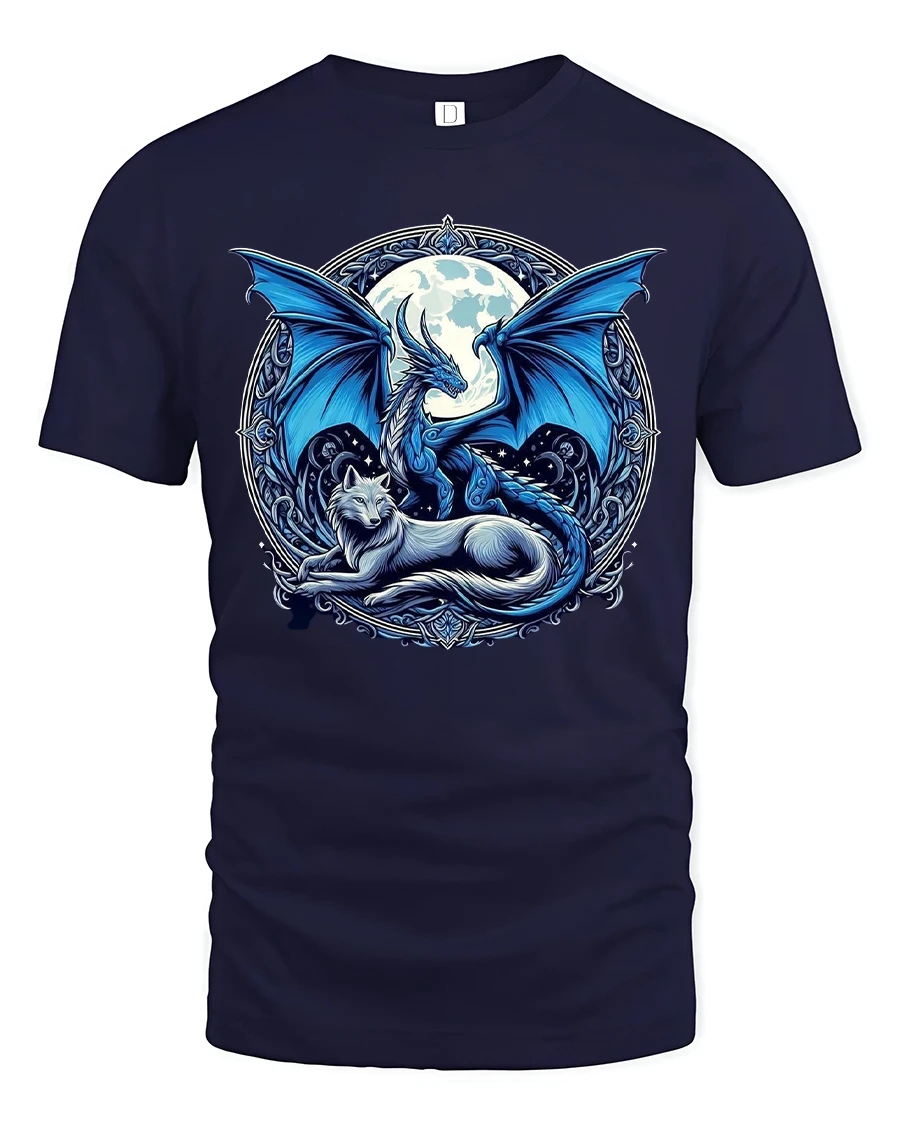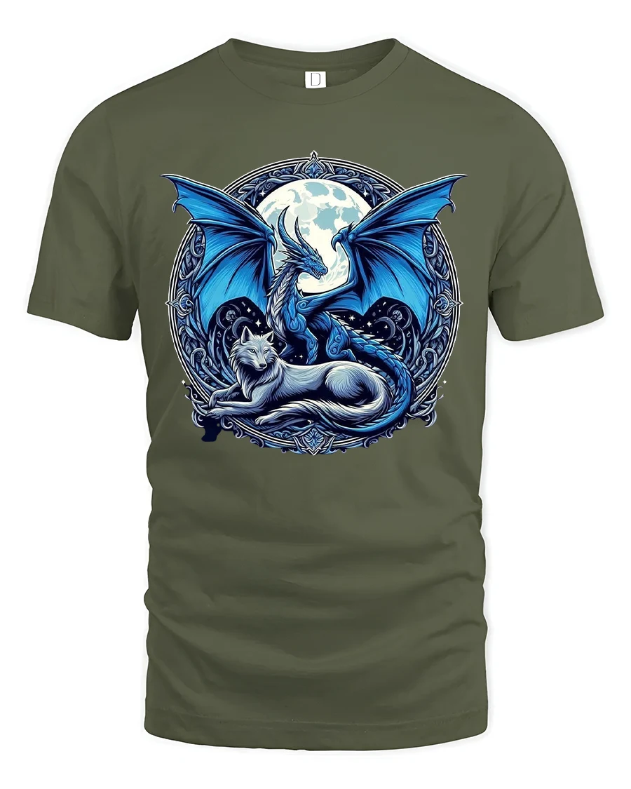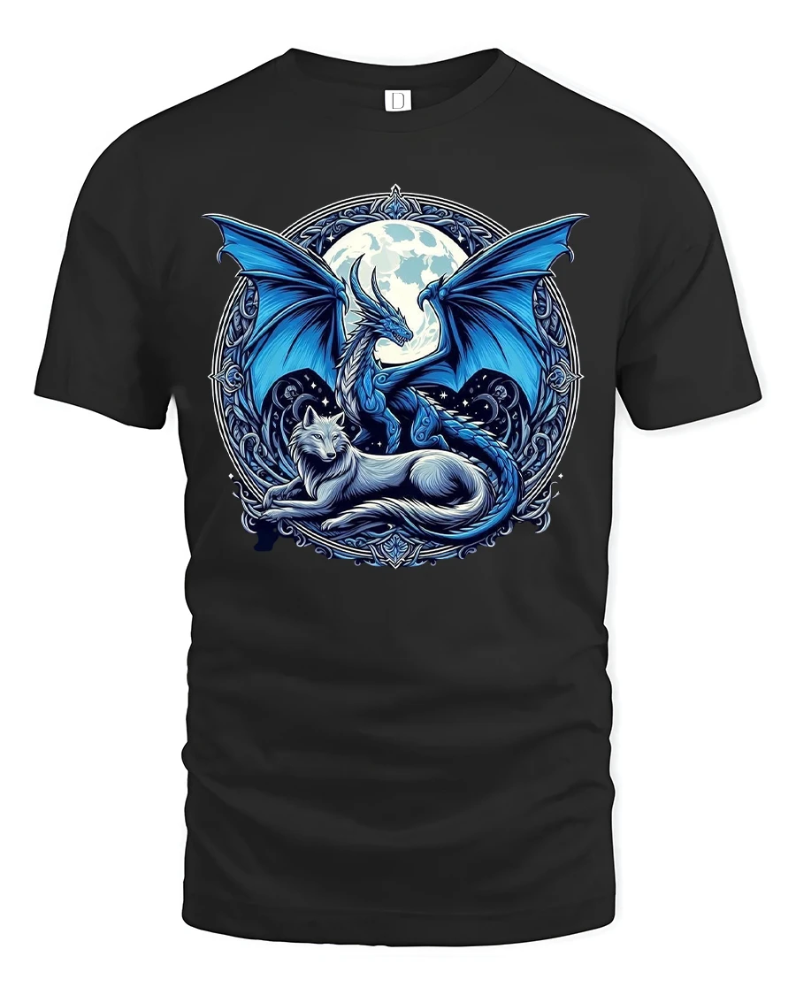 Mystic Dragon and Wolf Moon Fantasy Art Graphic Tee showcases a powerful bond between mythical strength and wild spirit.
