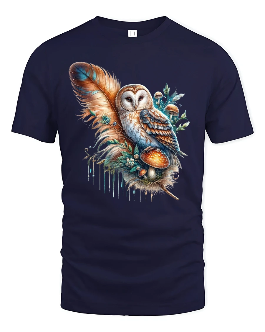 Mystic Owl with Feather and Mushroom Art T-Shirt captures the serene beauty of nature with a magical artistic touch.
