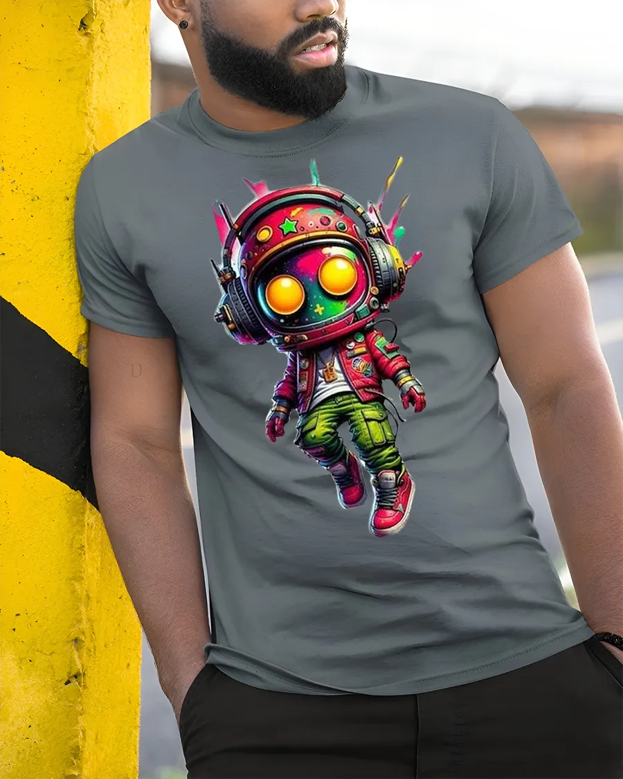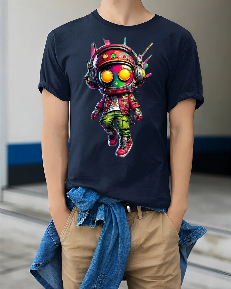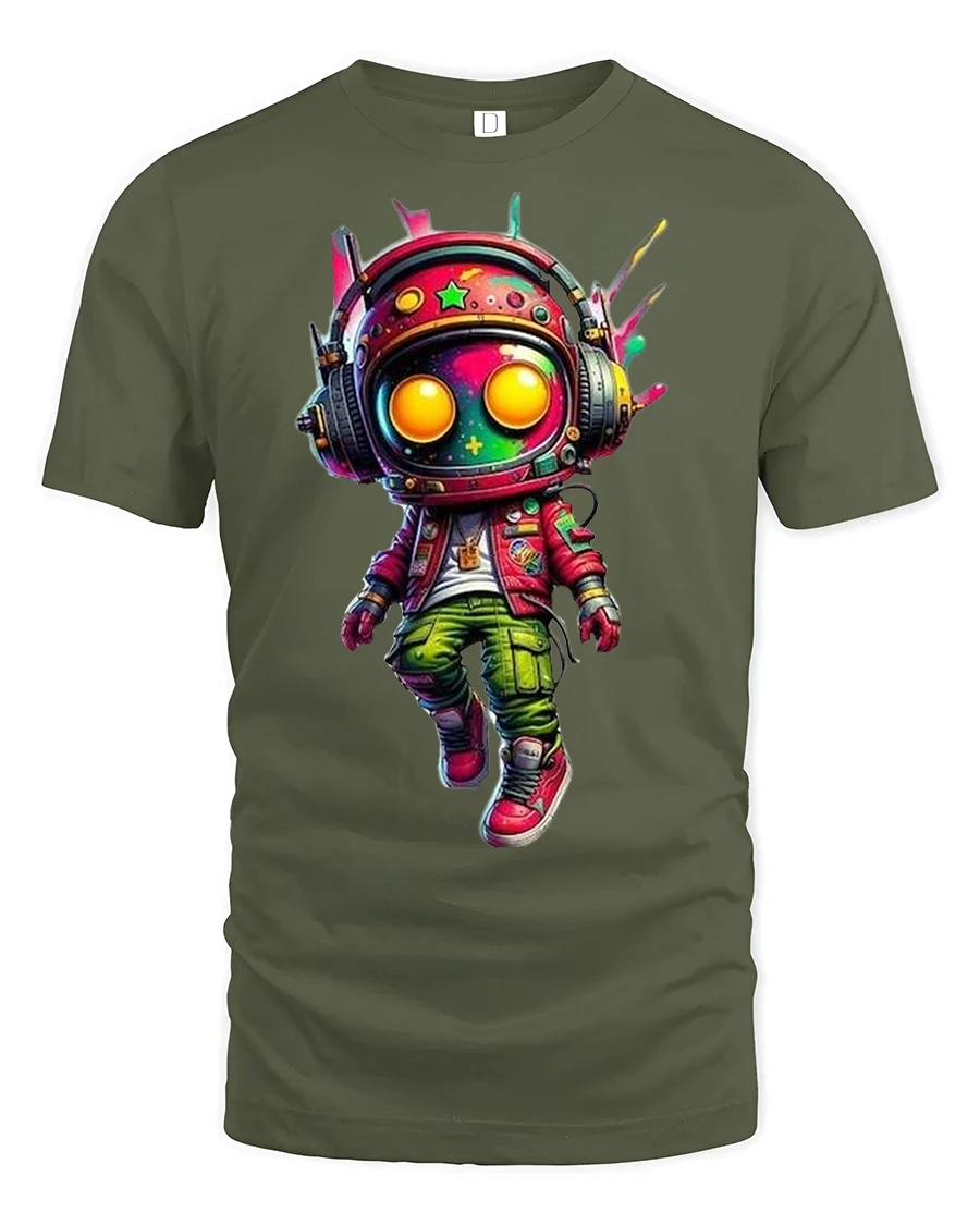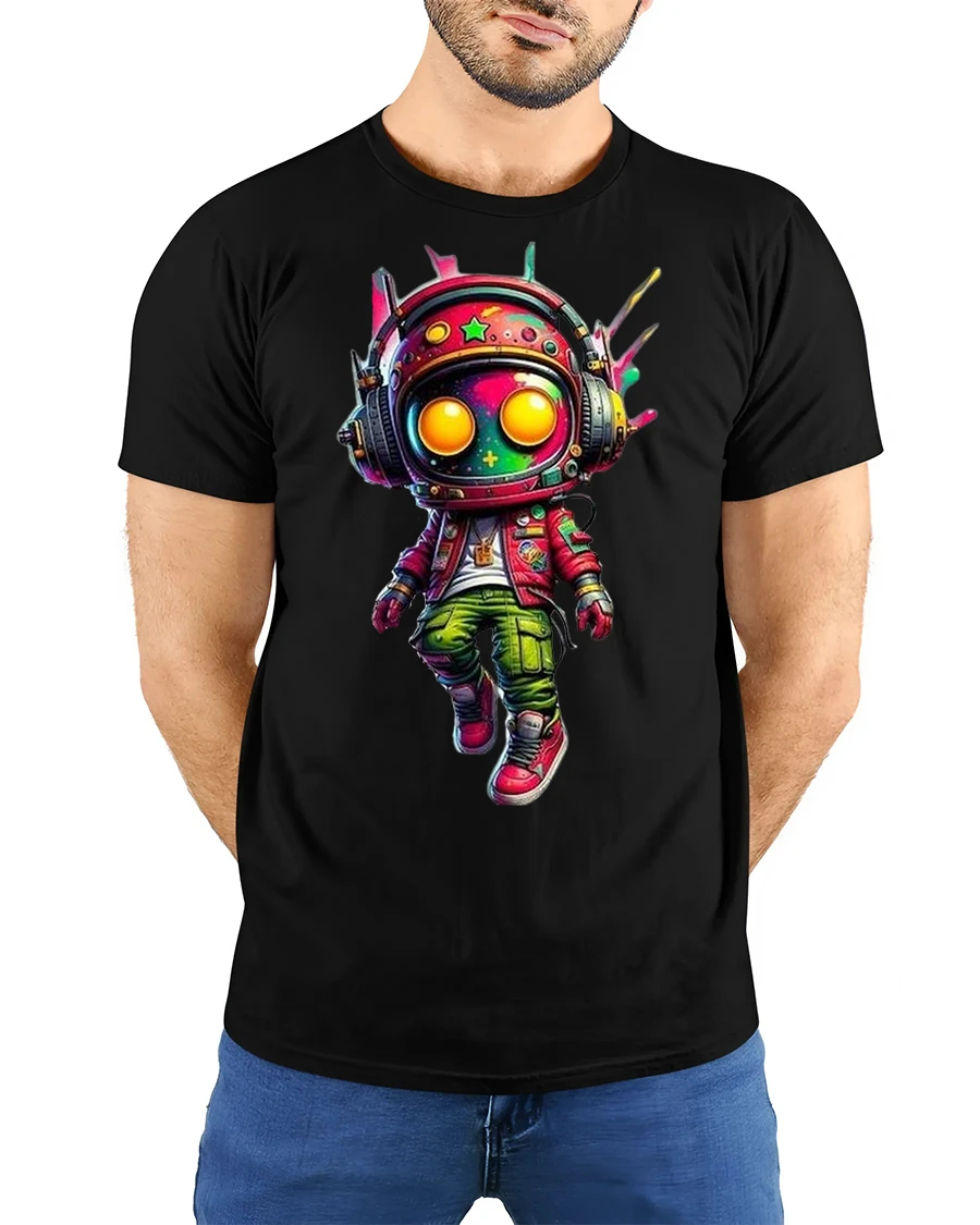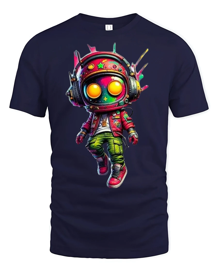 This bold and colorful design features a futuristic astronaut glowing with neon energy, blending cosmic vibes with street fashion.