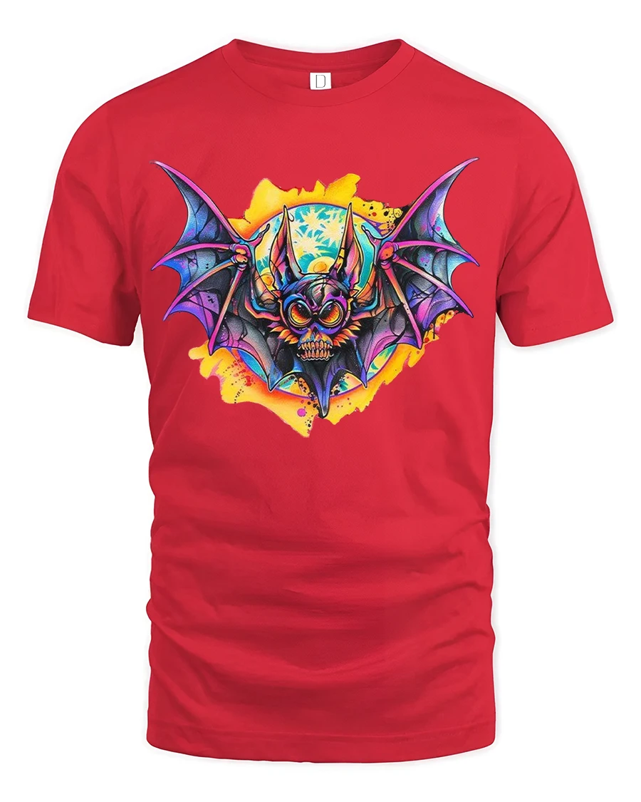 Neon Bat Skull Art T Shirt Dark Fantasy Graphic Tee delivers a striking visual with intense colors and bold fantasy elements.