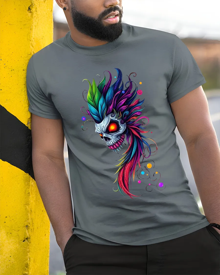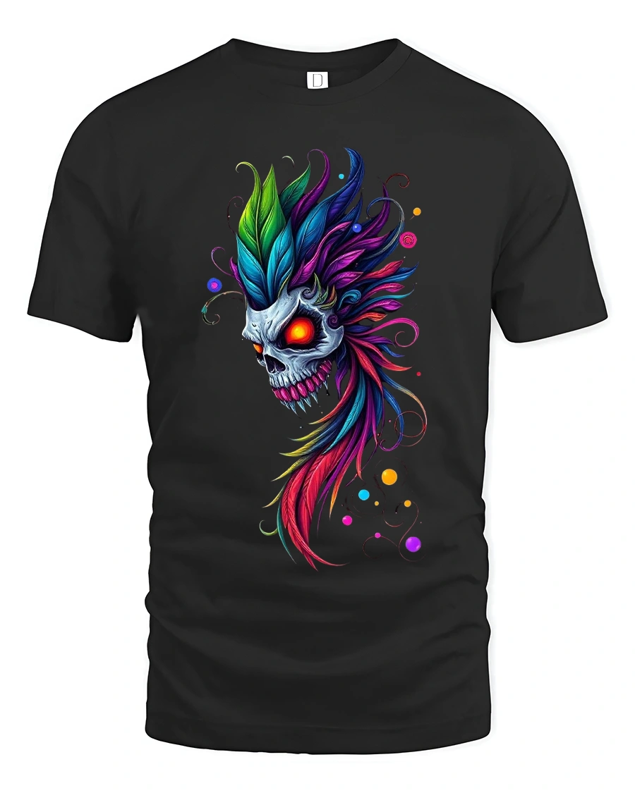 Neon Feather Skull Fantasy Art Graphic Tee With Dark Vivid Style delivers a striking fusion of dark fantasy and vibrant color expression.
