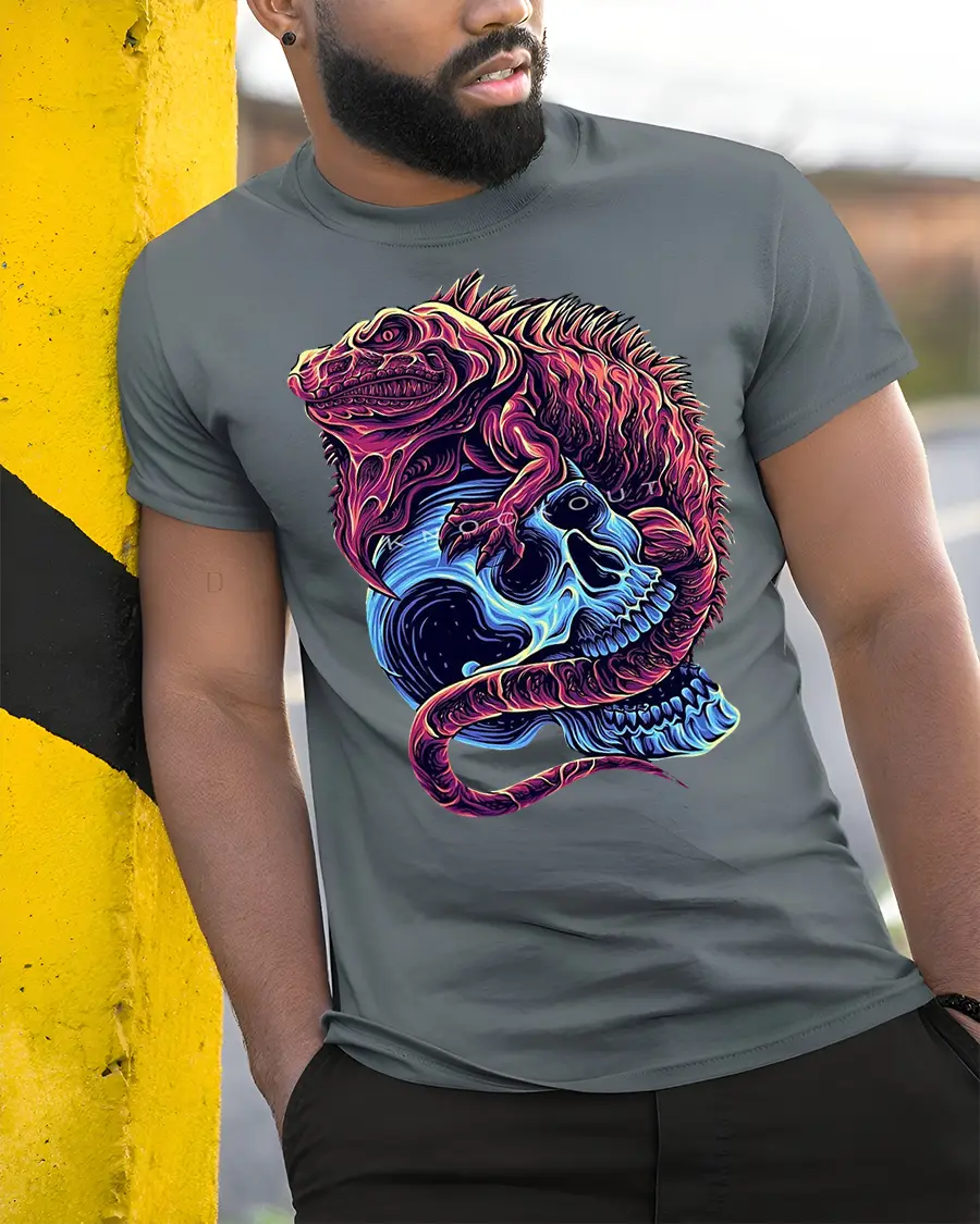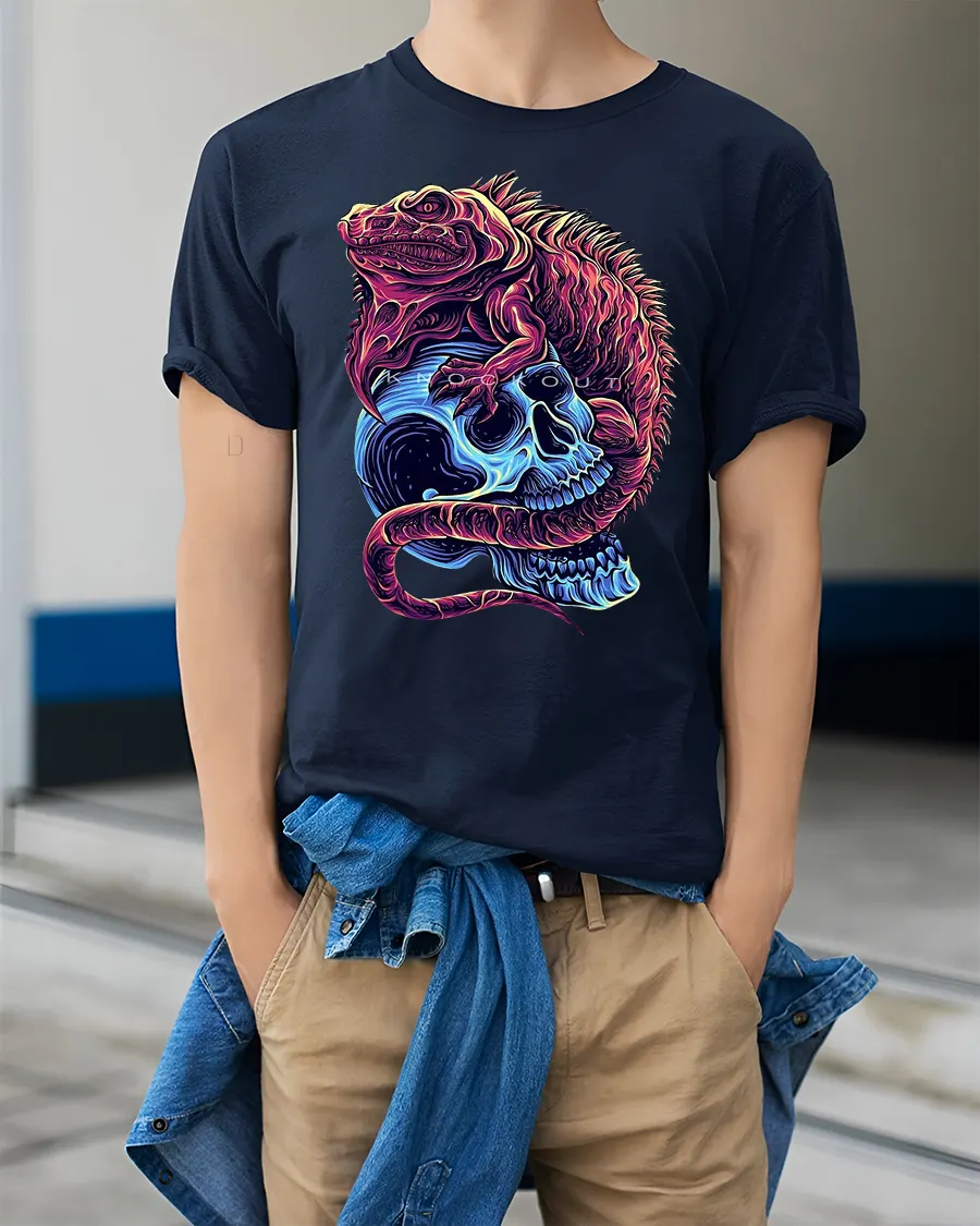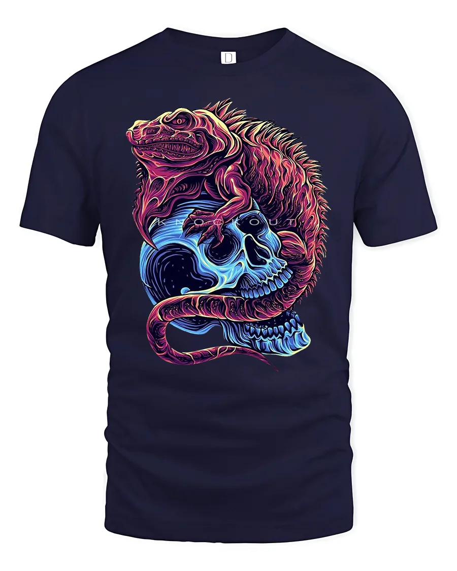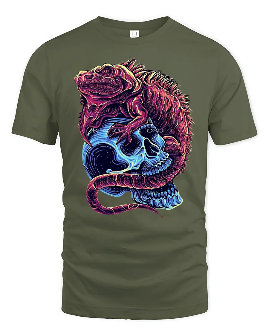 Featuring a glowing lizard wrapped around a skull with vivid electric colors, this design delivers a bold statement for fans of dark art and alternative fashion.