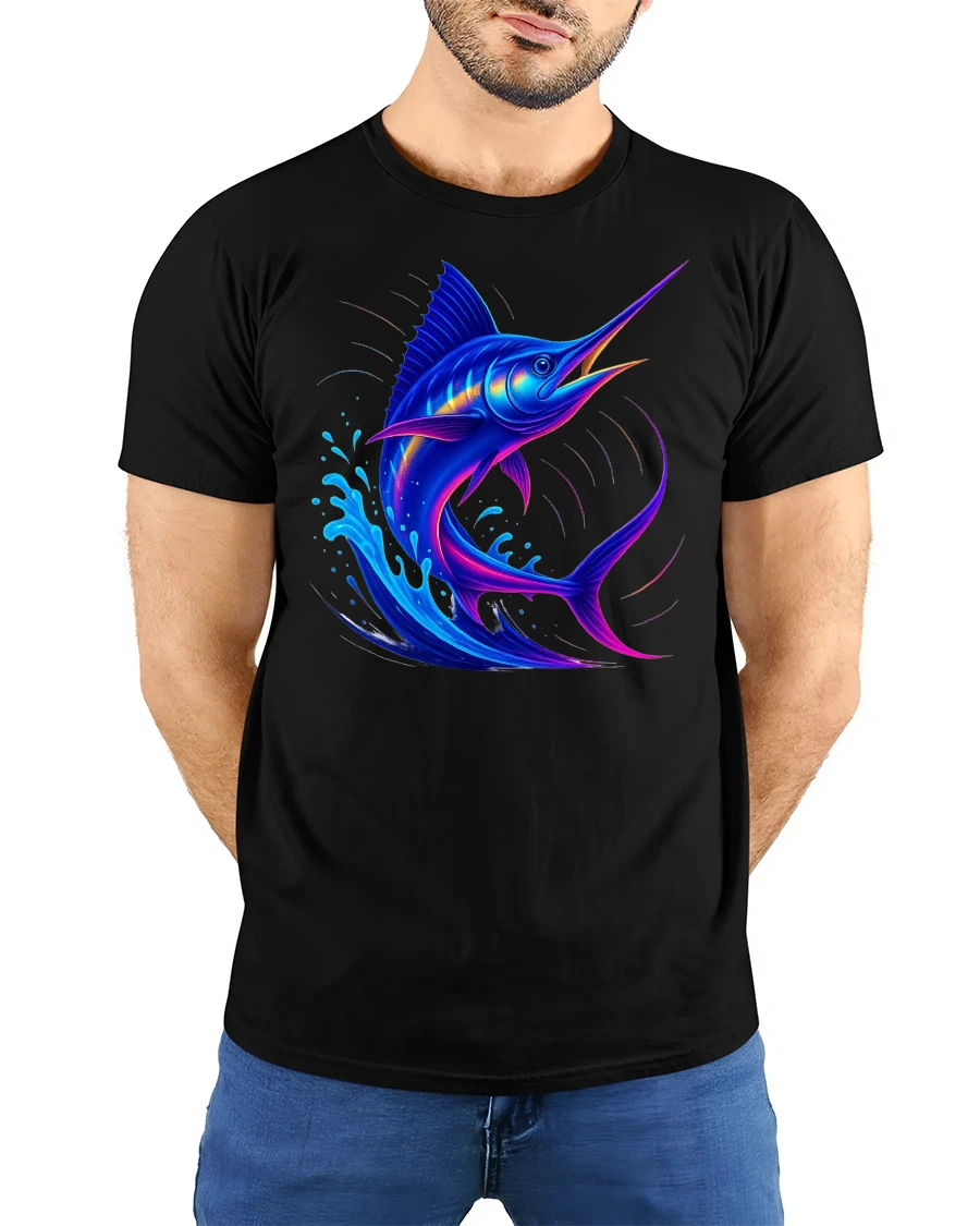 The Neon Marlin Swordfish Splashing Wave Graphic T-Shirt is a bold and vibrant design perfect for fishing lovers and ocean enthusiasts. Featuring a neon blue and purple marlin leaping through crashing waves, this shirt captures the thrill of big game fishing and the beauty of deep-sea adventure.