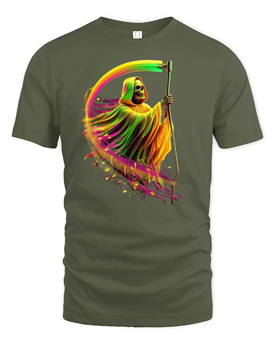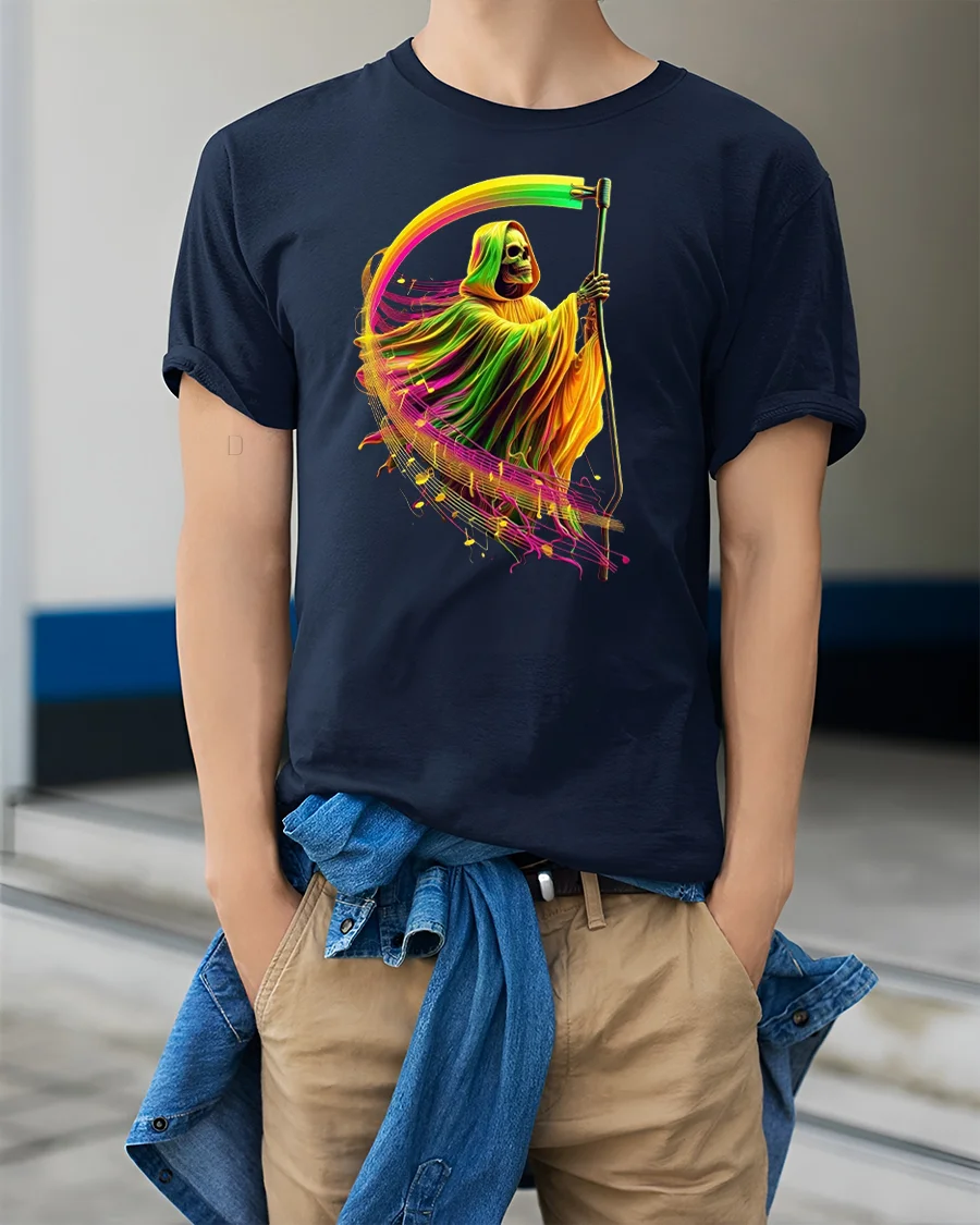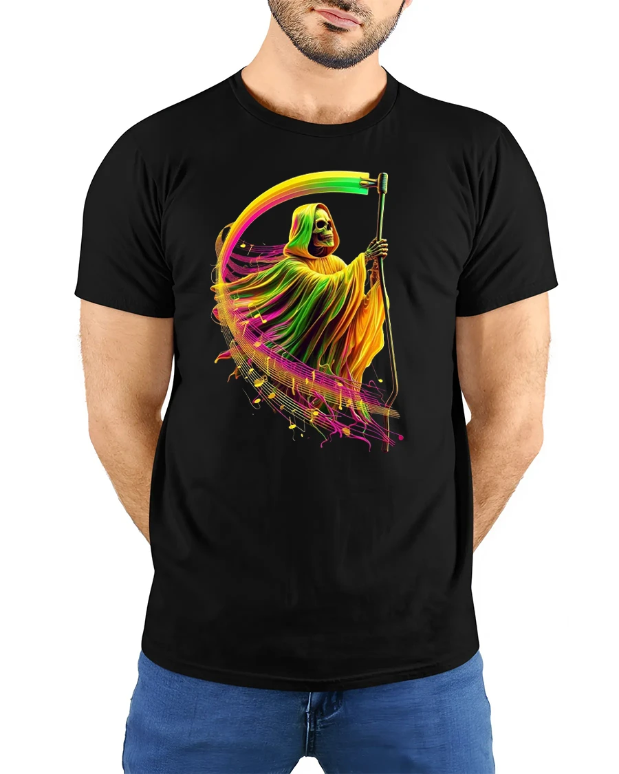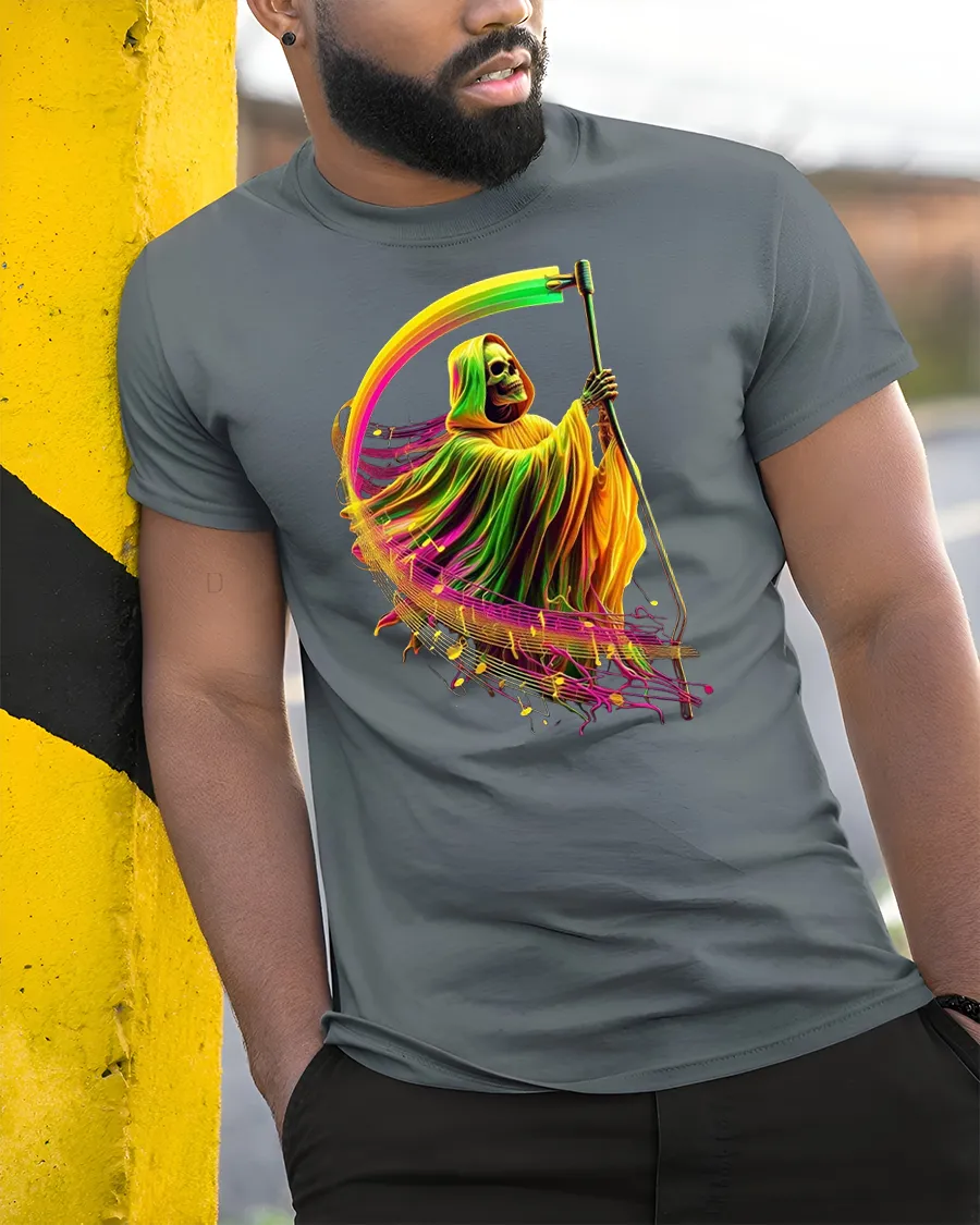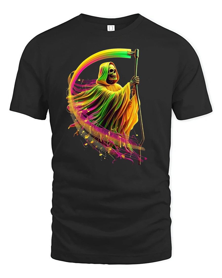 Featuring a glowing Grim Reaper surrounded by musical waves and neon colors, this tee perfectly captures a mix of gothic edge and electric rhythm.