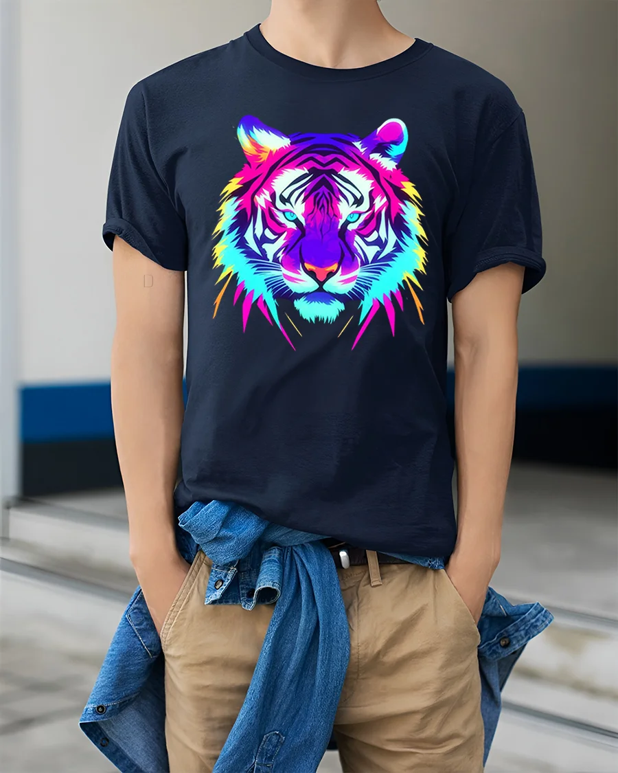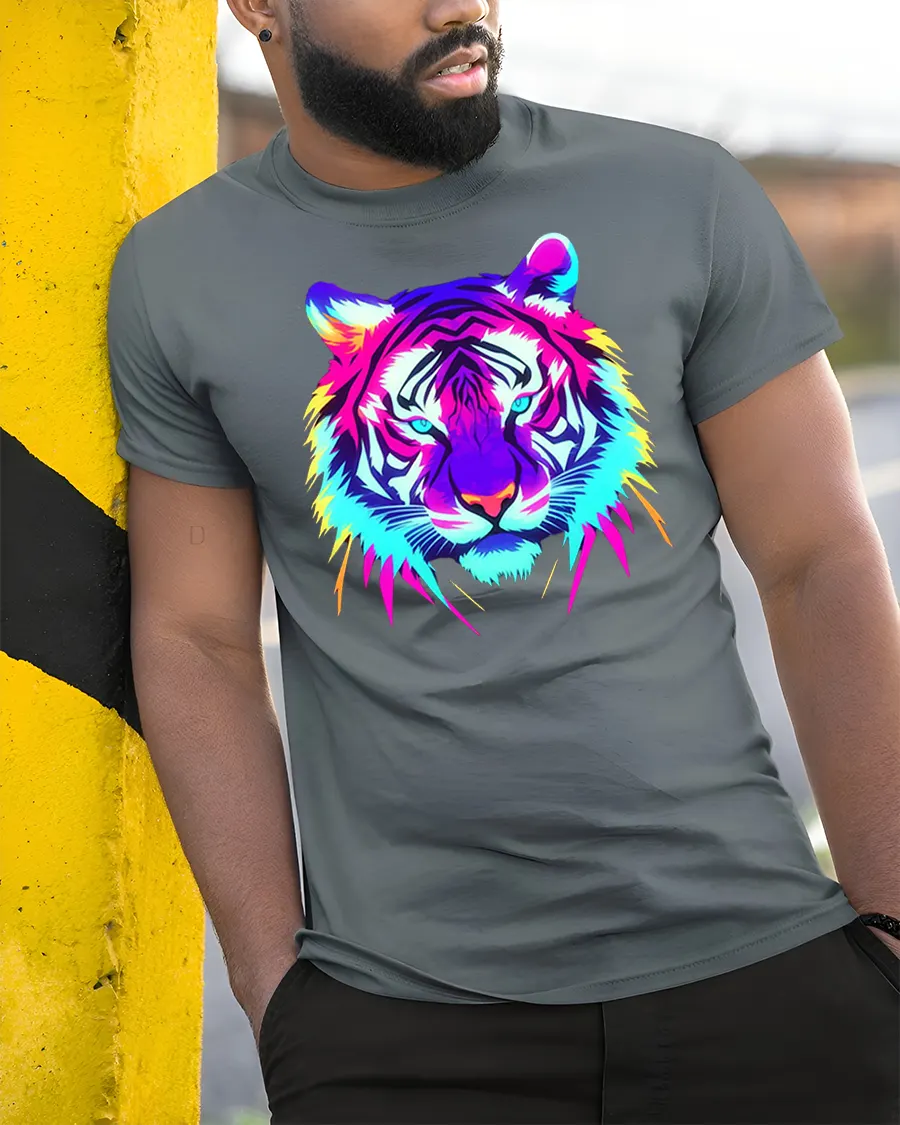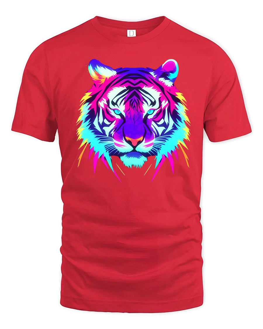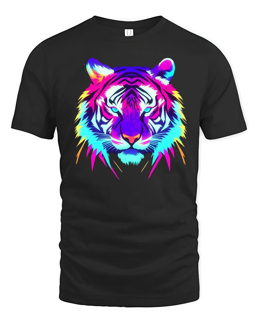 This design features a powerful tiger face illustrated with vibrant neon colors and bold lines that create an intense and captivating visual impact.