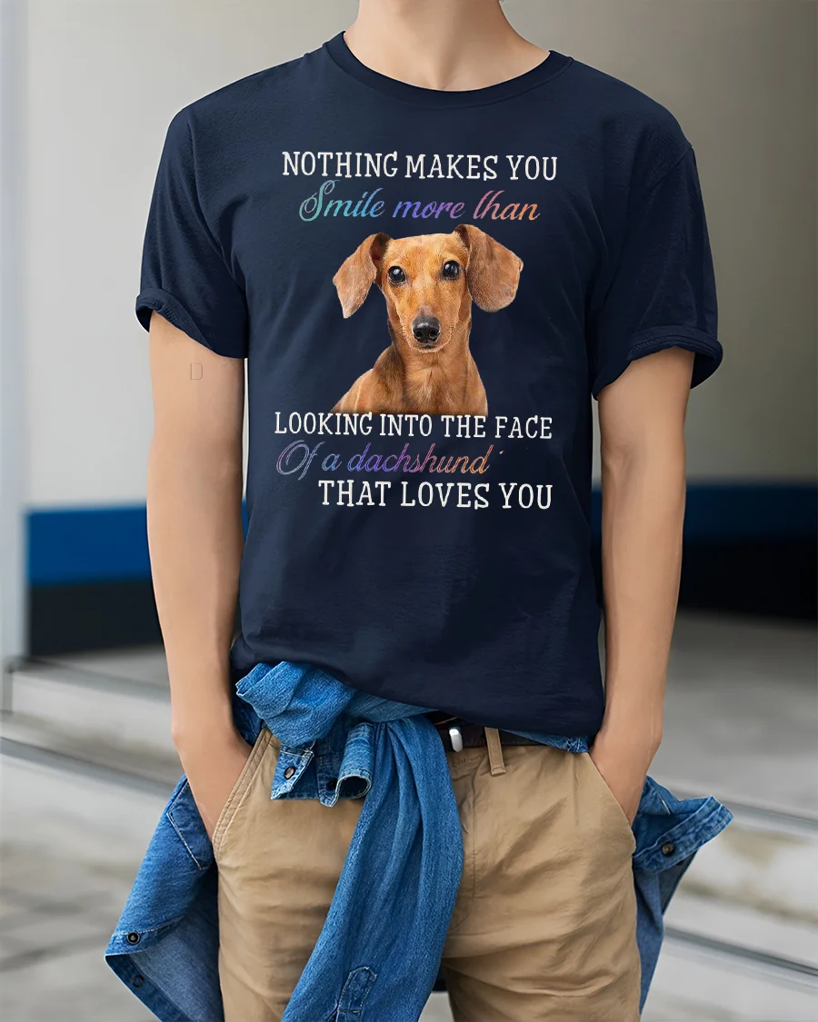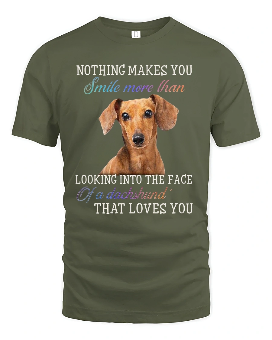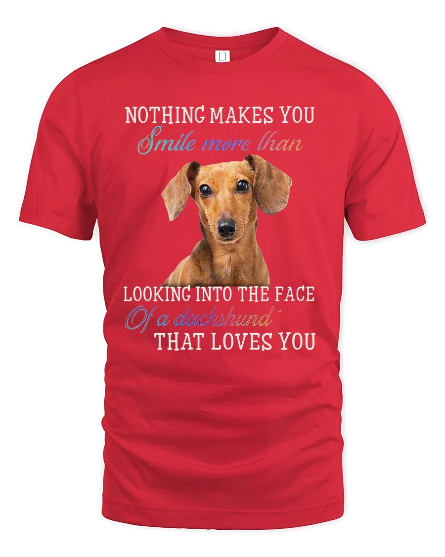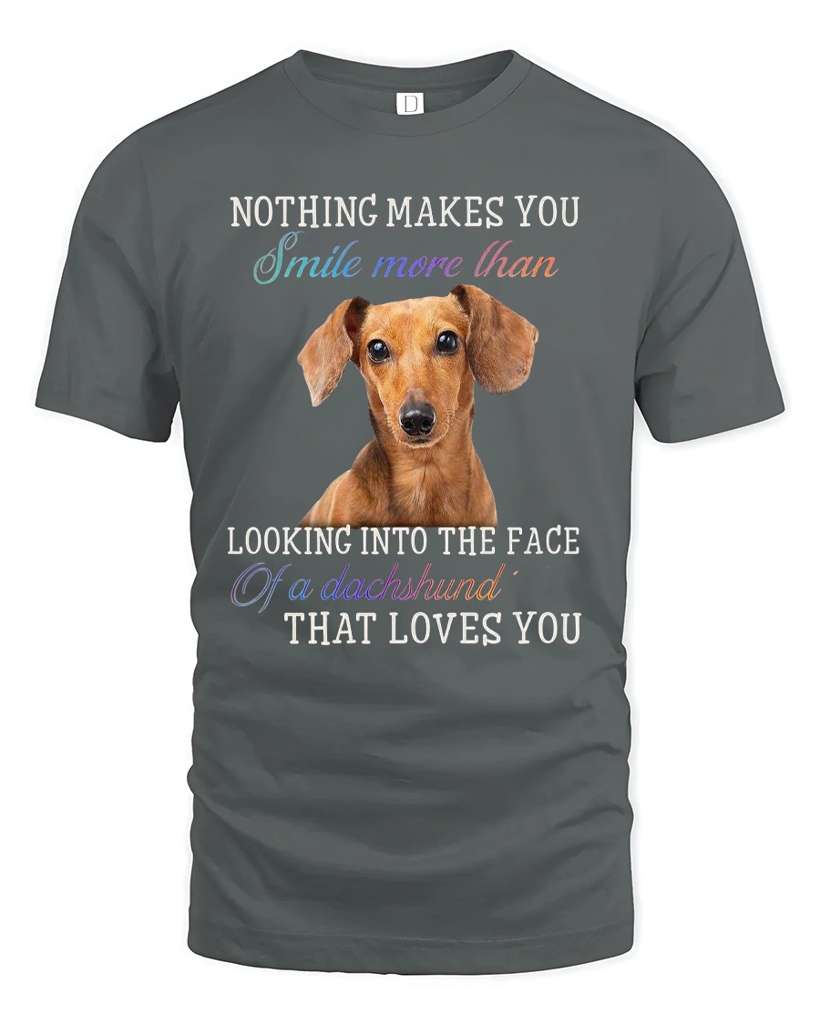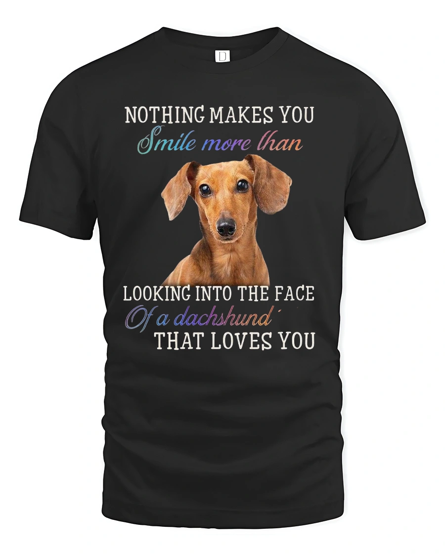 The Nothing Makes You Smile More Dachshund Love Quote Graphic T Shirt captures the warmth and joy shared between people and their dogs.