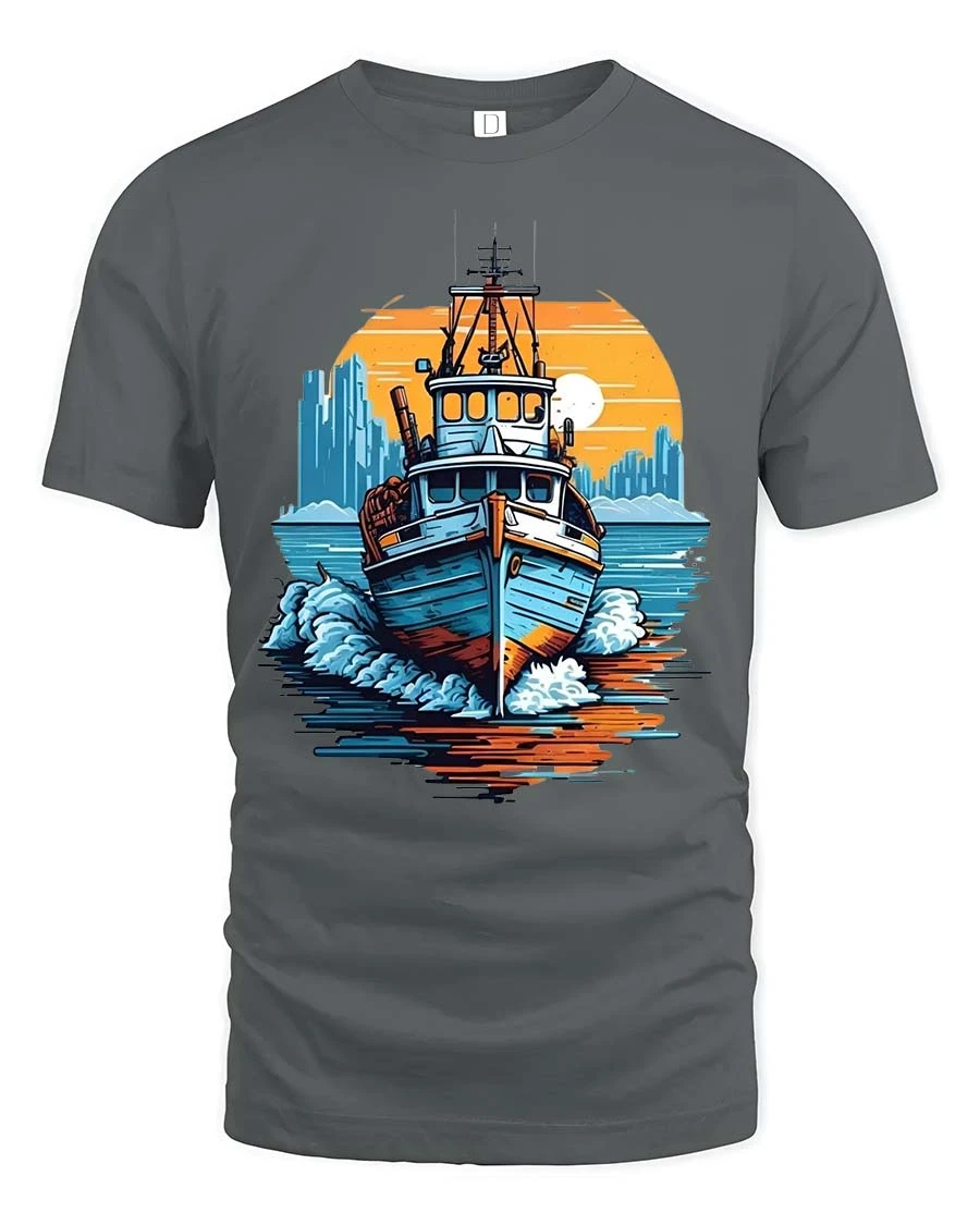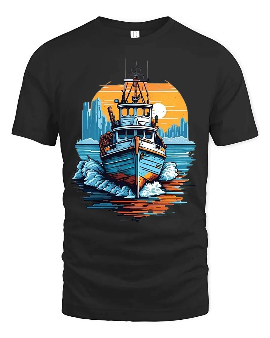 Capture the spirit of the open sea with the Ocean Fishing Boat Sunset Harbor Vintage Graphic T Shirt. This striking design features a powerful fishing boat cruising through ocean waves with a vibrant sunset glowing behind the city skyline.