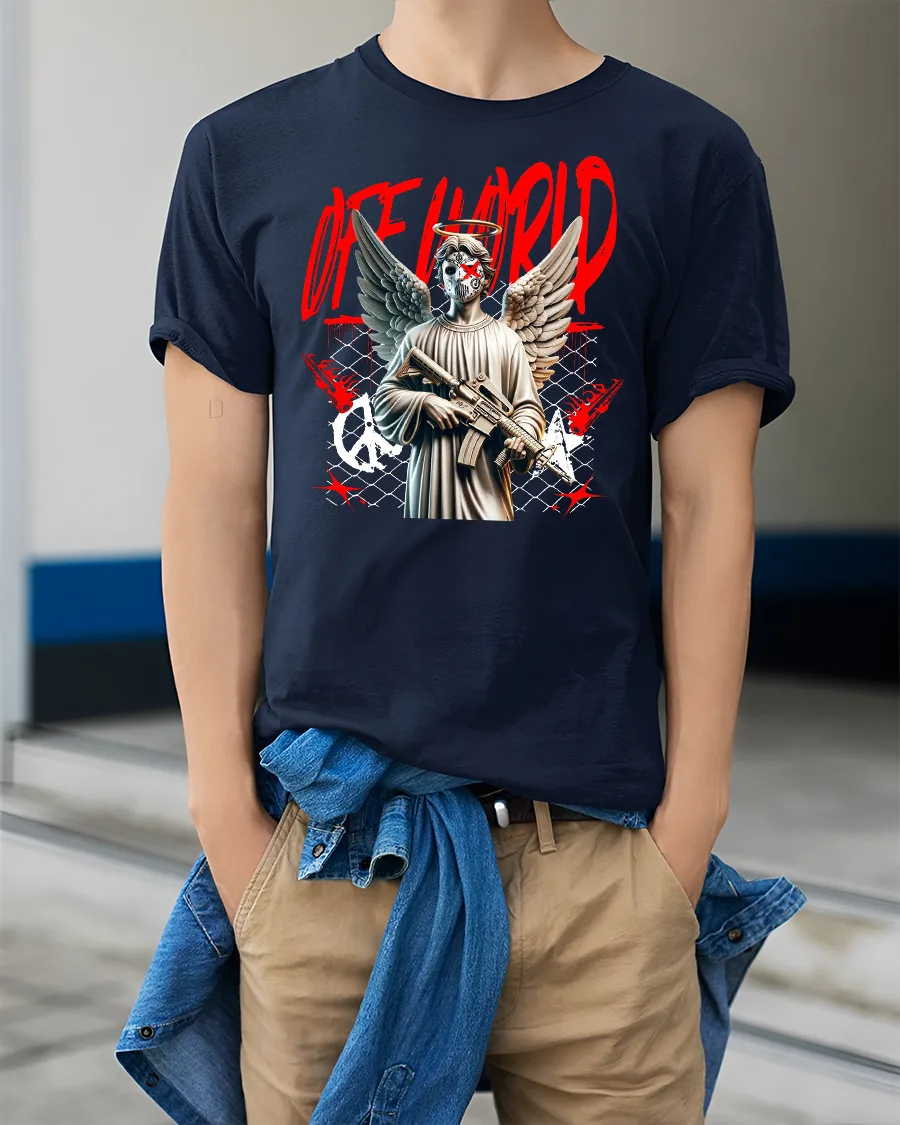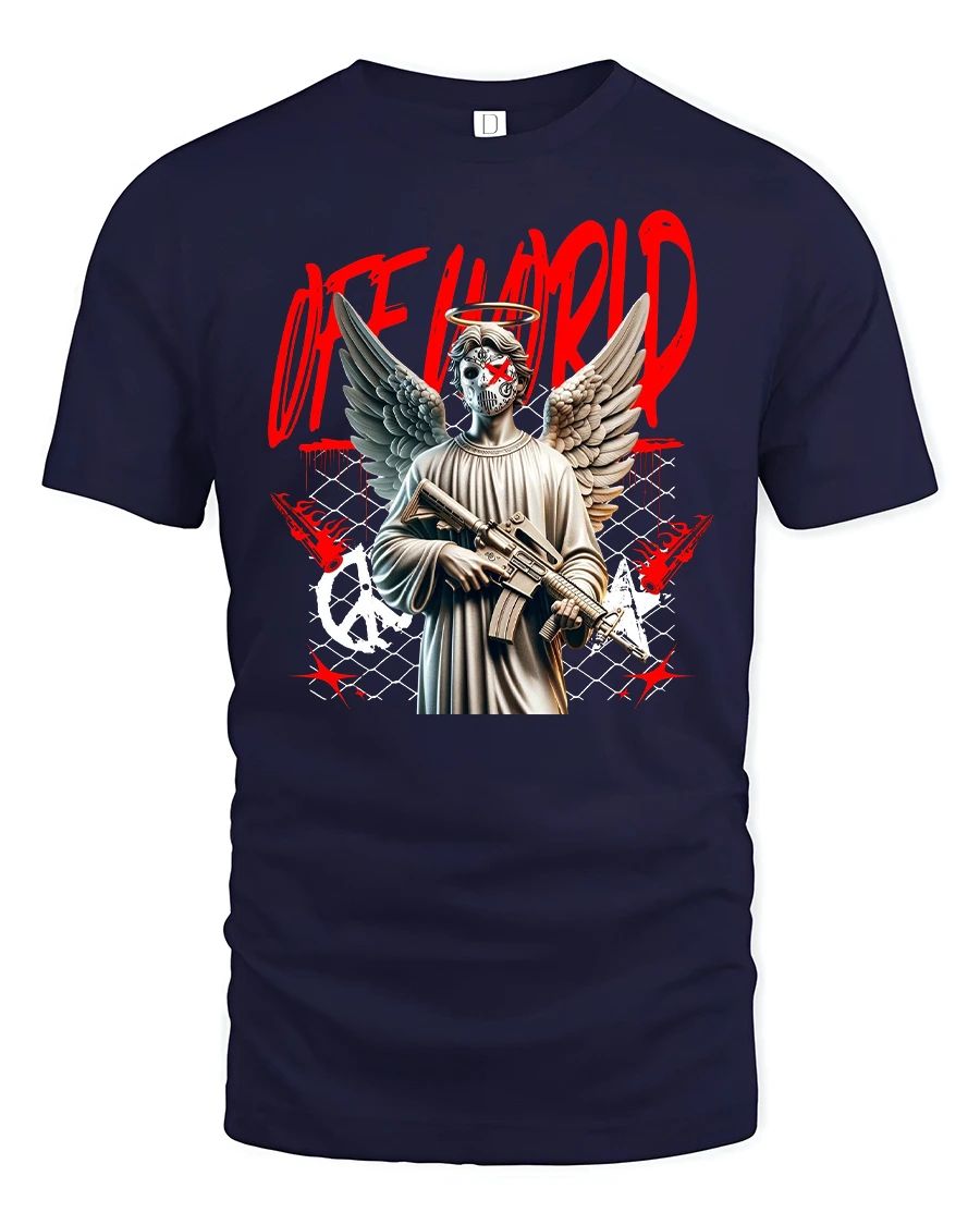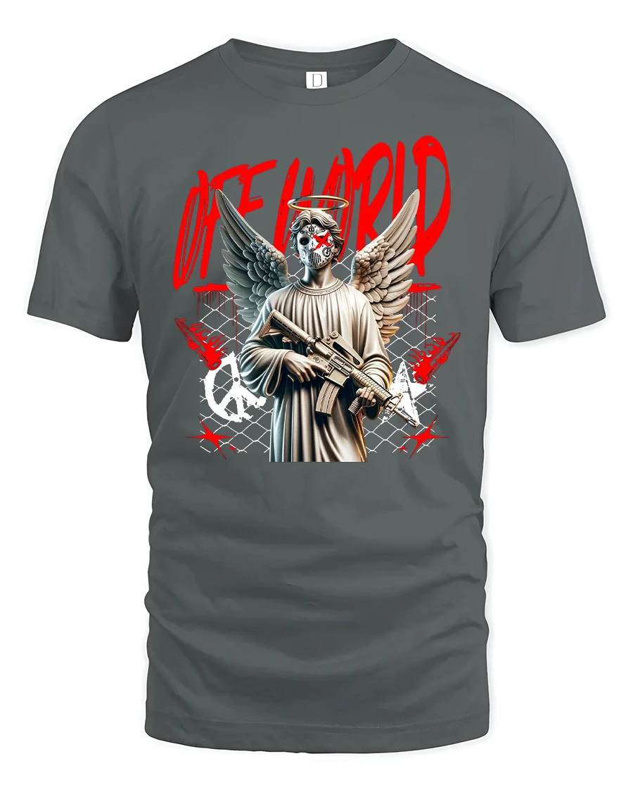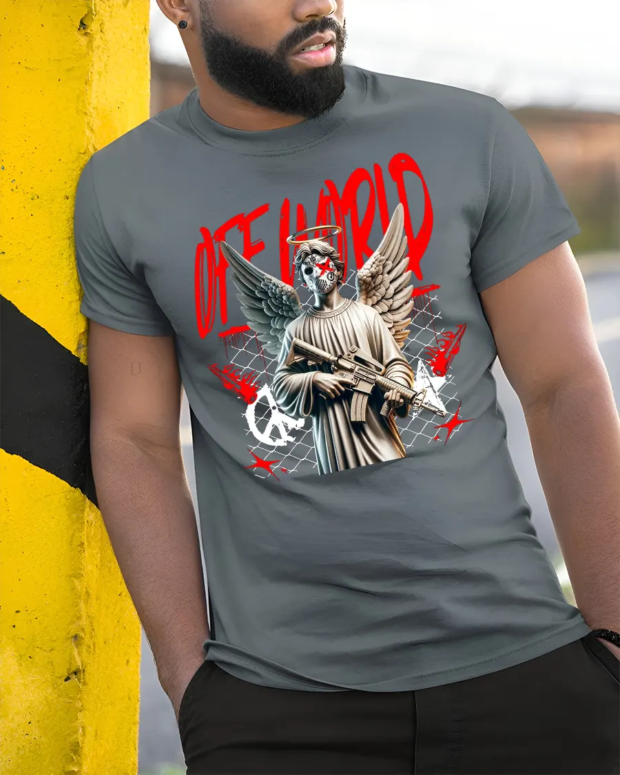The Off World Angel Streetwear Graphic T-Shirt for Men is a bold statement piece for those who live on the edge of fashion. Featuring a fierce angel statue wearing a mask and holding a rifle, this design blends divine imagery with urban rebellion, making it the perfect fit for streetwear enthusiasts.