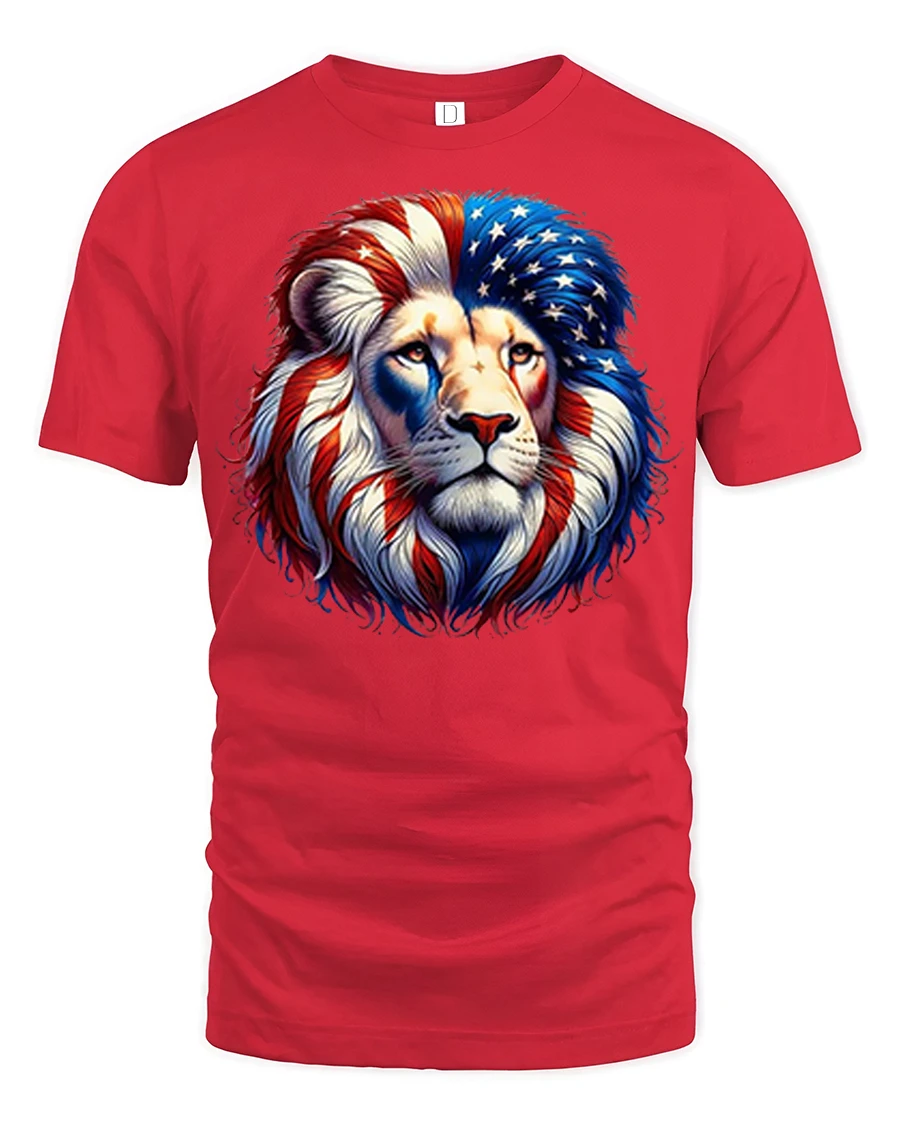 The Patriotic American Lion Graphic Tee Bold Freedom Art T Shirt showcases strength, pride, and confidence through a powerful lion portrait wrapped in bold red white and blue tones.