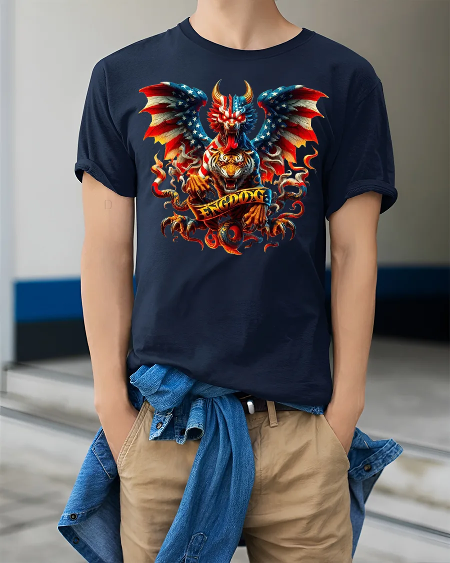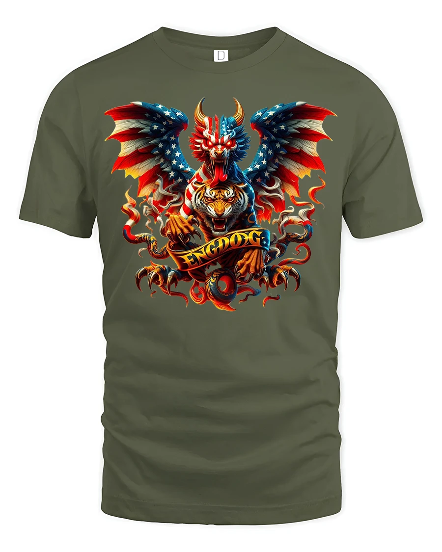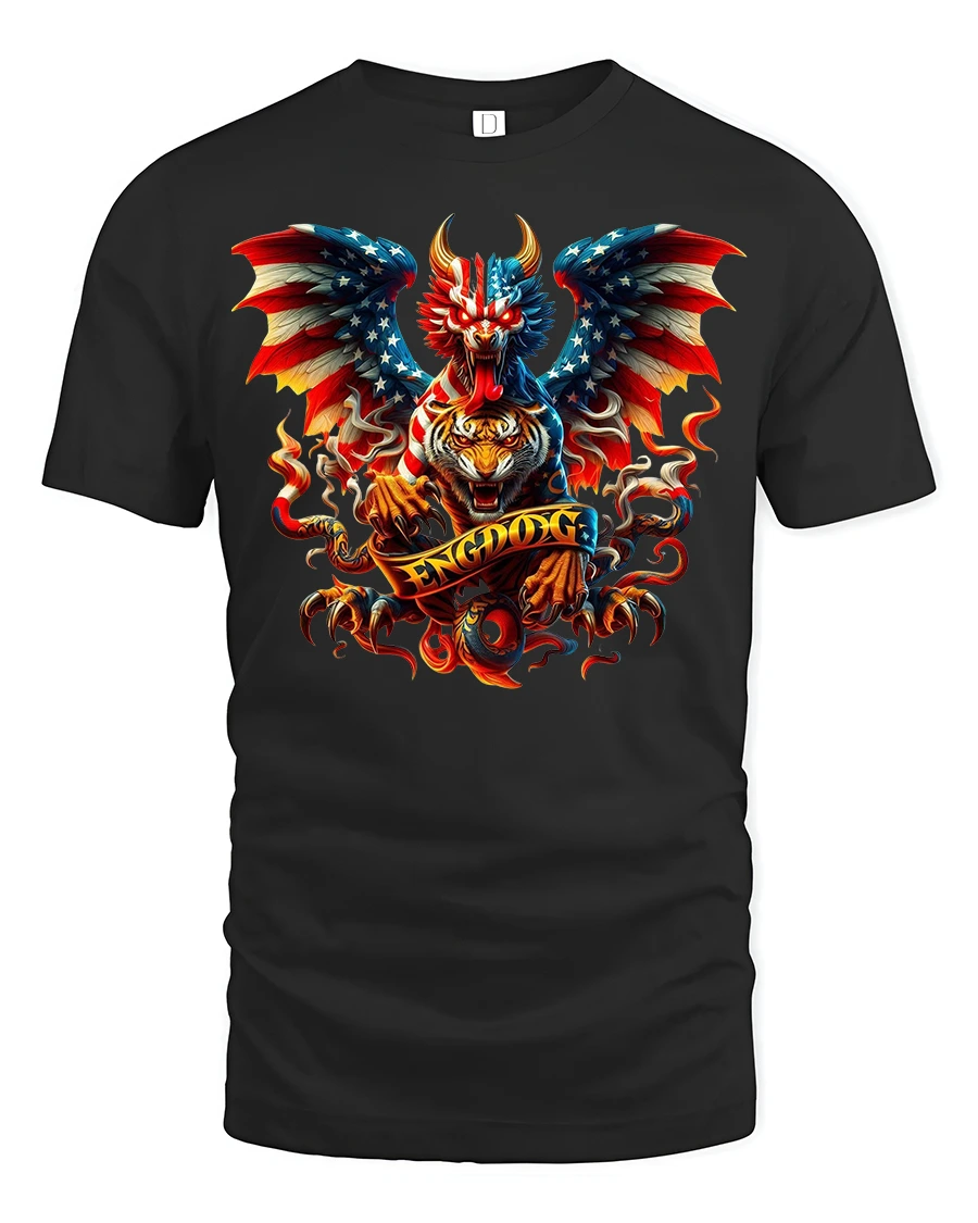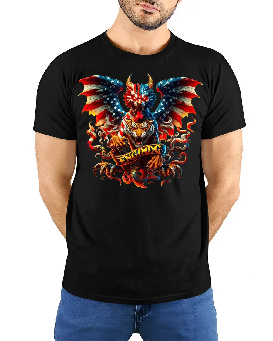 Show your fierce pride and fearless style with the Patriotic Dragon Tiger American Flag Graphic T-Shirt. This striking design combines the raw power of a roaring tiger with the mythical might of a dragon, both adorned in the bold red, white, and blue of the American flag. The dramatic wings, sharp details, and fiery accents make this shirt a true standout for anyone who loves bold, statement-making fashion.