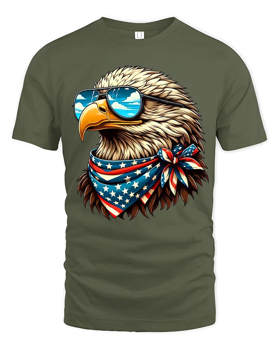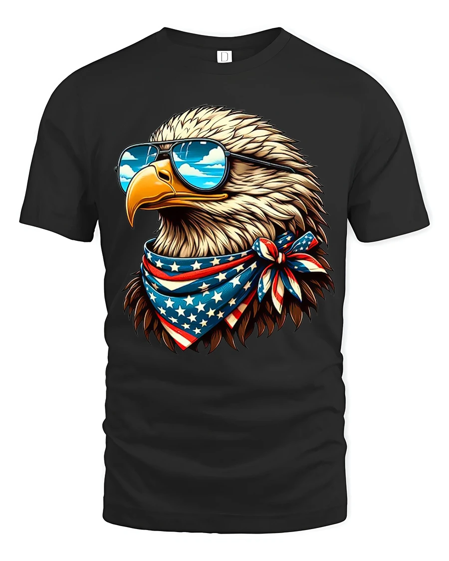 Patriotic Eagle Tee with Sunglasses and American Flag Style delivers a bold and iconic way to show off your love for the USA. The striking artwork features a proud bald eagle wearing reflective sunglasses that shine with a sky-blue glow. Wrapped around the eagle’s neck is a vibrant American flag bandana that adds a stylish and patriotic touch, making the design both eye-catching and meaningful.