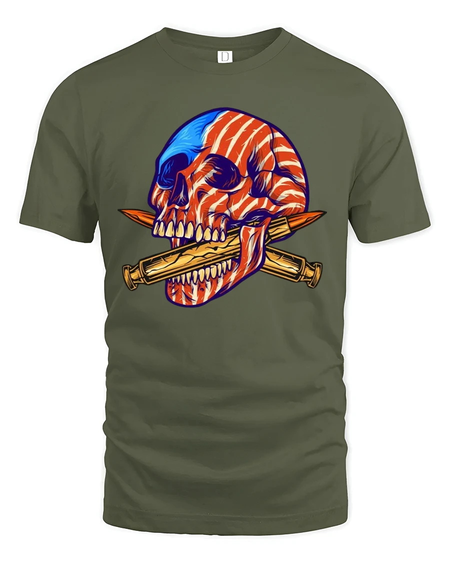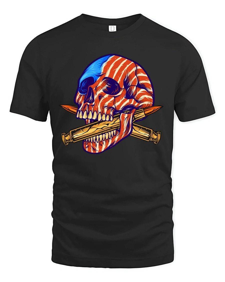 The Patriotic Skull Bullet Bite Bold Graphic T-Shirt is designed for those who love fearless fashion and bold American pride. Featuring a detailed skull wrapped in the red, white, and blue of the USA flag, this design is accentuated with two golden bullets clenched between its teeth, making it an eye-catching statement piece.