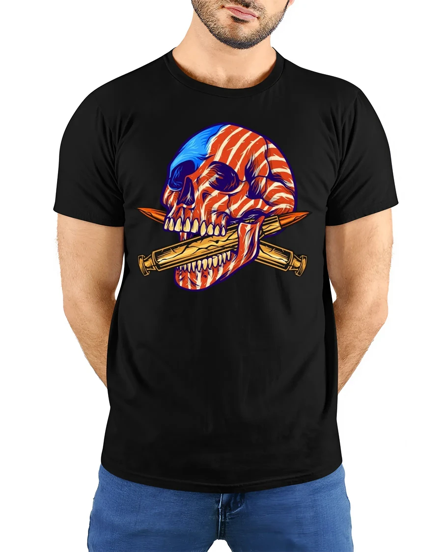 Crafted from soft, breathable cotton, the Patriotic Skull Bullet Bite Bold Graphic T-Shirt combines comfort and durability. The vivid print stands out and stays sharp, even after repeated washes, making it perfect for casual wear, streetwear, biker style, or anyone who enjoys edgy graphic fashion.