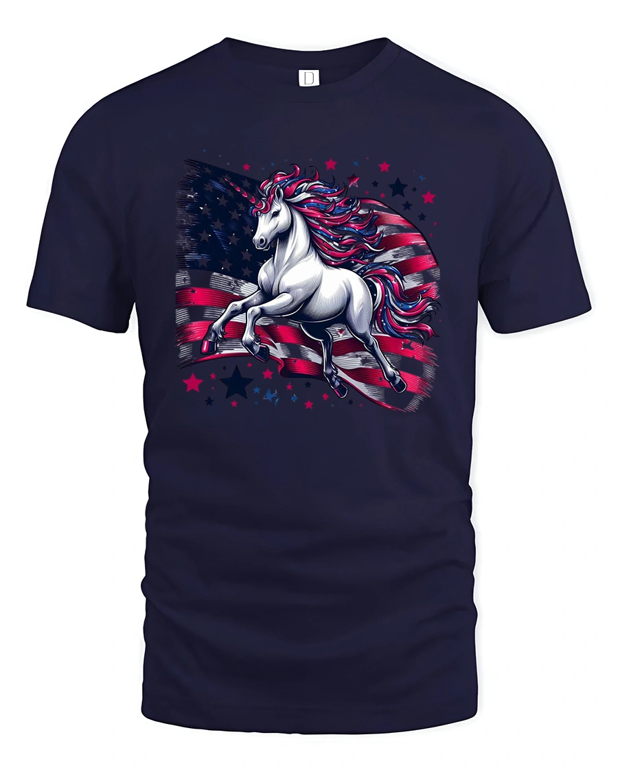 This bold design features a majestic unicorn galloping proudly in front of the U.S. flag with red, white, and blue stars swirling around.