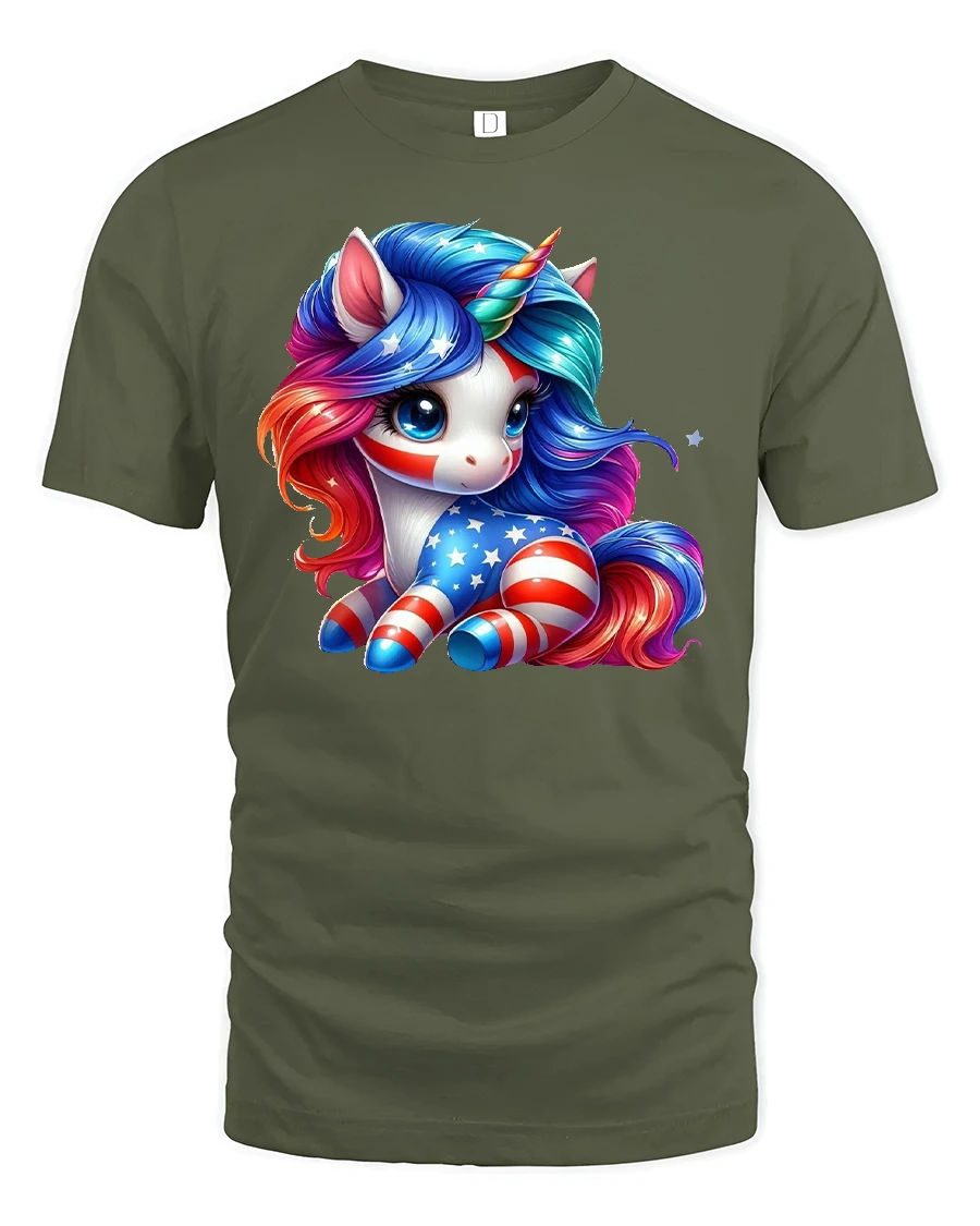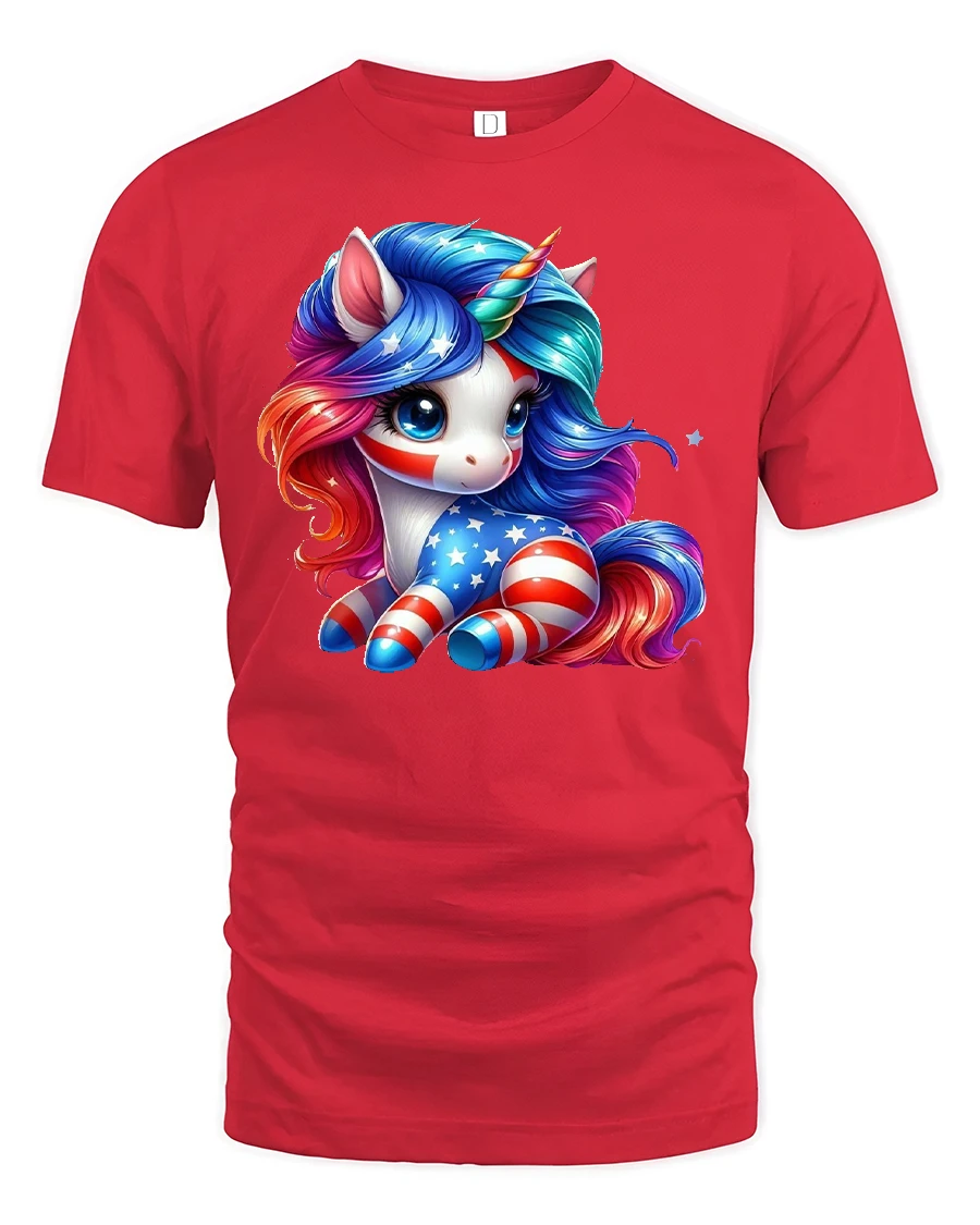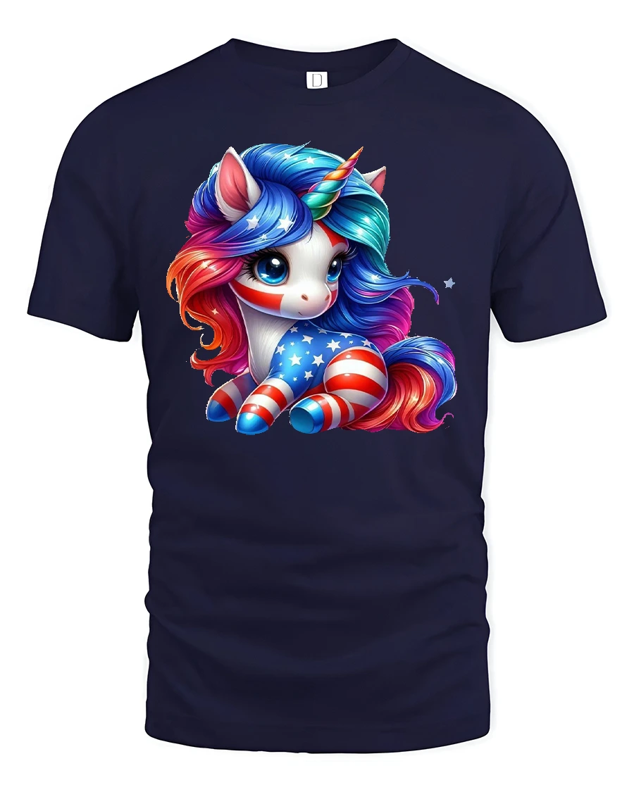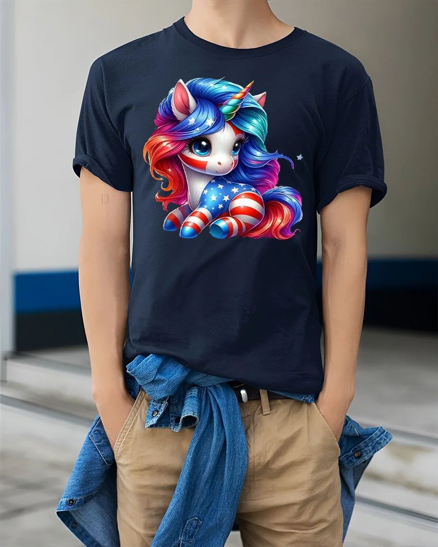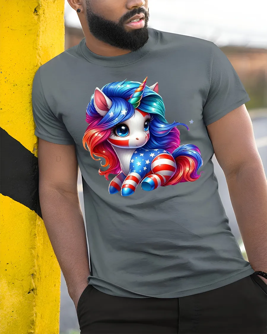The Patriotic Unicorn USA Flag Graphic Print T-Shirt brings a magical twist to American pride. Featuring an adorable unicorn decorated in red, white, and blue with bold stars and stripes, this shirt is perfect for celebrating the USA with a fun and fantasy-inspired design. The colorful artwork blends the beauty of a mythical unicorn with the powerful symbolism of the American flag, making it a truly unique piece.