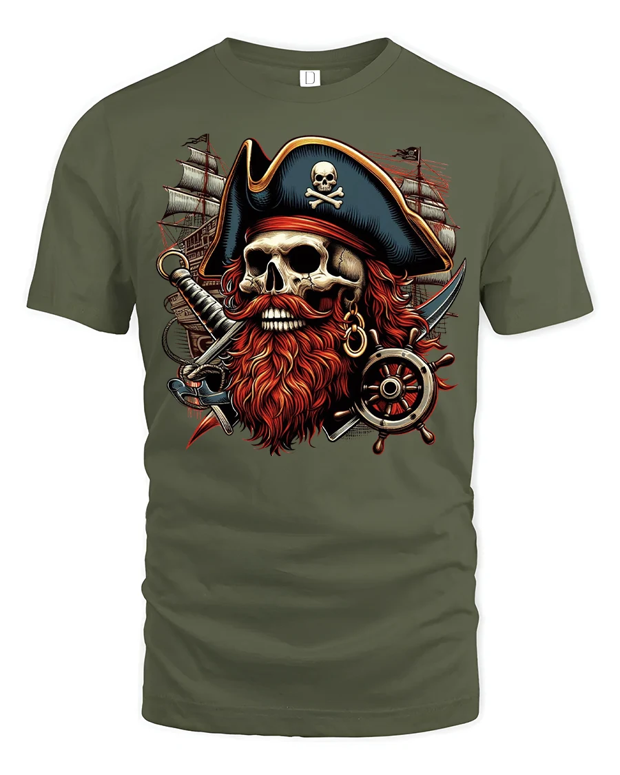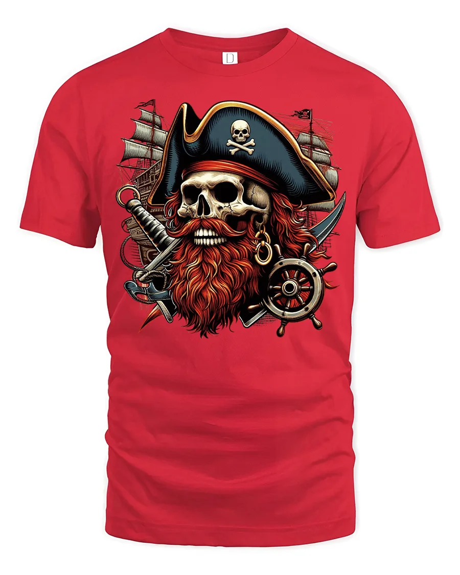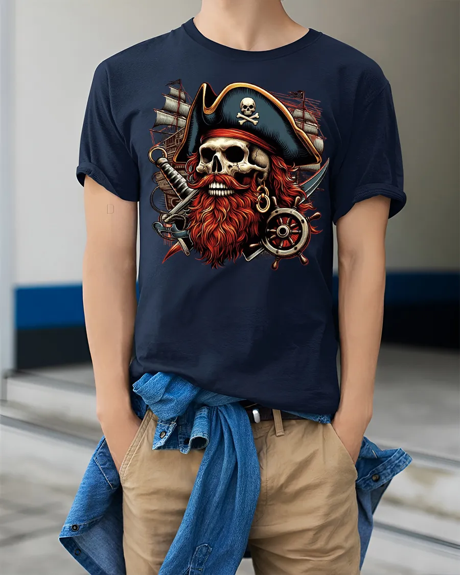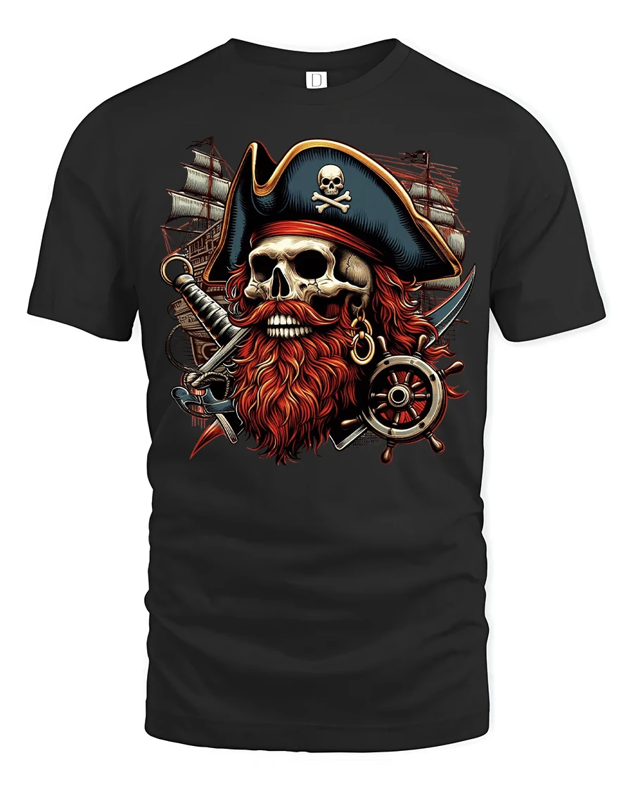 The Pirate Skull Captain Beard Graphic Adventure T-shirt is perfect for fans of high seas adventure, gothic art, and bold pirate fashion. Featuring a fierce pirate skull with a fiery red beard, crossed swords, and a ship’s helm, this design captures the spirit of fearless ocean raiders. It’s a striking choice for anyone who loves pirate lore, nautical themes, or fantasy-inspired apparel.