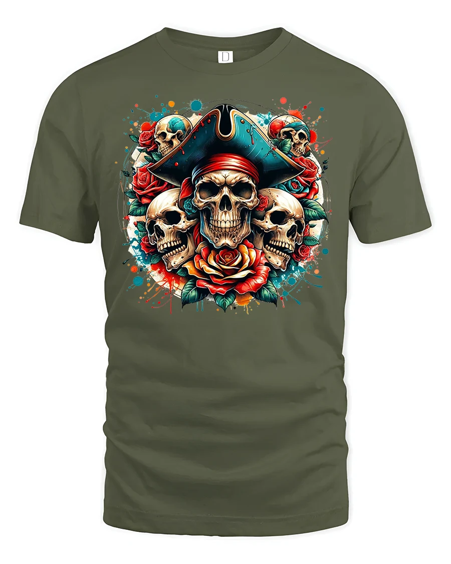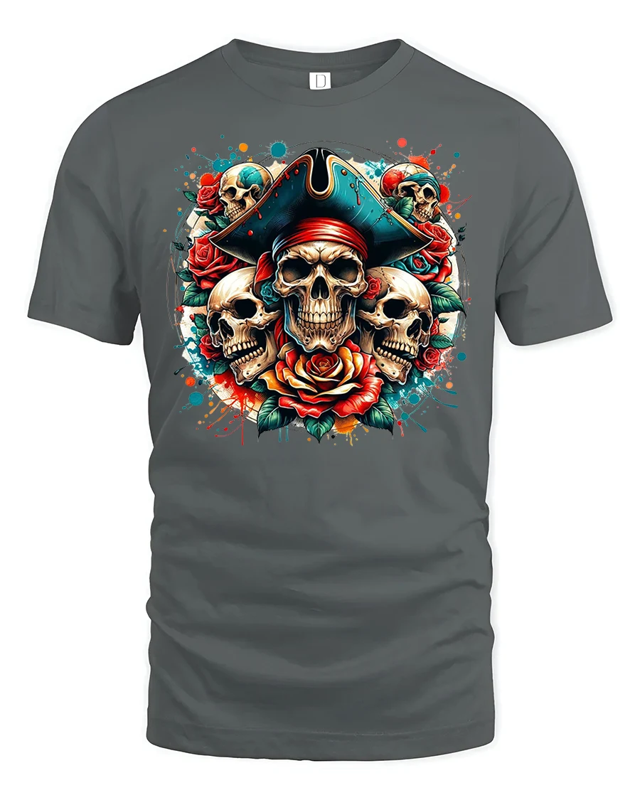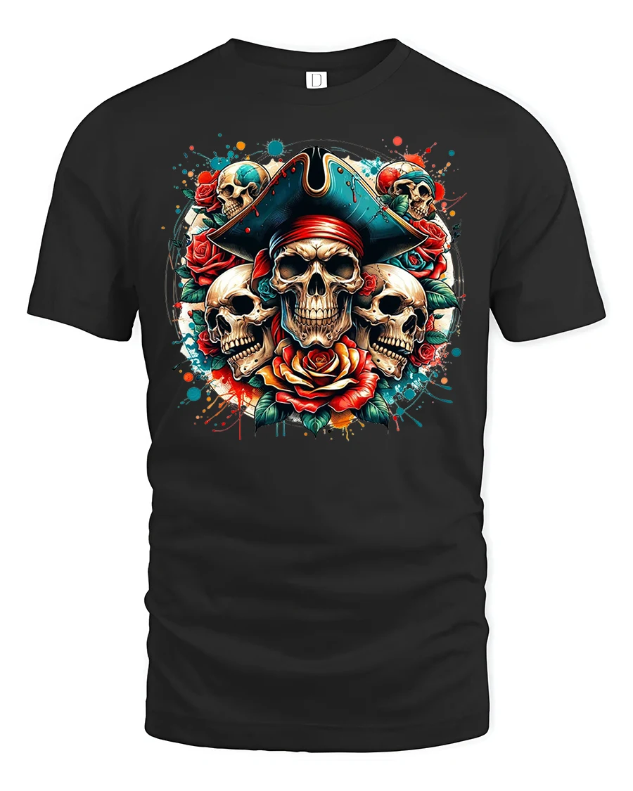 The Pirate Skull Roses Tee with Gothic Tattoo Art Print is a bold and striking design for those who love edgy and alternative fashion. Featuring a pirate captain skull surrounded by detailed roses and gothic-style splashes of color, this t-shirt blends dark elegance with rebellious charm. It’s the perfect choice for fans of pirate culture, gothic art, and tattoo-inspired fashion.