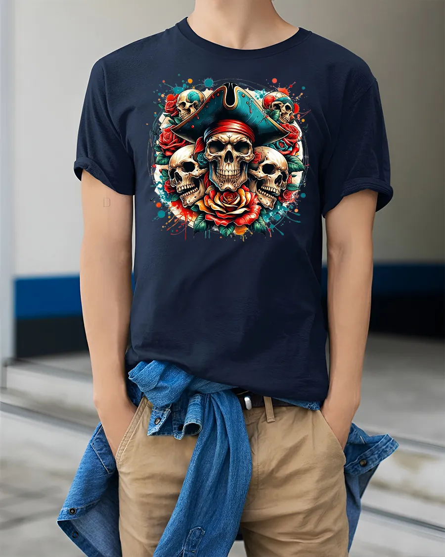 This skull and roses t-shirt makes an excellent gift for gothic fashion lovers, tattoo enthusiasts, or anyone who enjoys pirate-inspired clothing. Wear it casually or style it for events, concerts, or Halloween. Show off your fearless personality with this powerful pirate skull and roses tee.