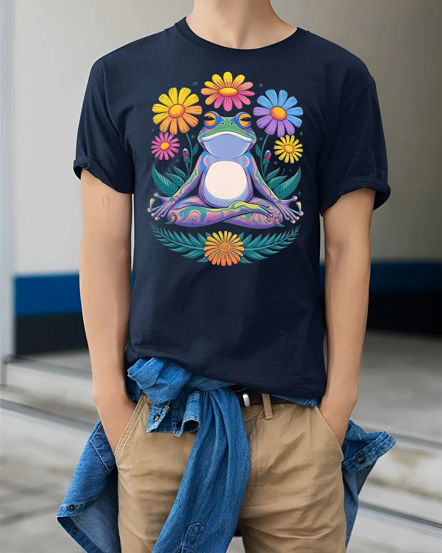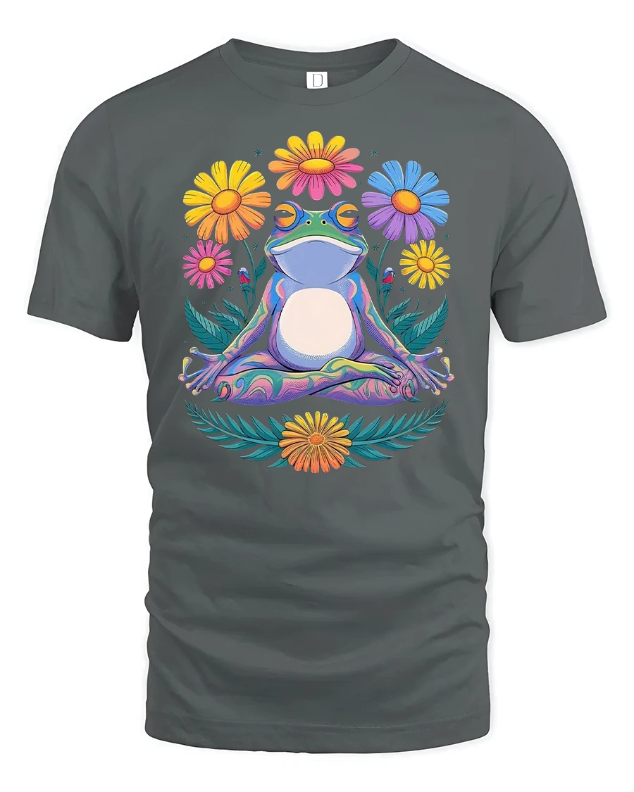 Psychedelic Meditating Frog Colorful Flower Graphic TShirt Tee brings a joyful and uplifting vibe with its bright colors and peaceful design. The artwork features a serene frog sitting in a meditation pose surrounded by blooming flowers and swirling leaves, creating a playful yet calming atmosphere. Its vibrant hues and whimsical expression make it a standout piece that draws smiles and positive energy.