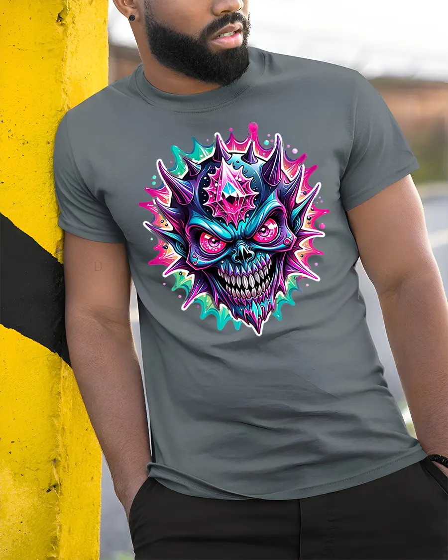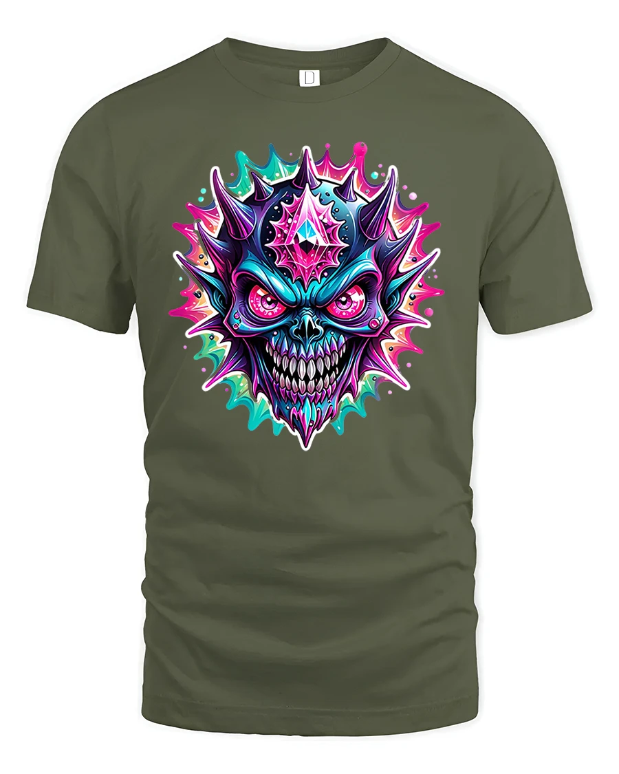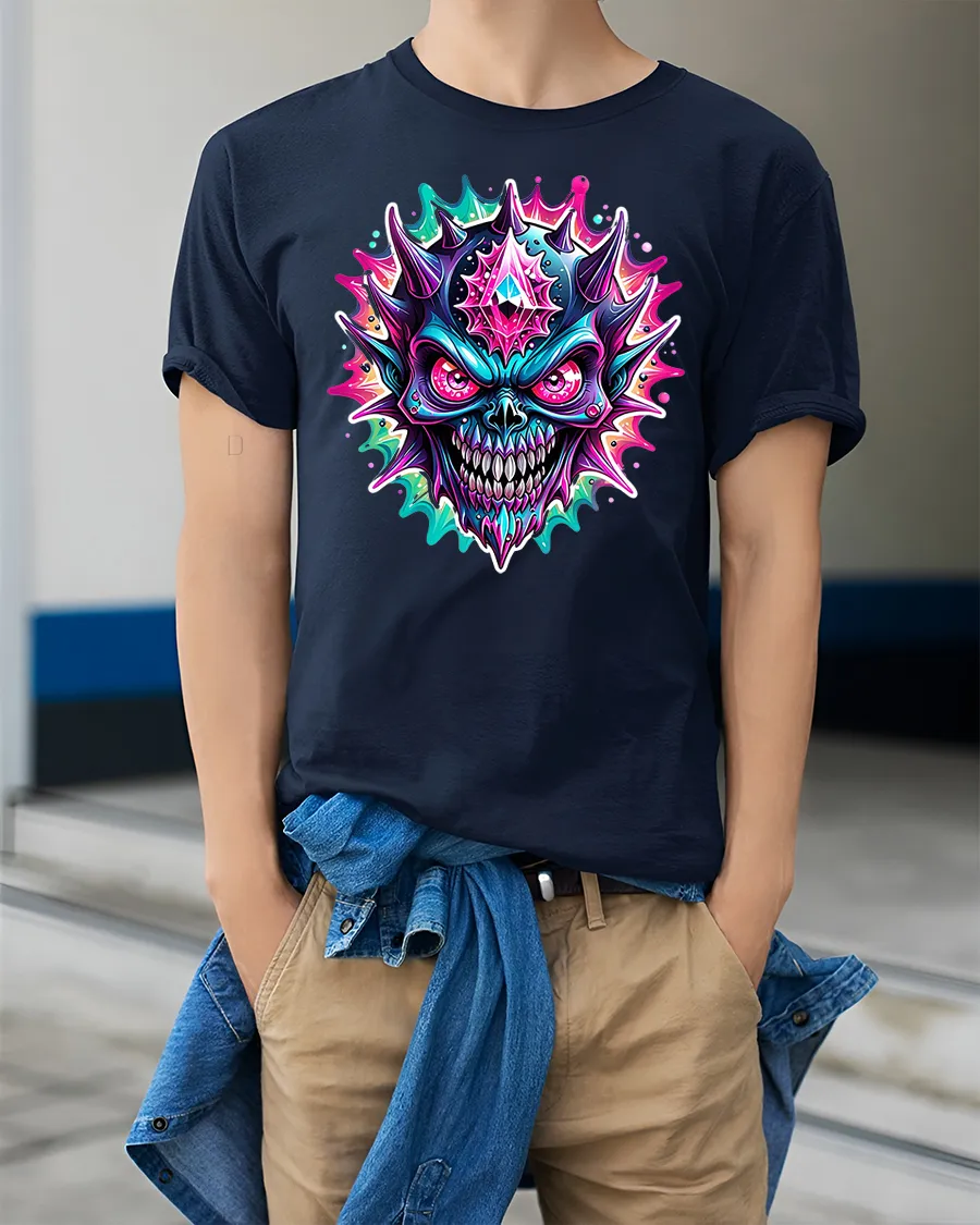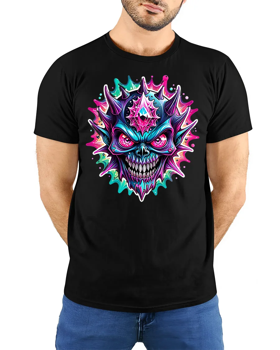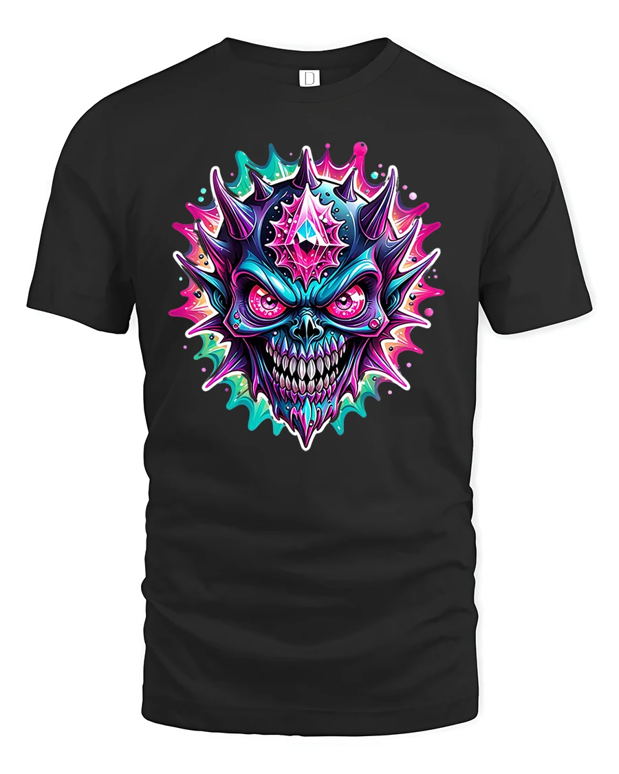 Featuring a fierce neon skull surrounded by colorful spikes and glowing effects, this shirt combines horror art with electric energy. The detailed 3D-style print captures the perfect balance between creepy and cool, making it a favorite for gothic, metal, and festival fashion lovers.